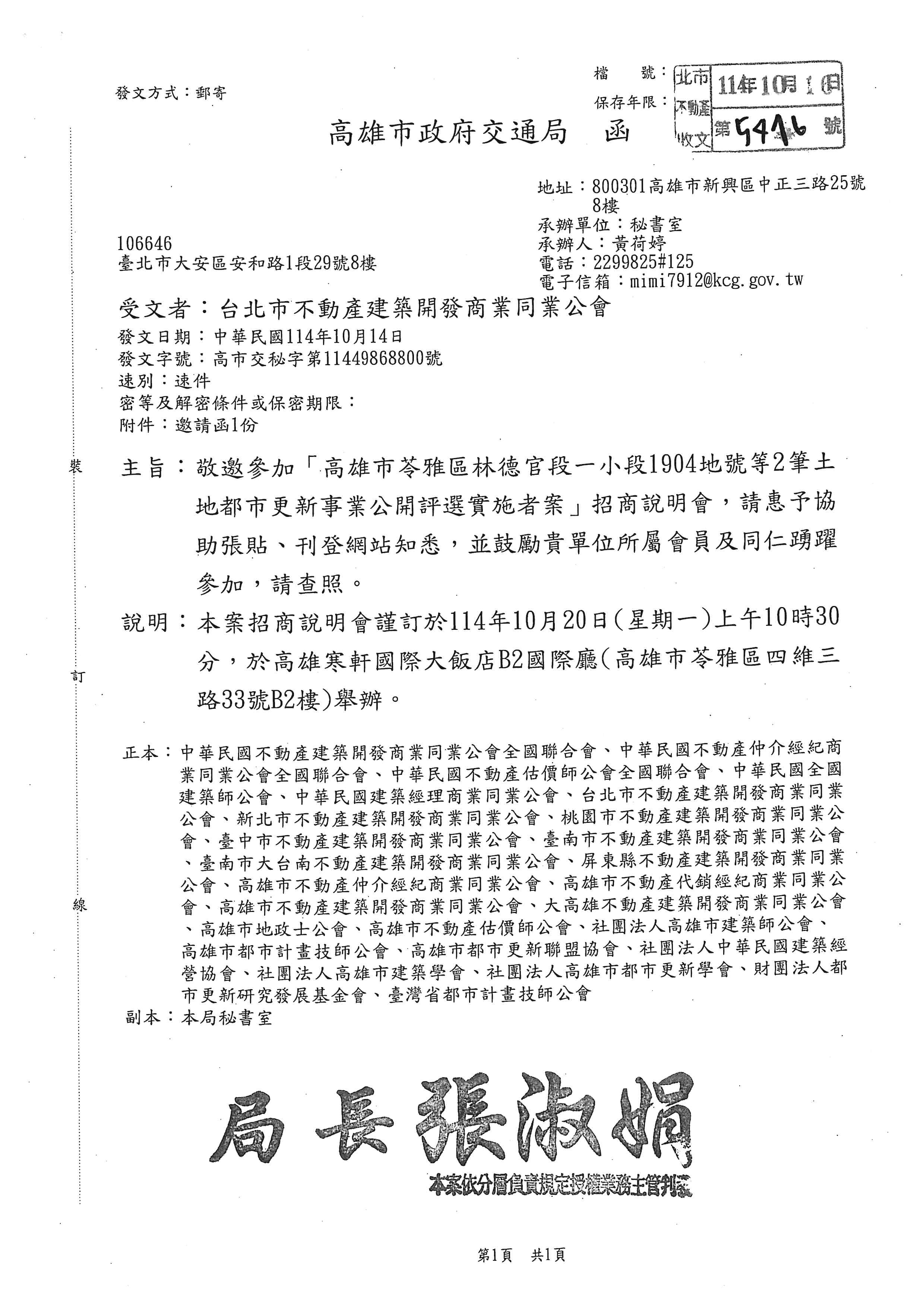高雄市政府交通局敬邀參加「高雄市苓雅區林德官段一小段1904地號等2筆土地都市更新事業公開評選實施者案」招商說明會,歡迎會員踴躍參加