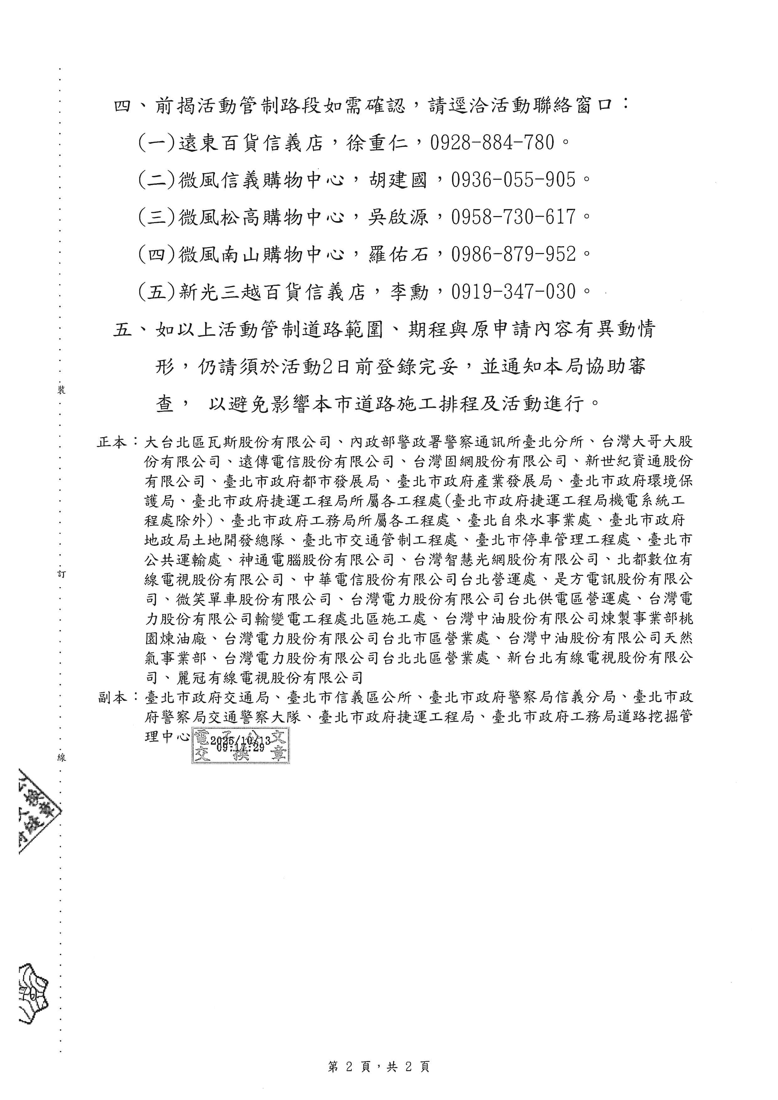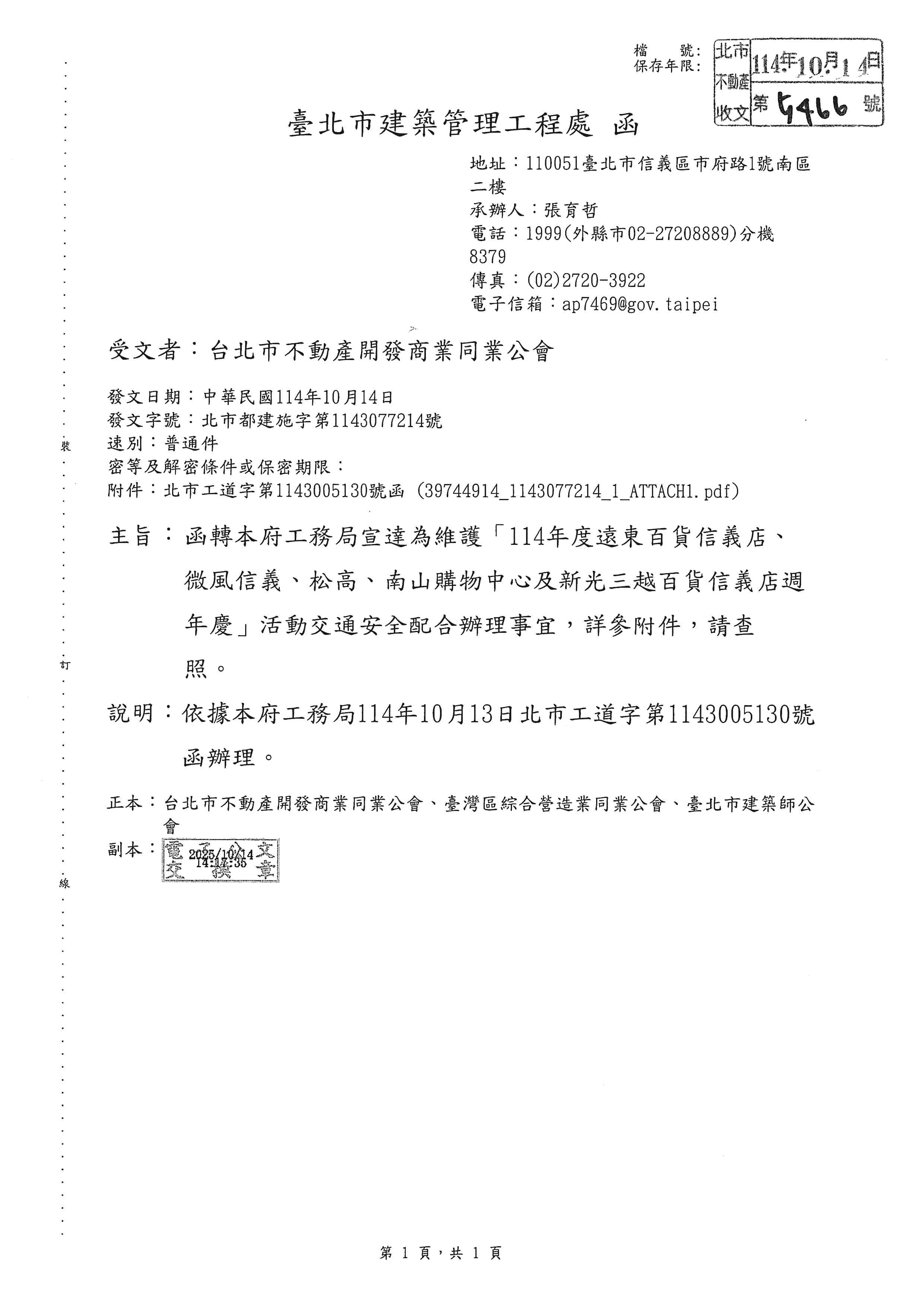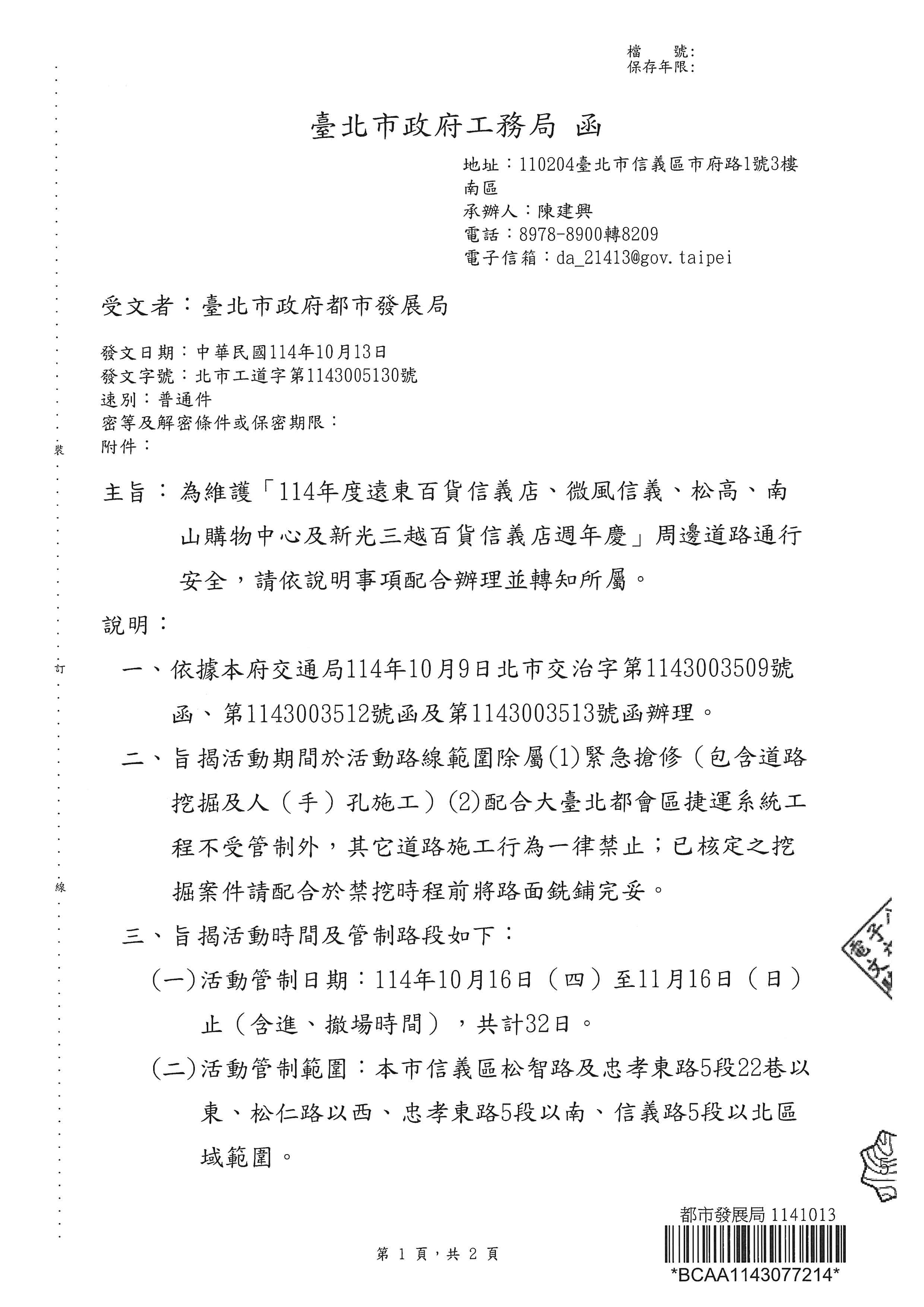臺北市建築管理工程處函轉臺北巿政府工務局宣達為維護「114年度遠東百貨信義店、微風信義、松高、南山購物中心及新光三越百貨信義店週年慶」活動交通安全配合辦理事宜 公告時間:2025 年 10 月 20 日 文件下載