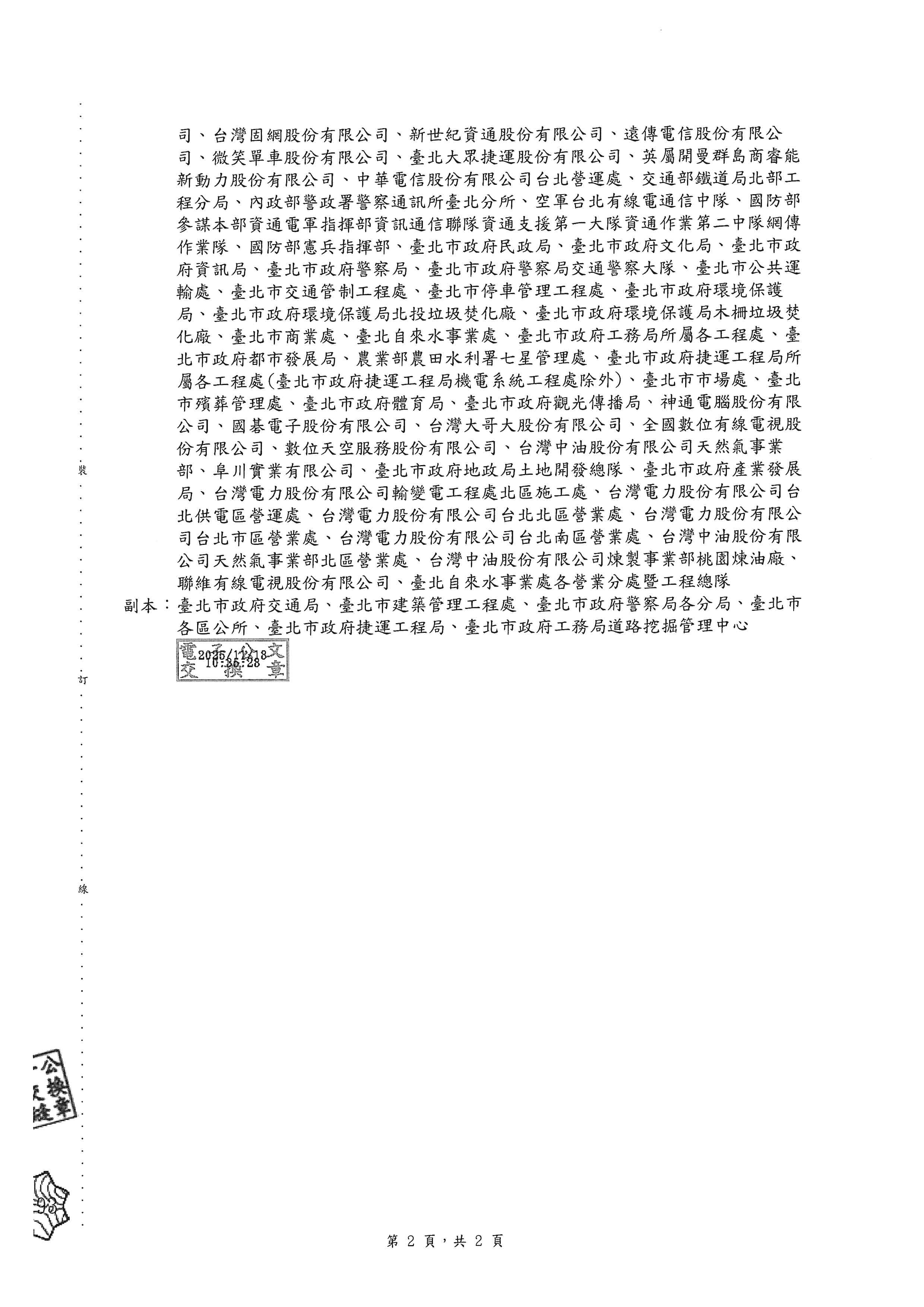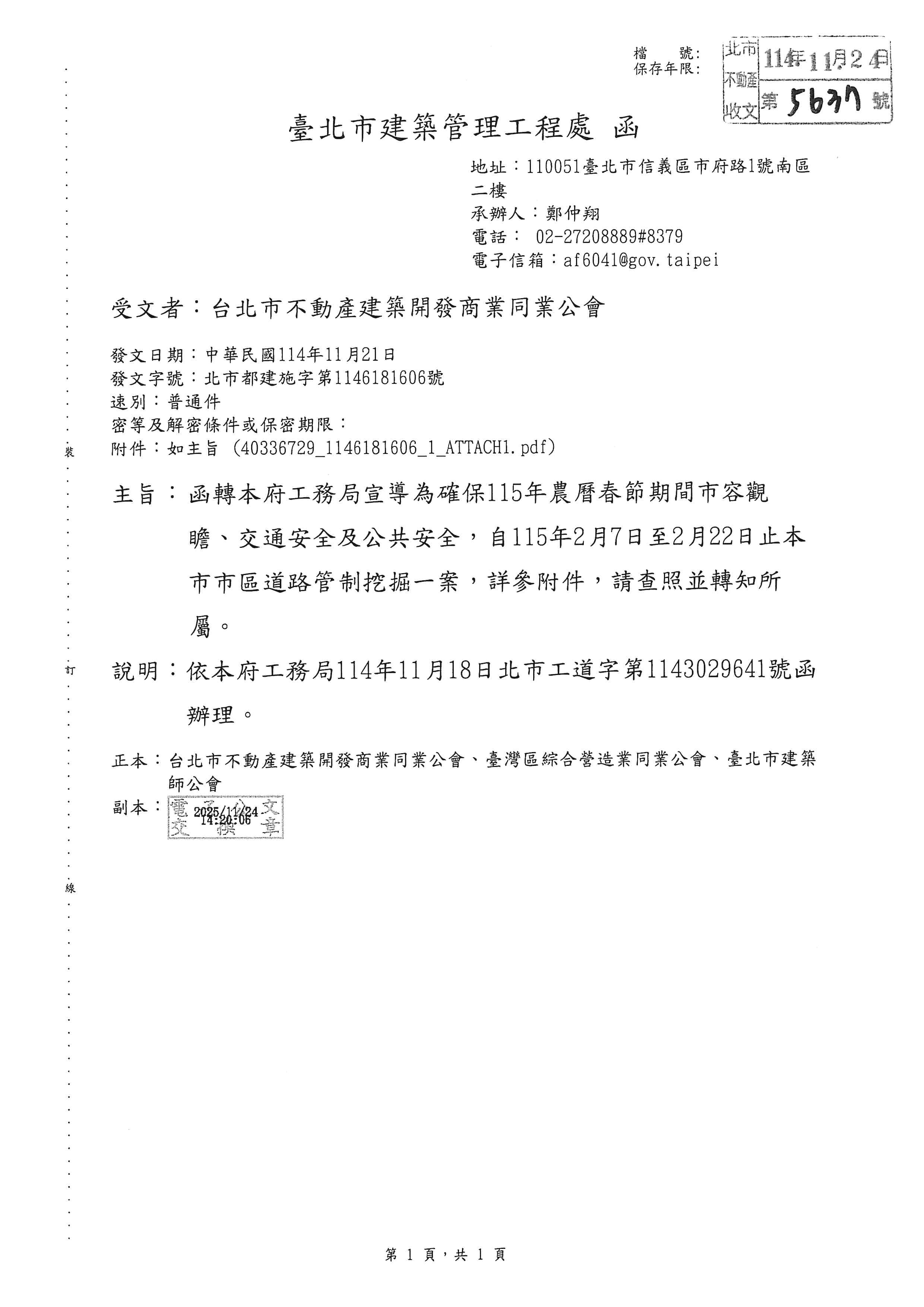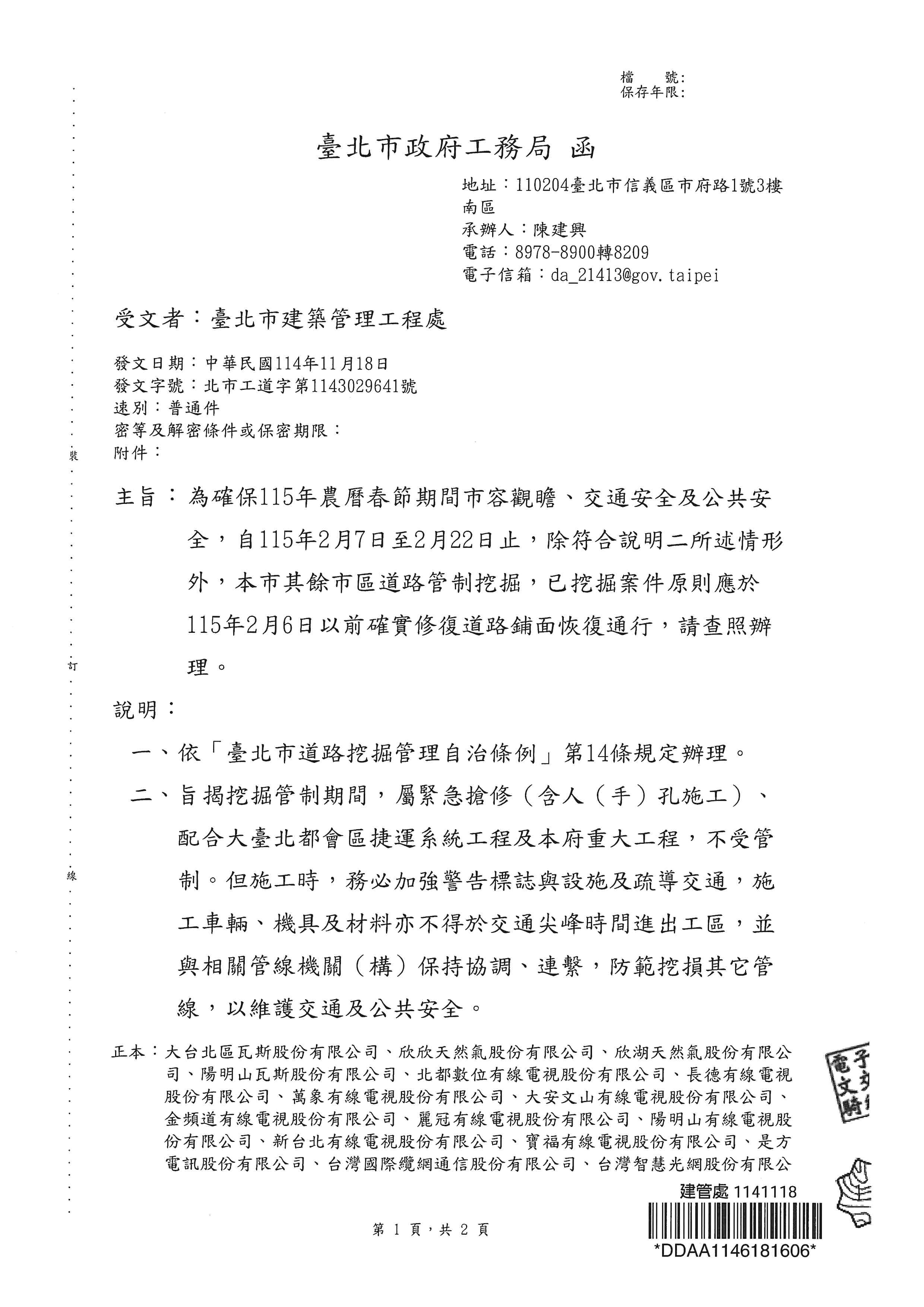 臺北市建築管理工程處函轉臺北巿政府工務局宣導為確保115年農曆春節期間市容觀 瞻、交通安全及公共安全,自115年2月7日至2月22日止本市市區道路管制挖掘一案,轉知會員配合辦理 公告時間:2025 年 12 月 03 日