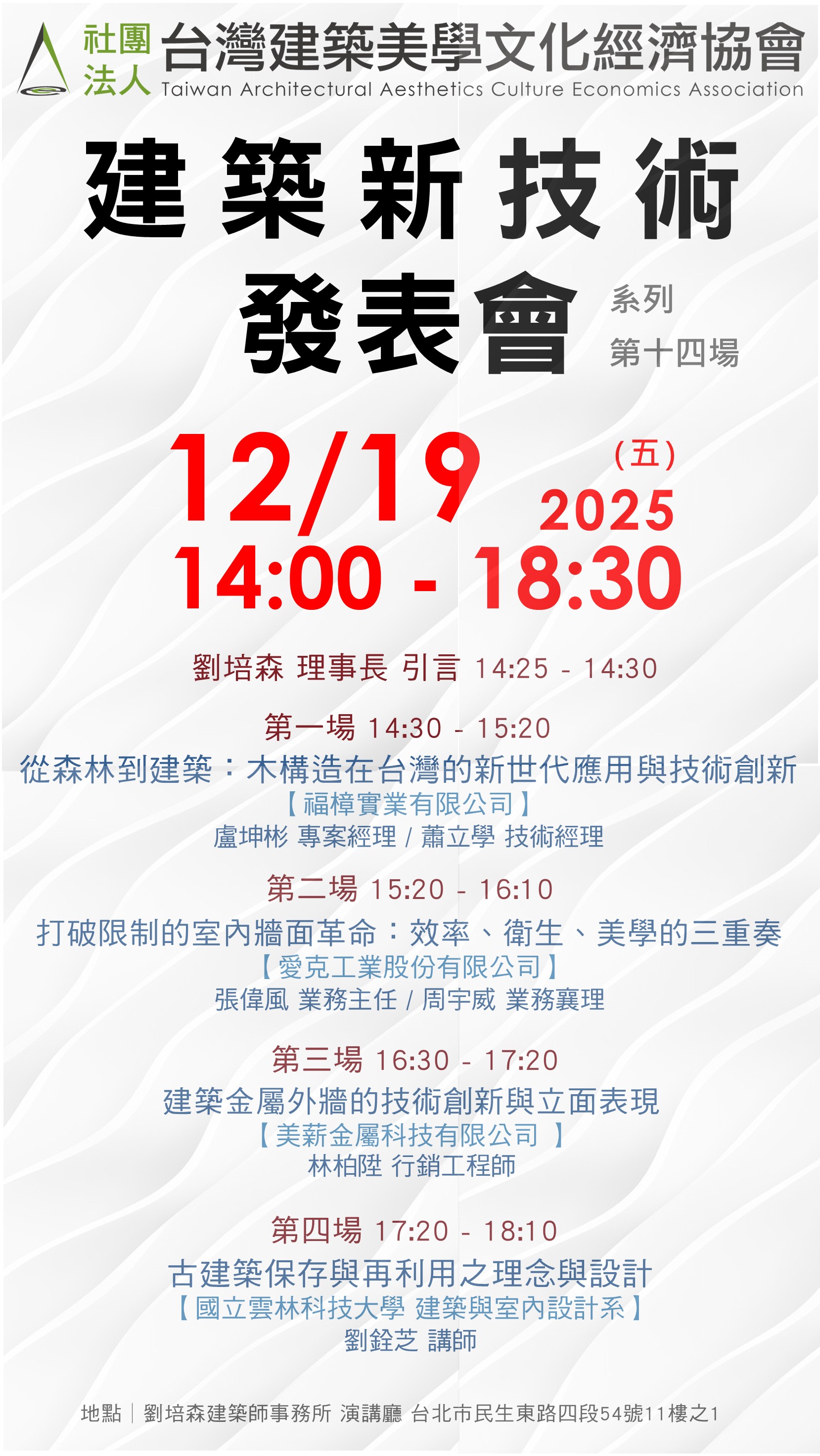 社團法人台灣建築美學文化經濟協會舉辦【建築新技術發表會】系列第十四場即將於 12/19(五) 14:00-18:30 開辦。