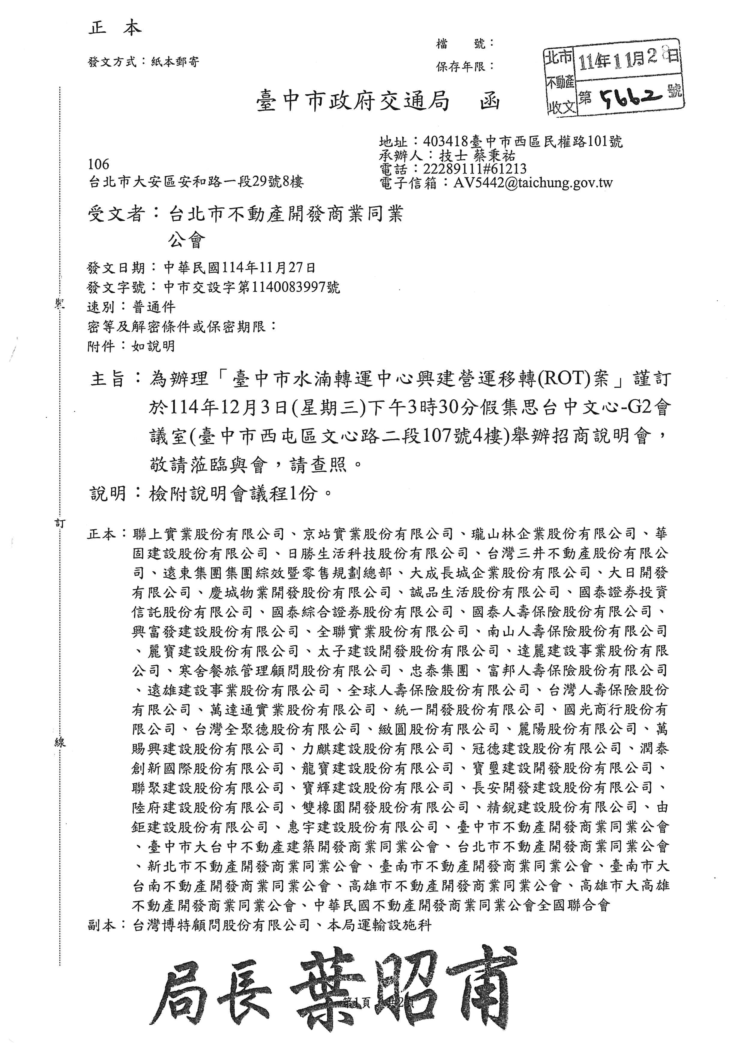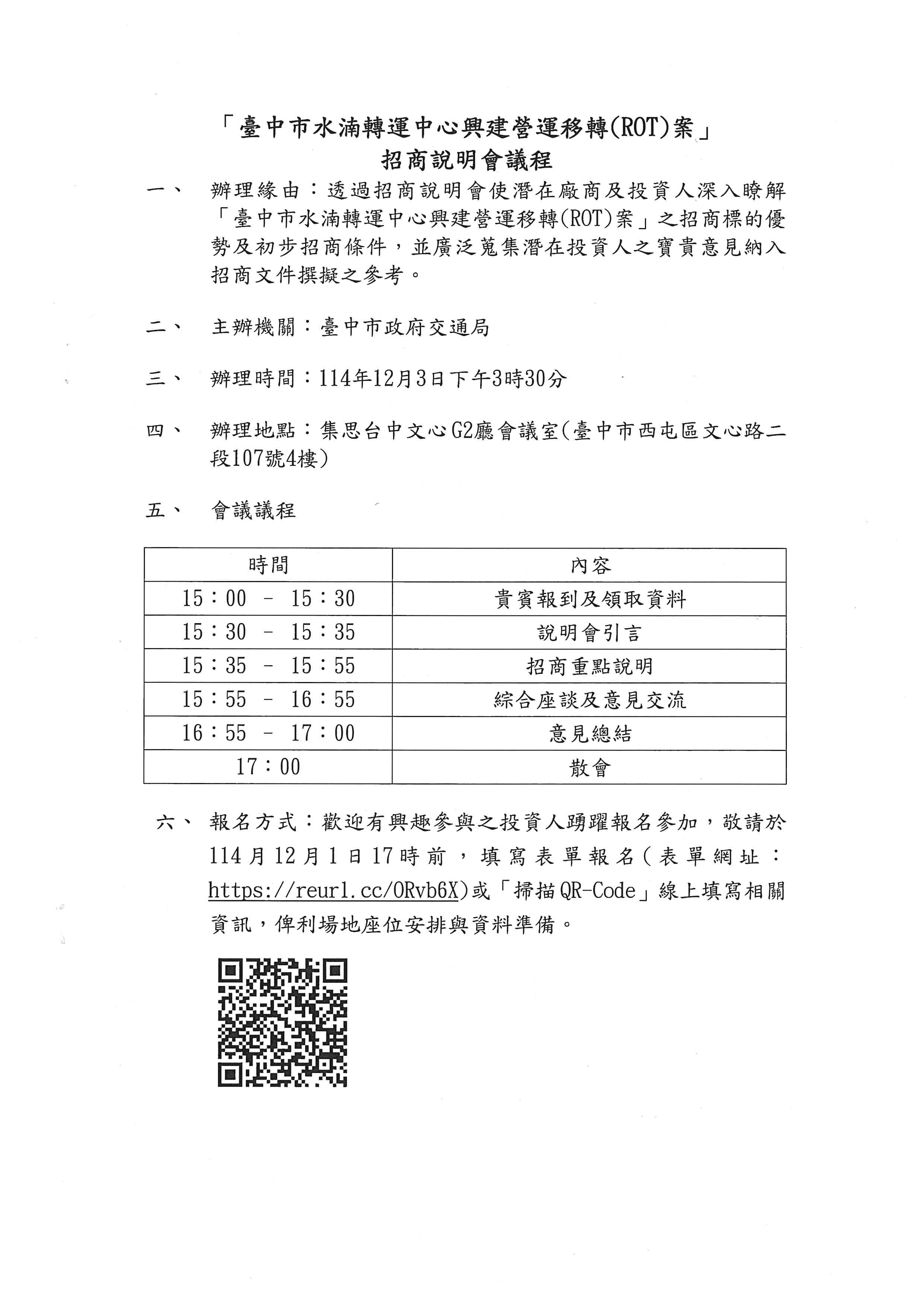 臺中市政府交通局辦理「臺中市水浦轉運中心興建營運移轉(ROT)案」謹訂於114年12月3日(星期三)下午3時30分假集思台中文心-G2會議室(臺中市西屯區文心路二段107號4樓)舉辦招商說明會,敬請蒞臨與會 公告時間:2025 年 12 月 03 日