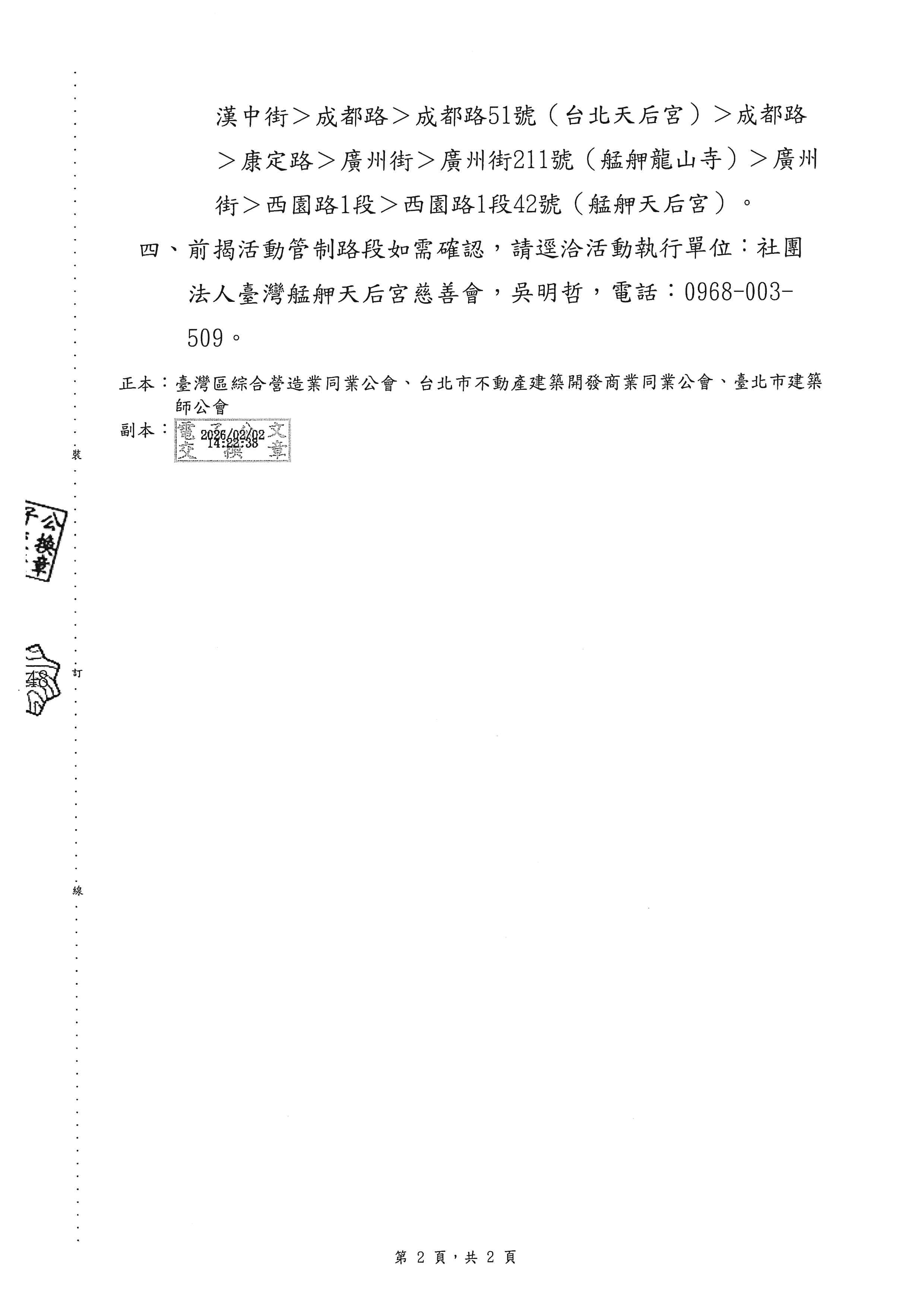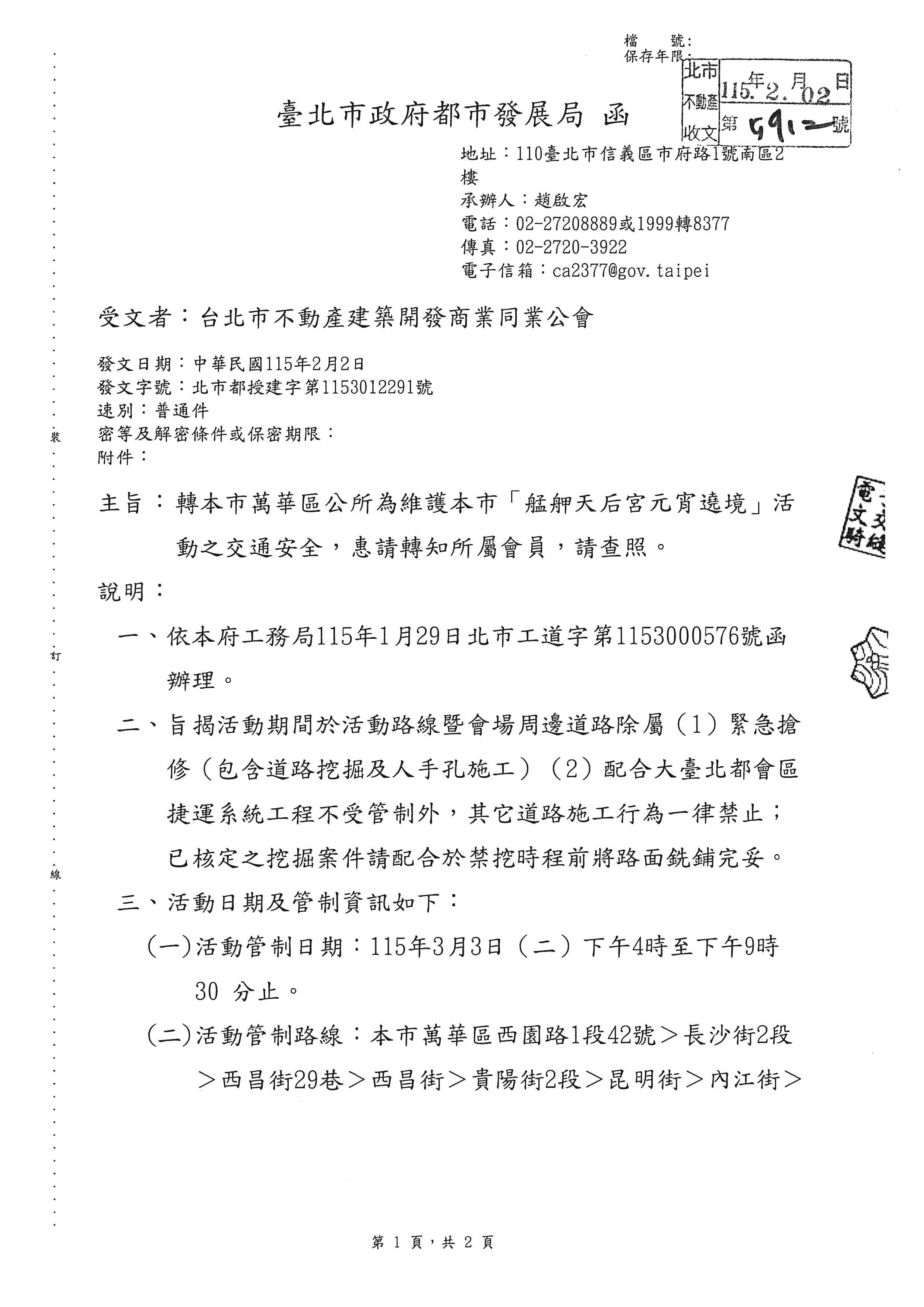 臺北市政府都市發展局轉臺北巿萬華區公所為維護本市「臨舶天后宮元宵遶境」活 動之交通安全,轉知會員配合辦理