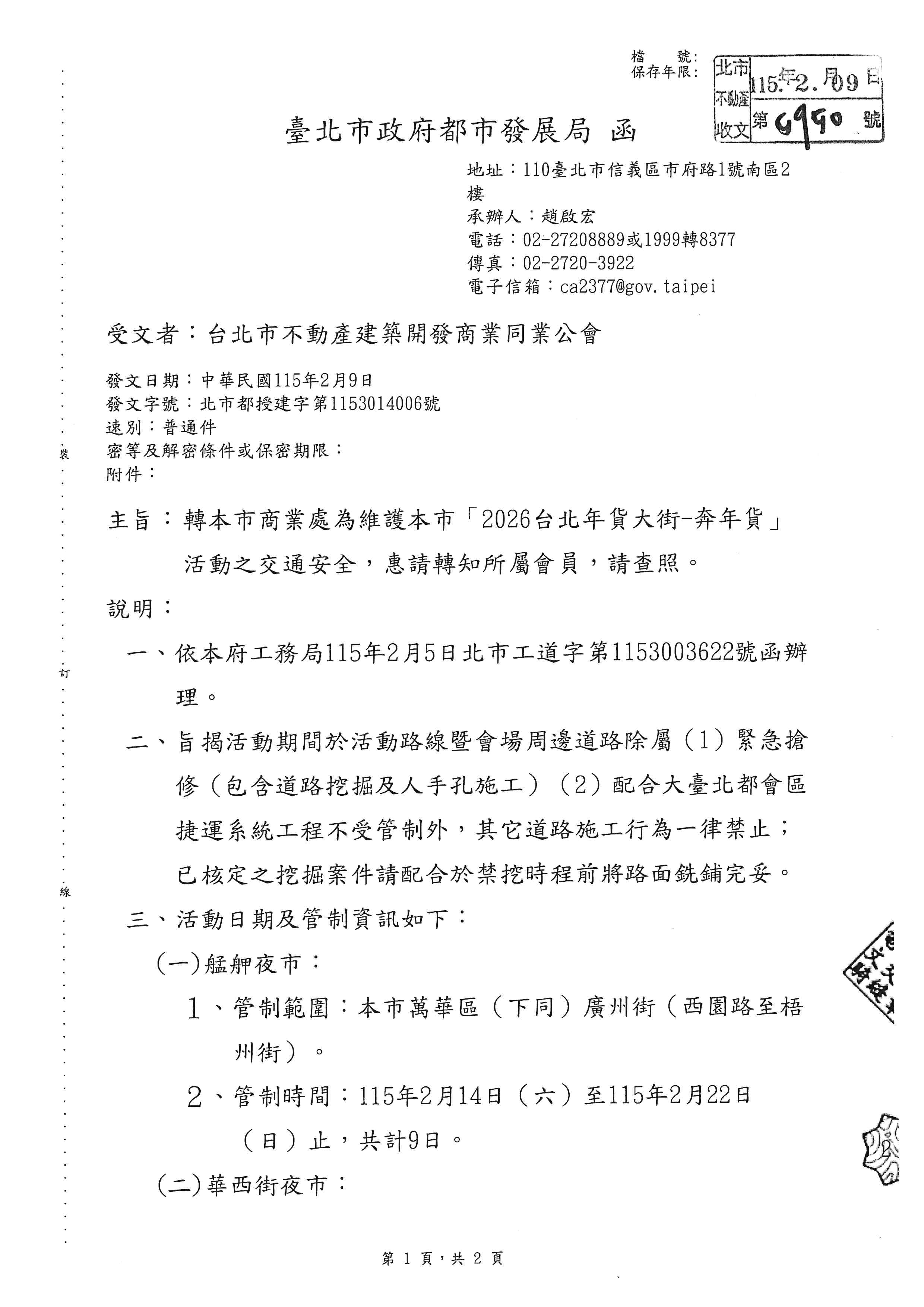 臺北市政府都市發展局轉臺北巿商業處為維護本市「2026台北年貨大街—奔年貨」活動之交通安全,轉知會員配合辦理