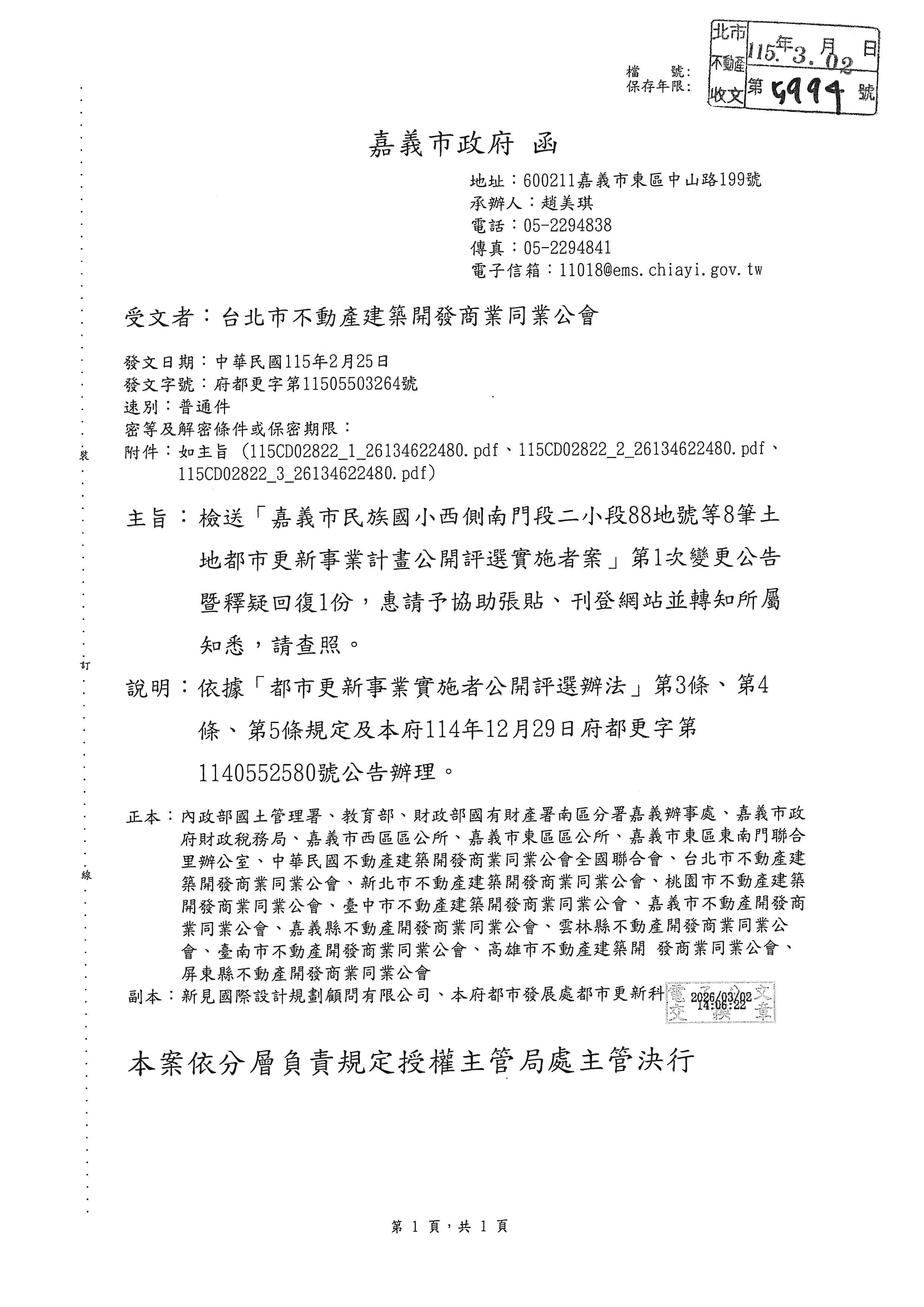 嘉義市政府檢送「嘉義市民族國小西側南門段二小段88地號等8筆土地都市更新事業計畫公開評選實施者案」第1次變更公告暨釋疑回復1份,轉知會員知悉