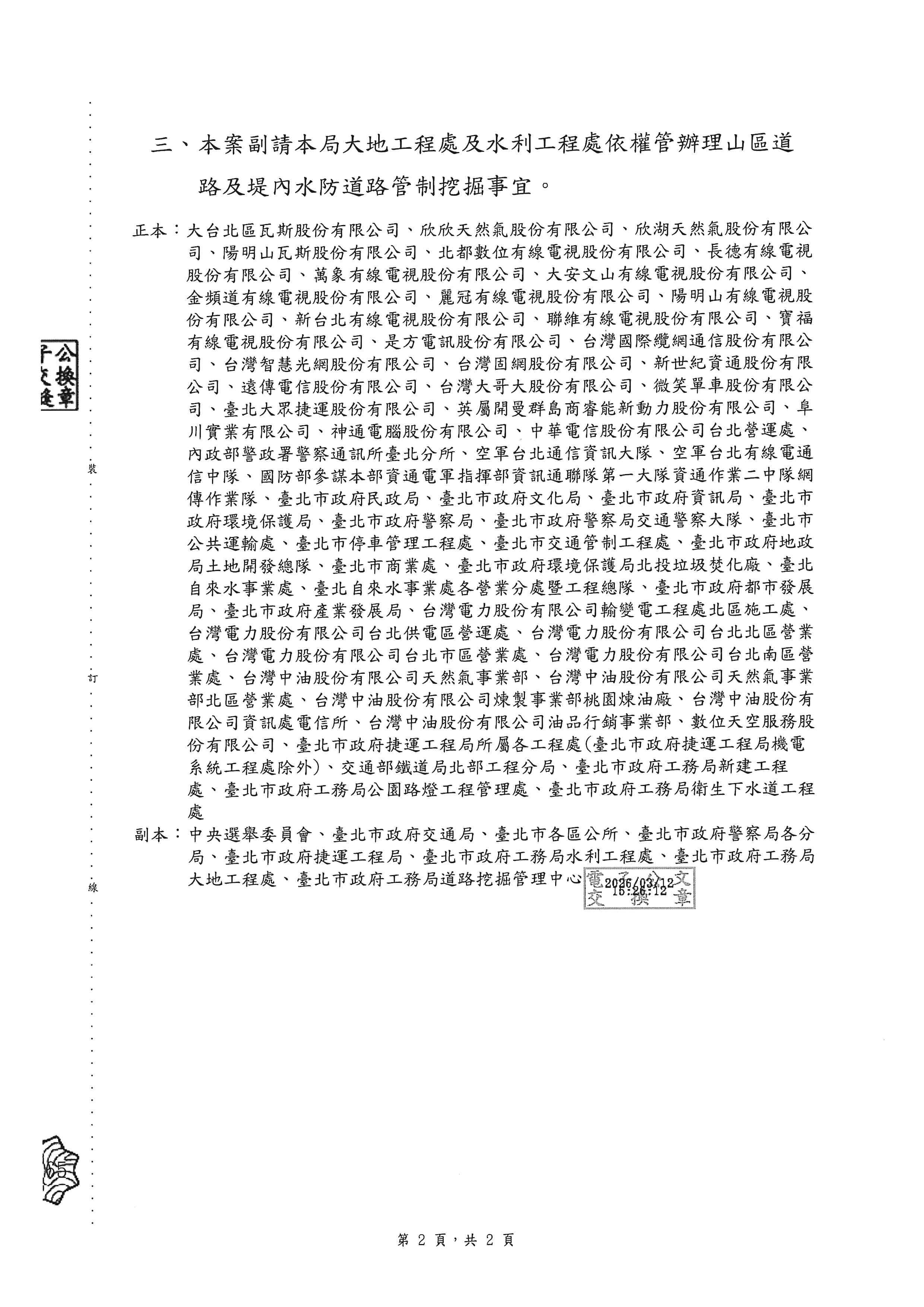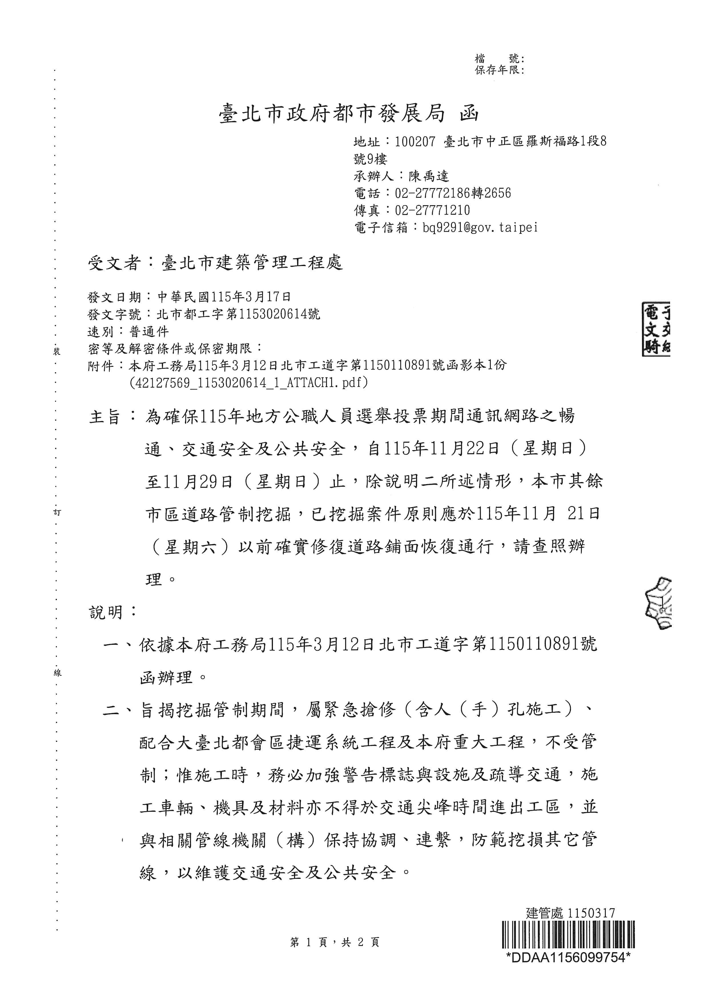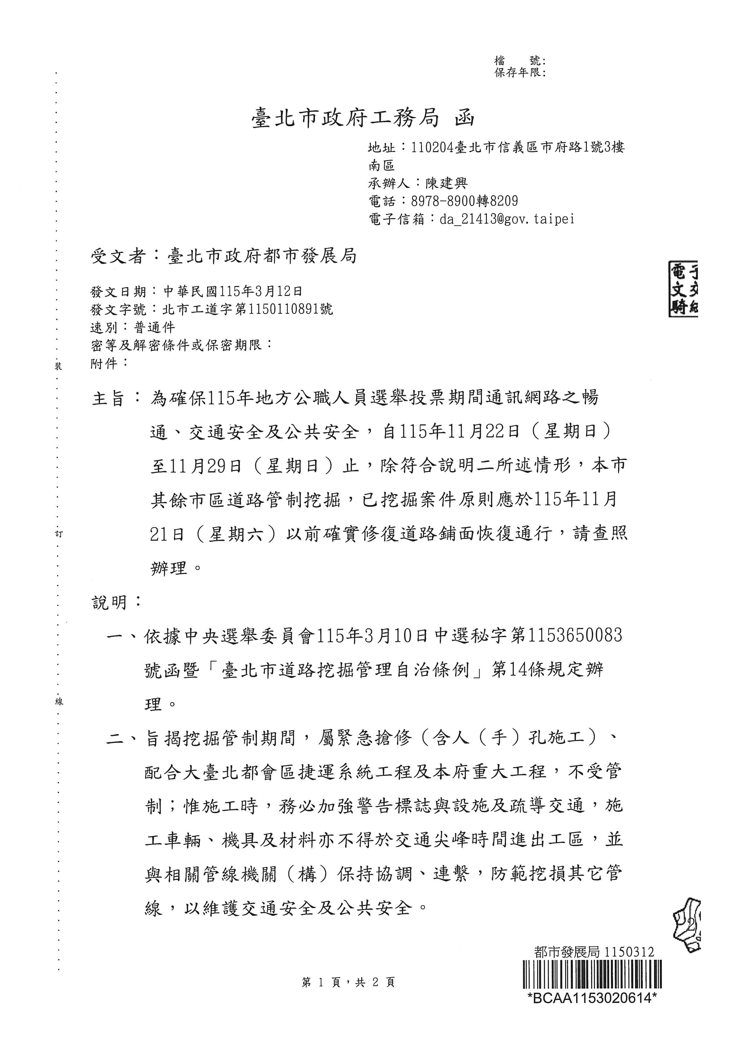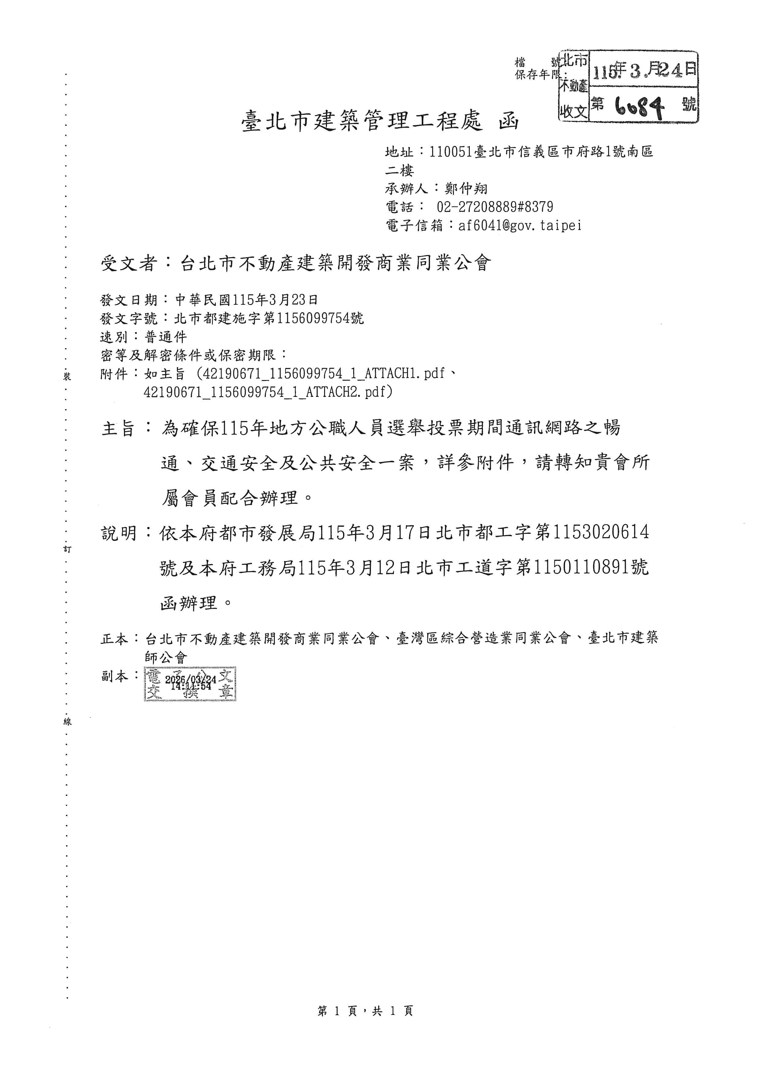 臺北市建築管理工程處為確保115年地方公職人員選舉投票期間通訊網路之暢通、交通安全及公共安全一案,轉知會員配合辦理。