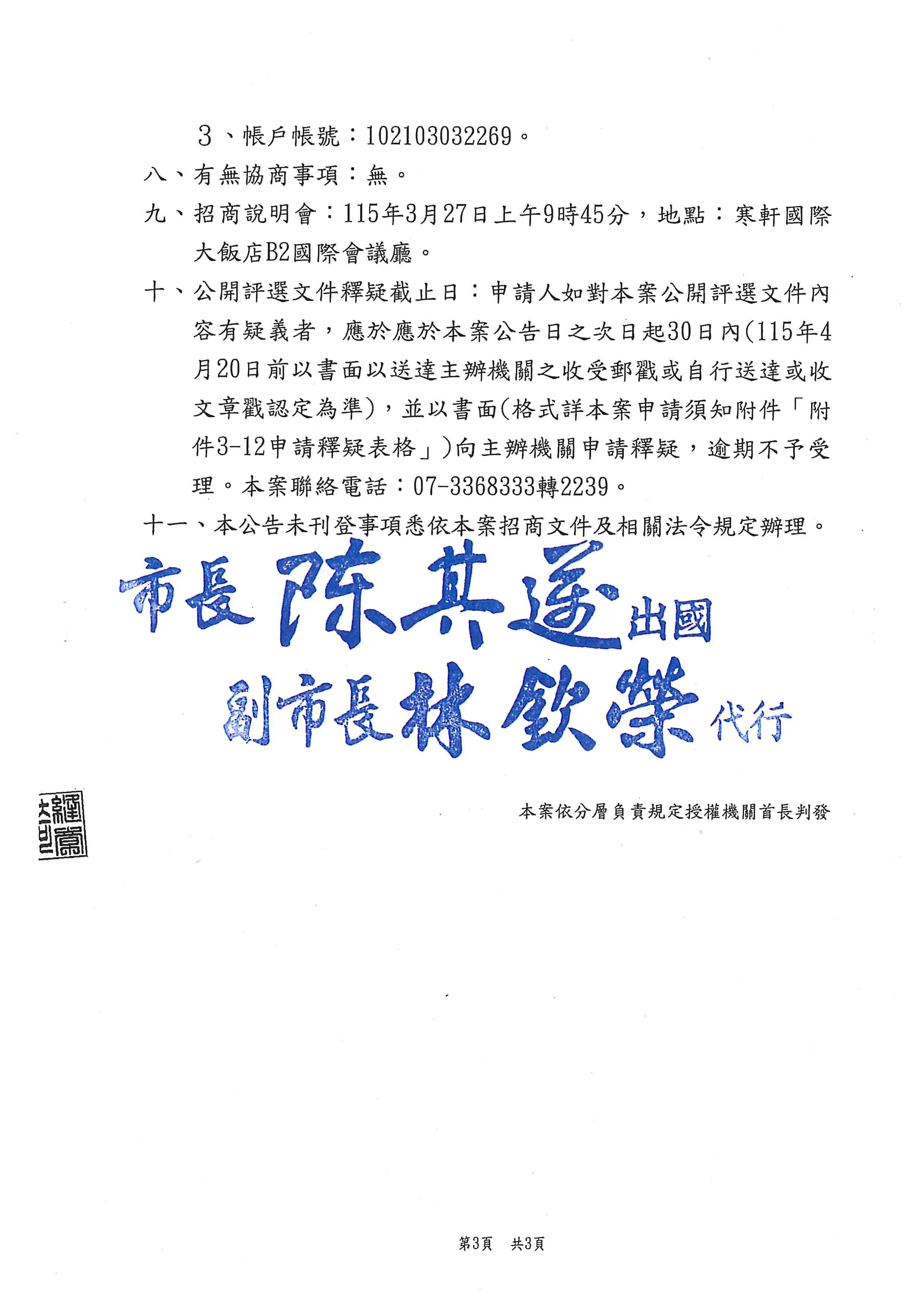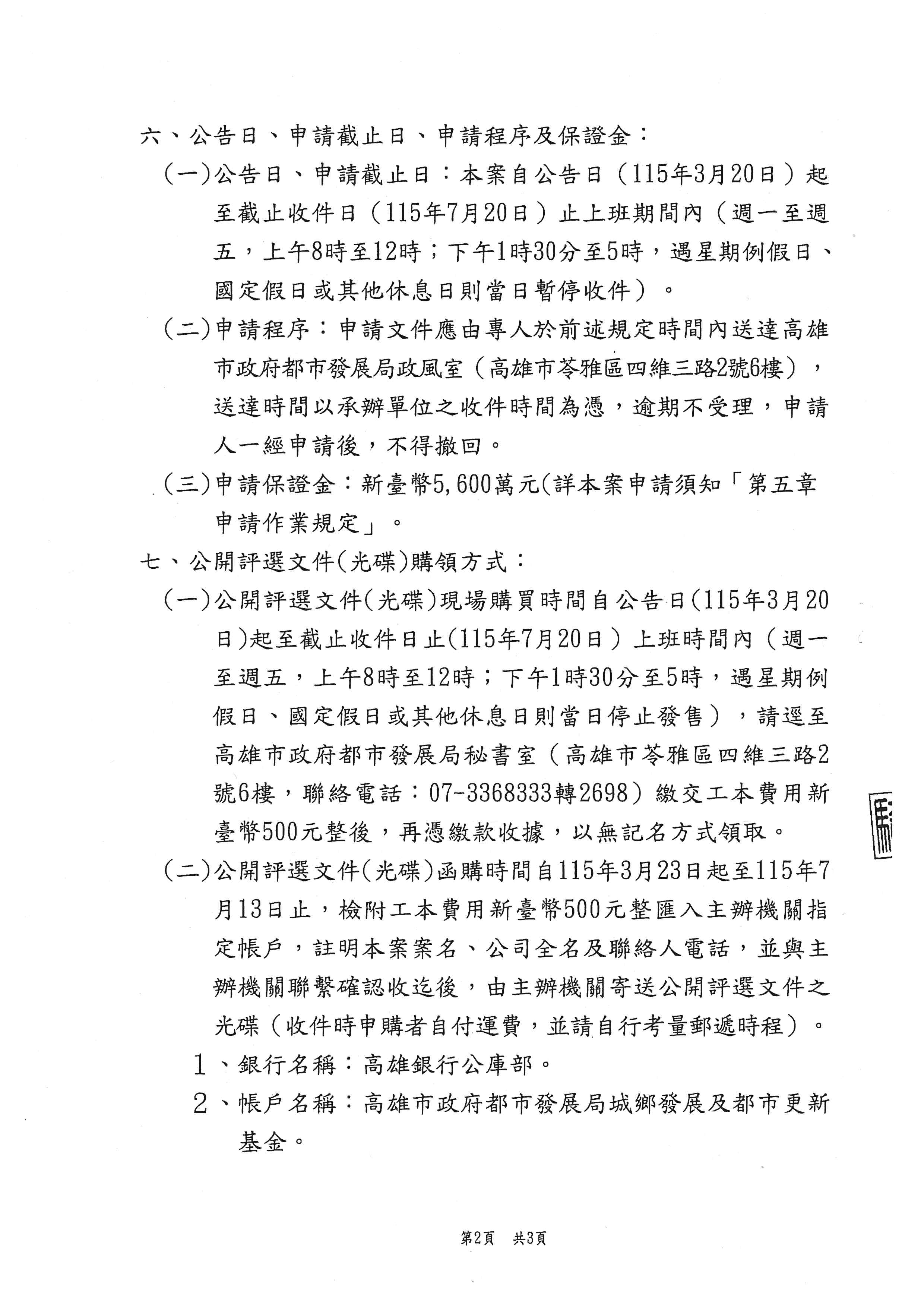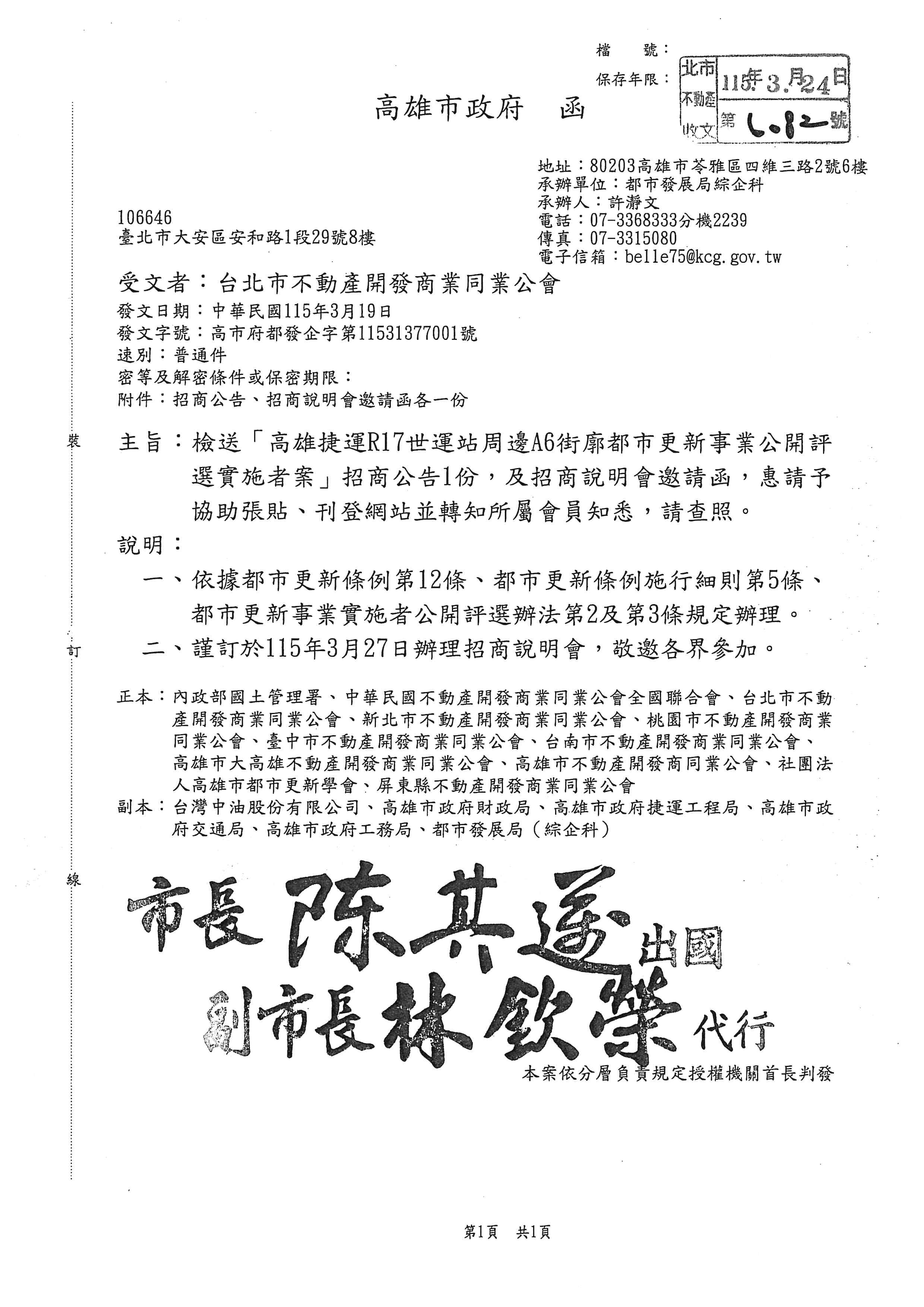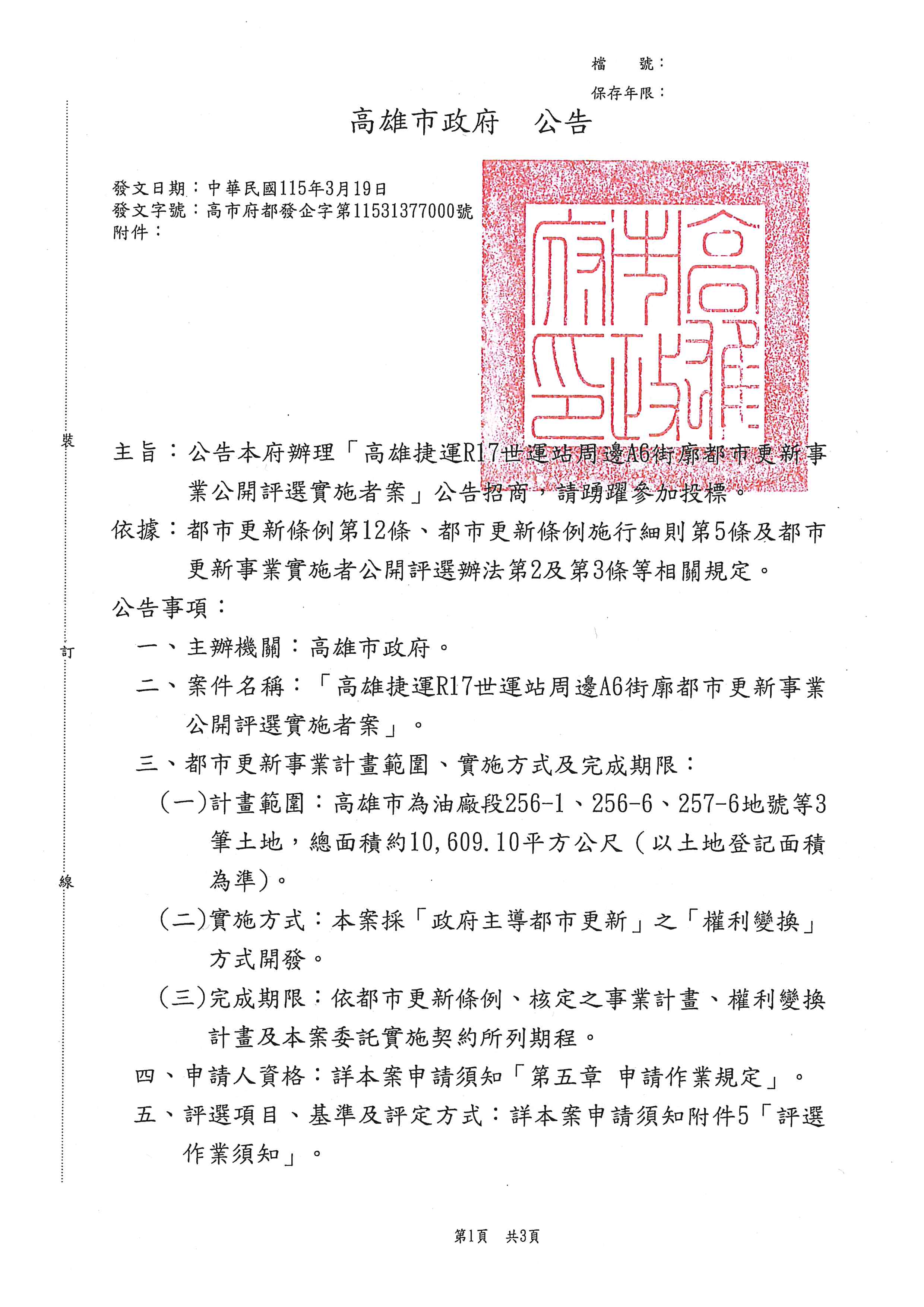 轉知高雄市政府辦理「高雄捷運R17世運站周邊A6街廓都市更新事業公開評選實施者案」招商說明會,請查照。
