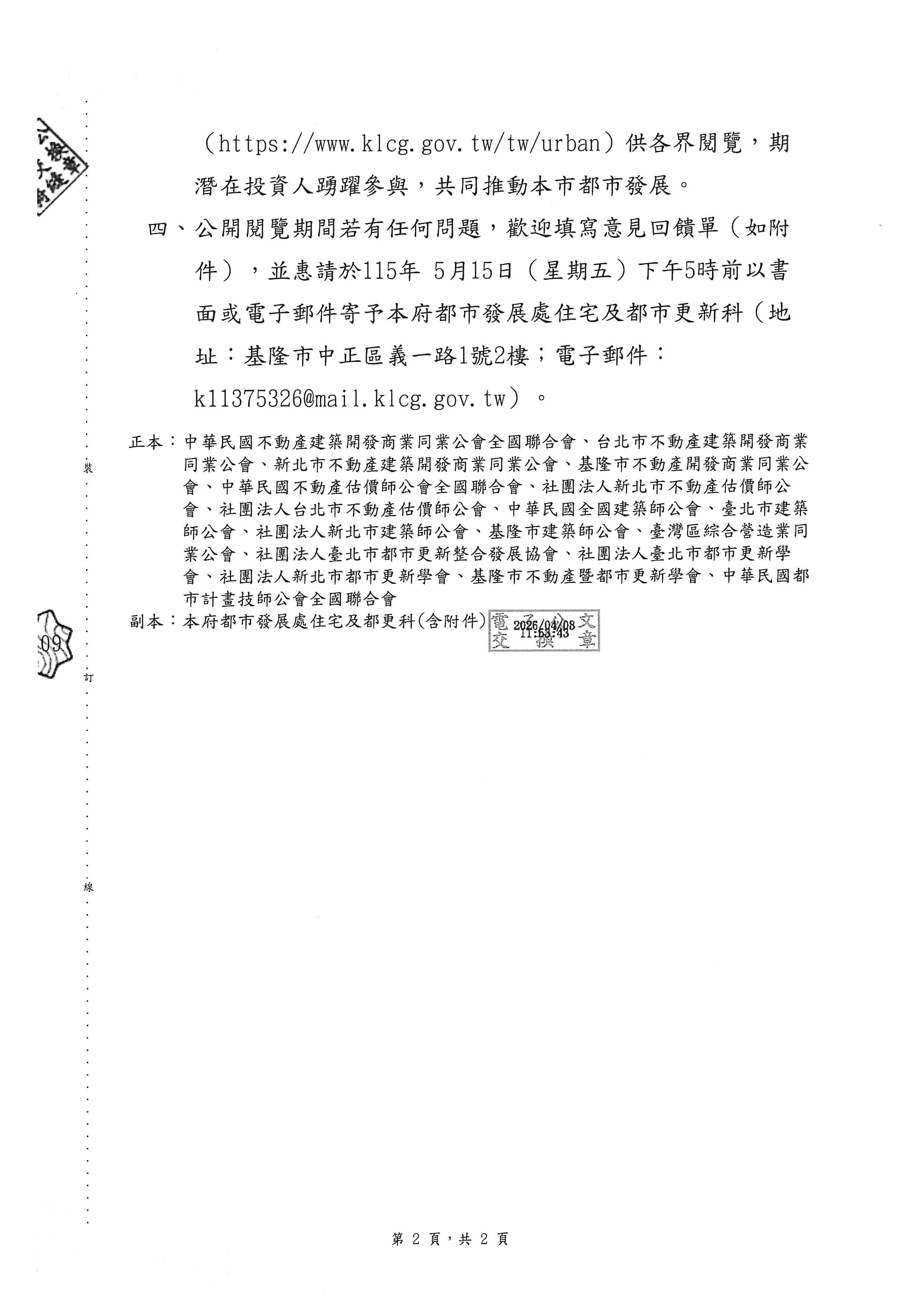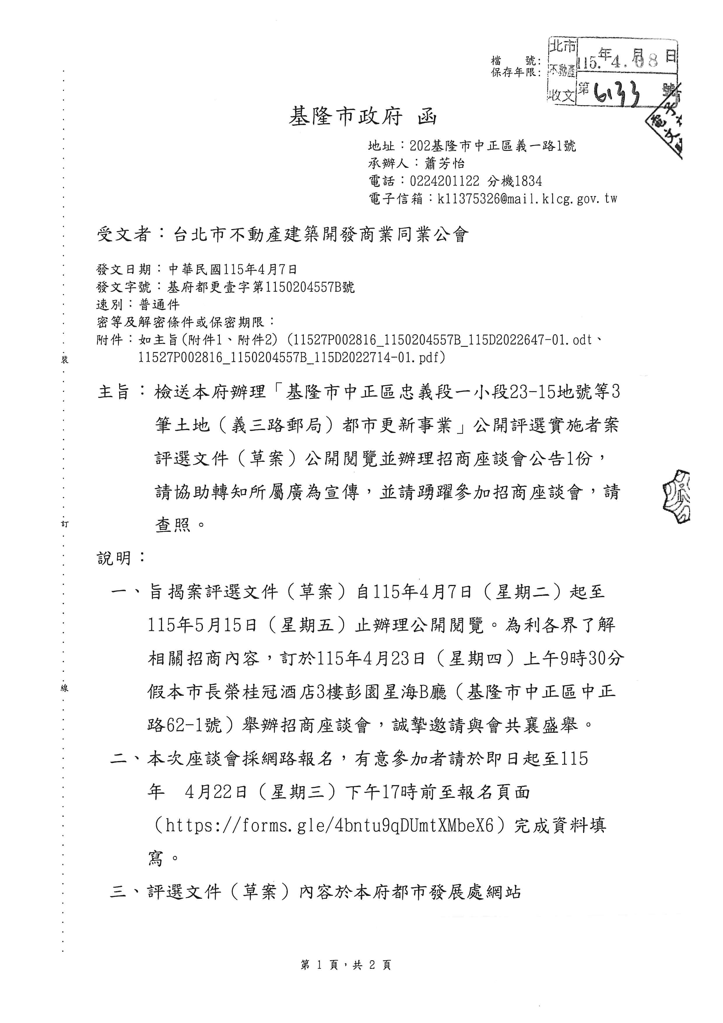 基隆市政府檢送該府辦理「基隆市中正區忠義段一小段23-15地號等3筆土地(義三路郵局)都市更新事業」公開評選實施者案評選文件(草案)公開閱覽並辦理招商座談會公告1份,轉知會員踴躍參加招商座談會