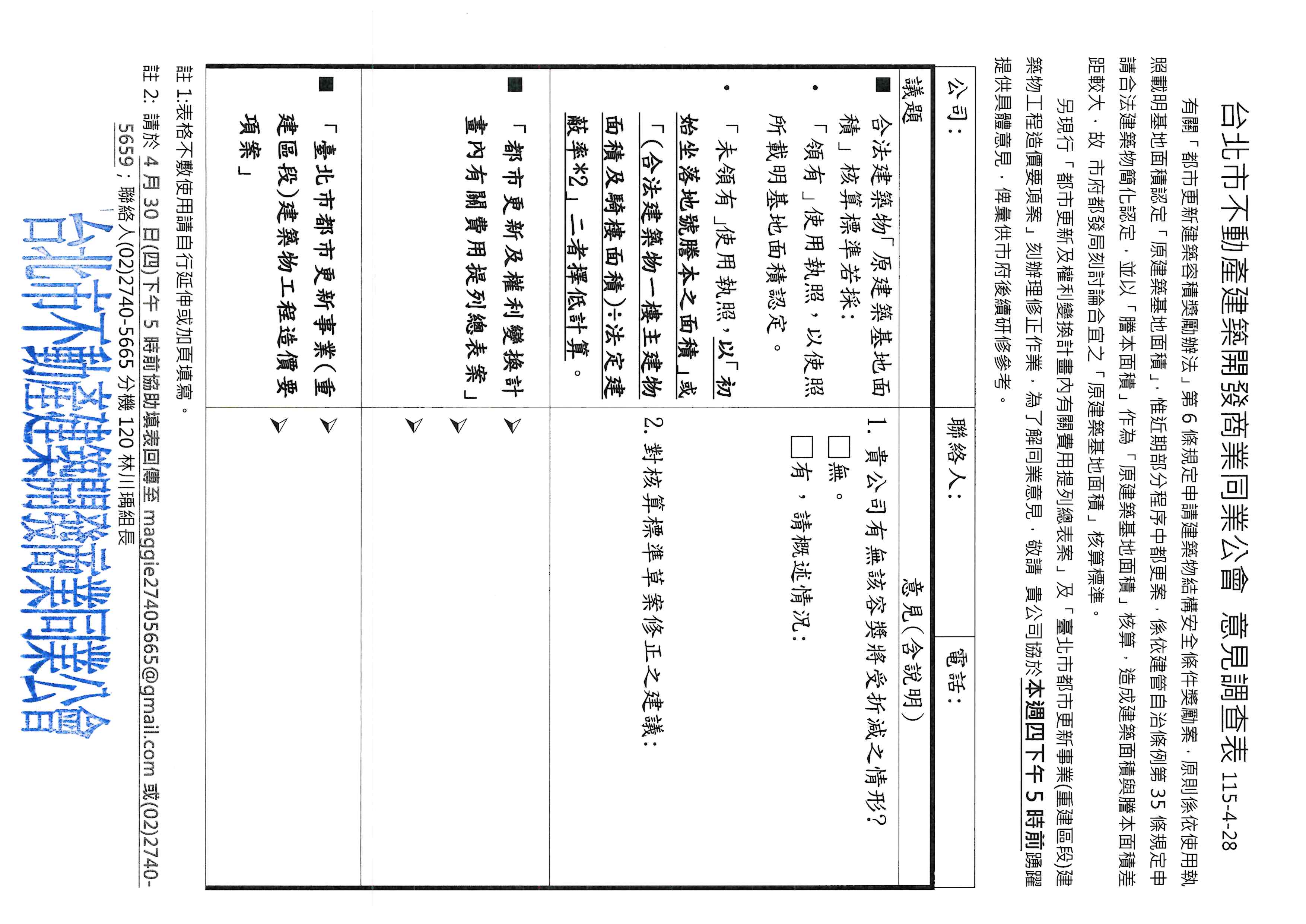 意見調查表:1.依建管自治條例第35條規定申請合法建築物簡化認定,並以「謄本面積」作為「原建築基地面積」核算,造成建築面積與謄本面積差距較大,故市府都發局刻討論合宜之「原建築基地面積」核算標準;2.另現行「都市更新及權利變換計畫內有關費用提列總表案」;3.「臺北市都市更新事業(重建區段)建築物工程造價要項案」刻辦理修正作業,為了解同業意見,敬請提供具體意見。 公告時間:2026 年 04 月 28 日 文件下載