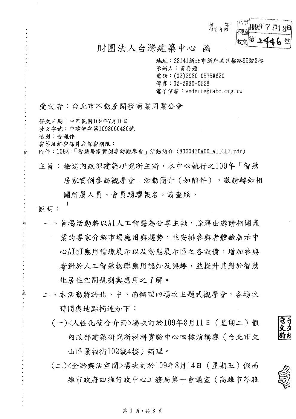 轉知內政部建研所主辦,台灣建築中心執行之109年「智慧居家實例參訪觀摩會」活動簡介
