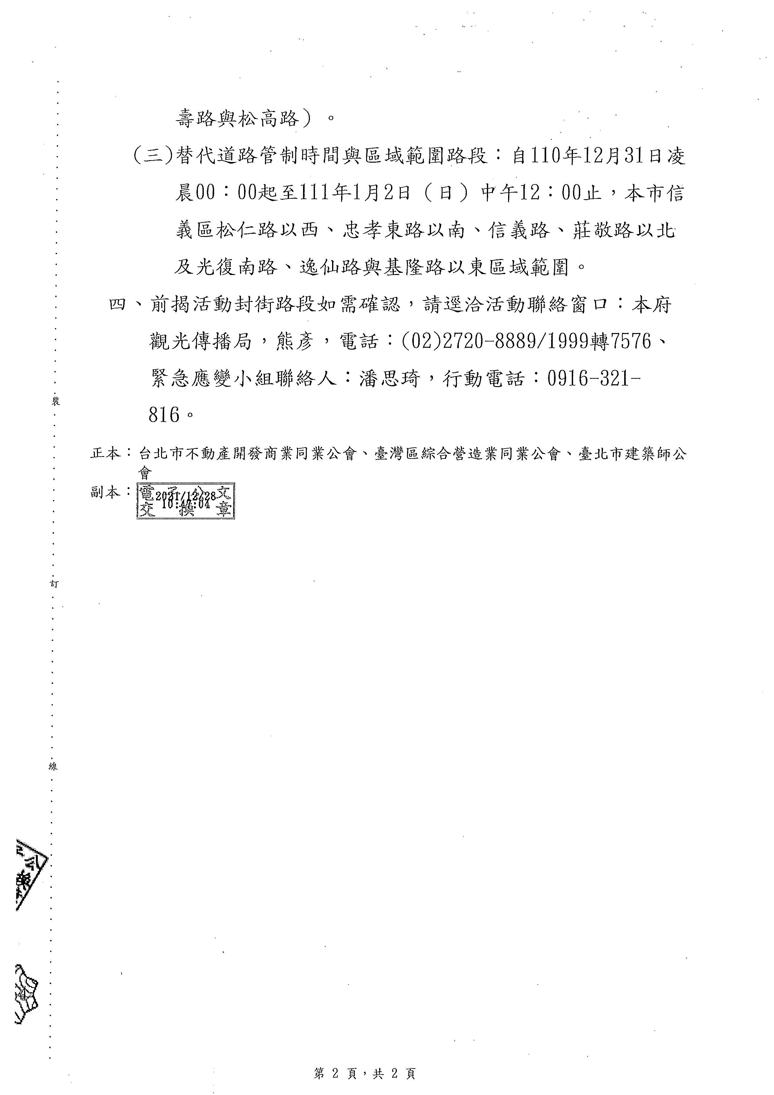 函轉建管處為維護「臺北最High新年城—2022跨年晚會」活動會場周邊民眾安全及交通順暢,請依說明事項函請會員配合辦理