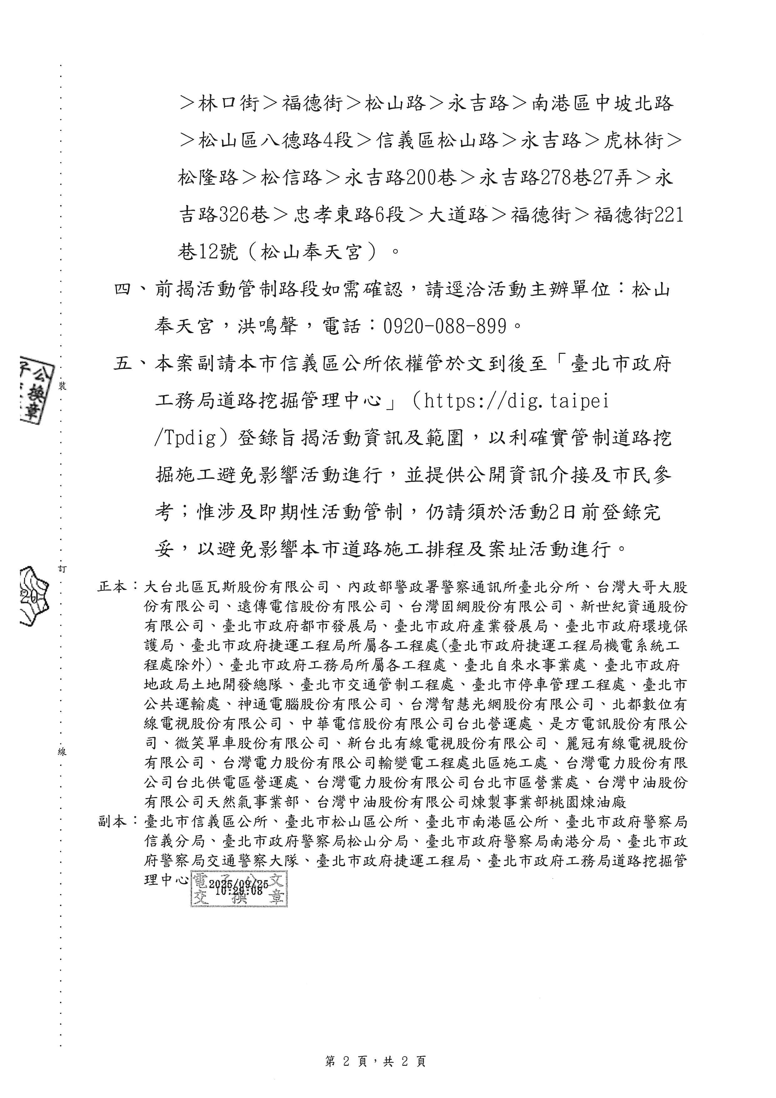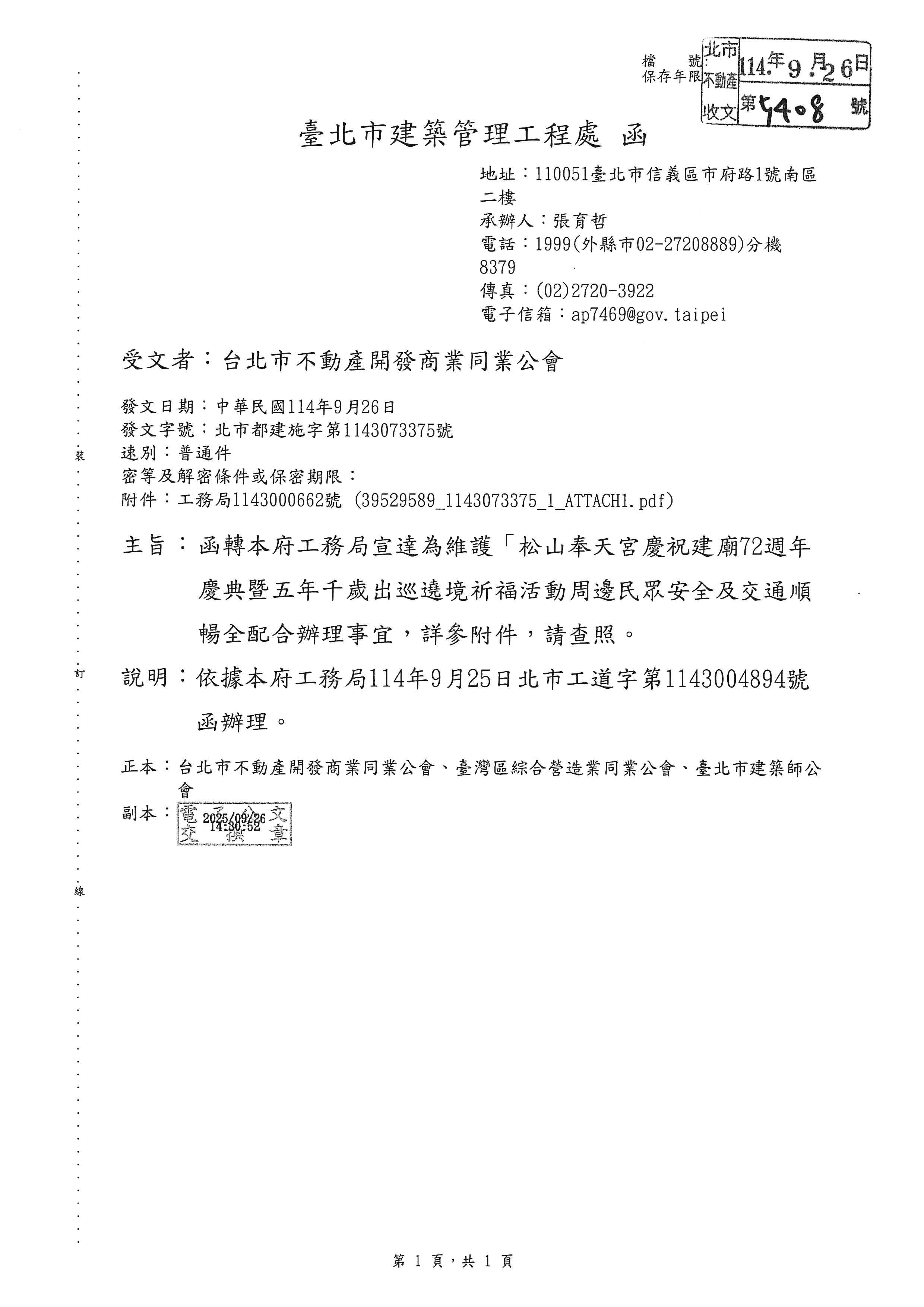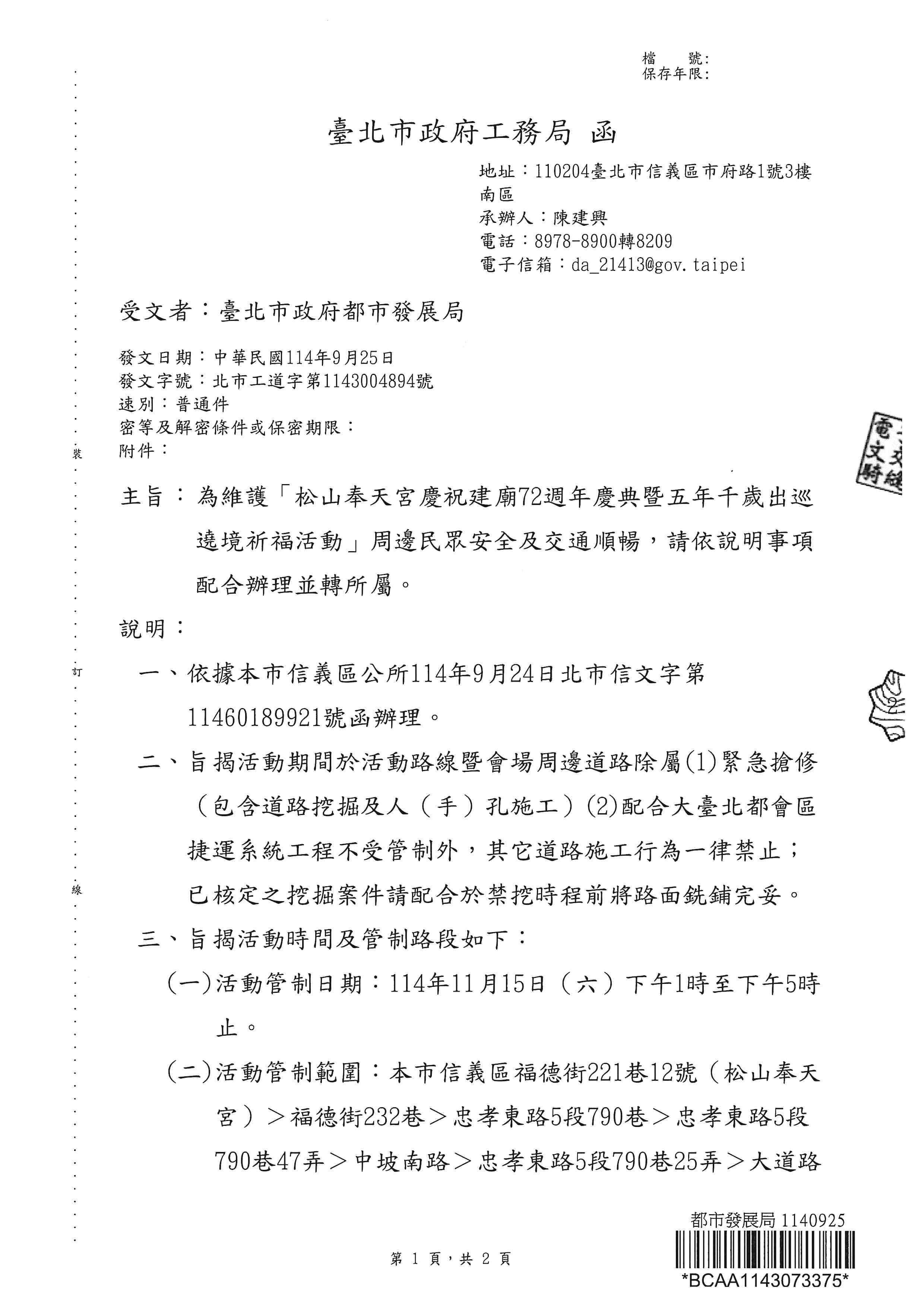 臺北市建築管理工程處函轉臺北巿政府工務局宣達為維護「松山奉天宮慶祝建廟72週年慶典暨五年千歲出巡遶境祈福活動周邊民眾安全及交通順暢全配合辦理事宜