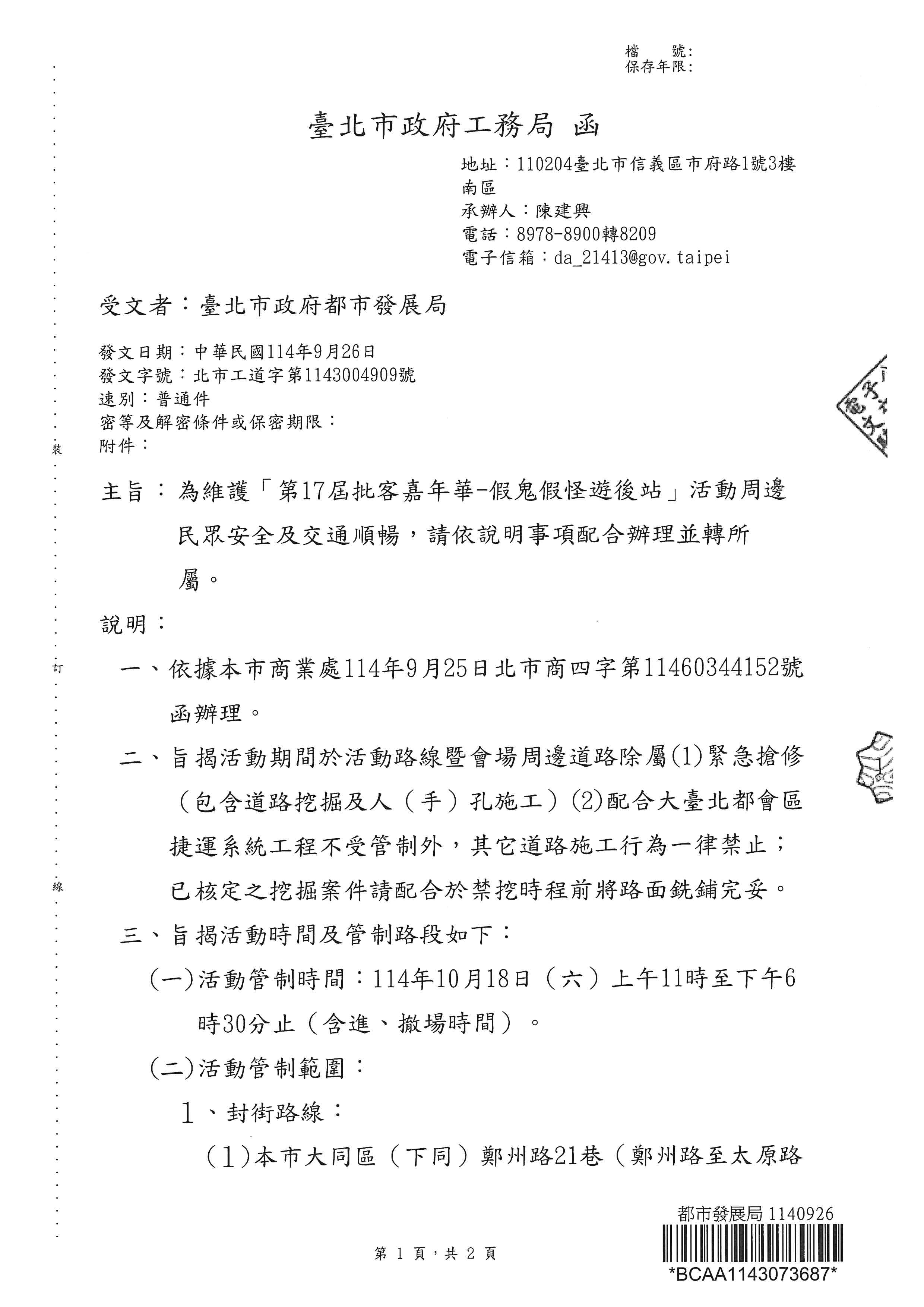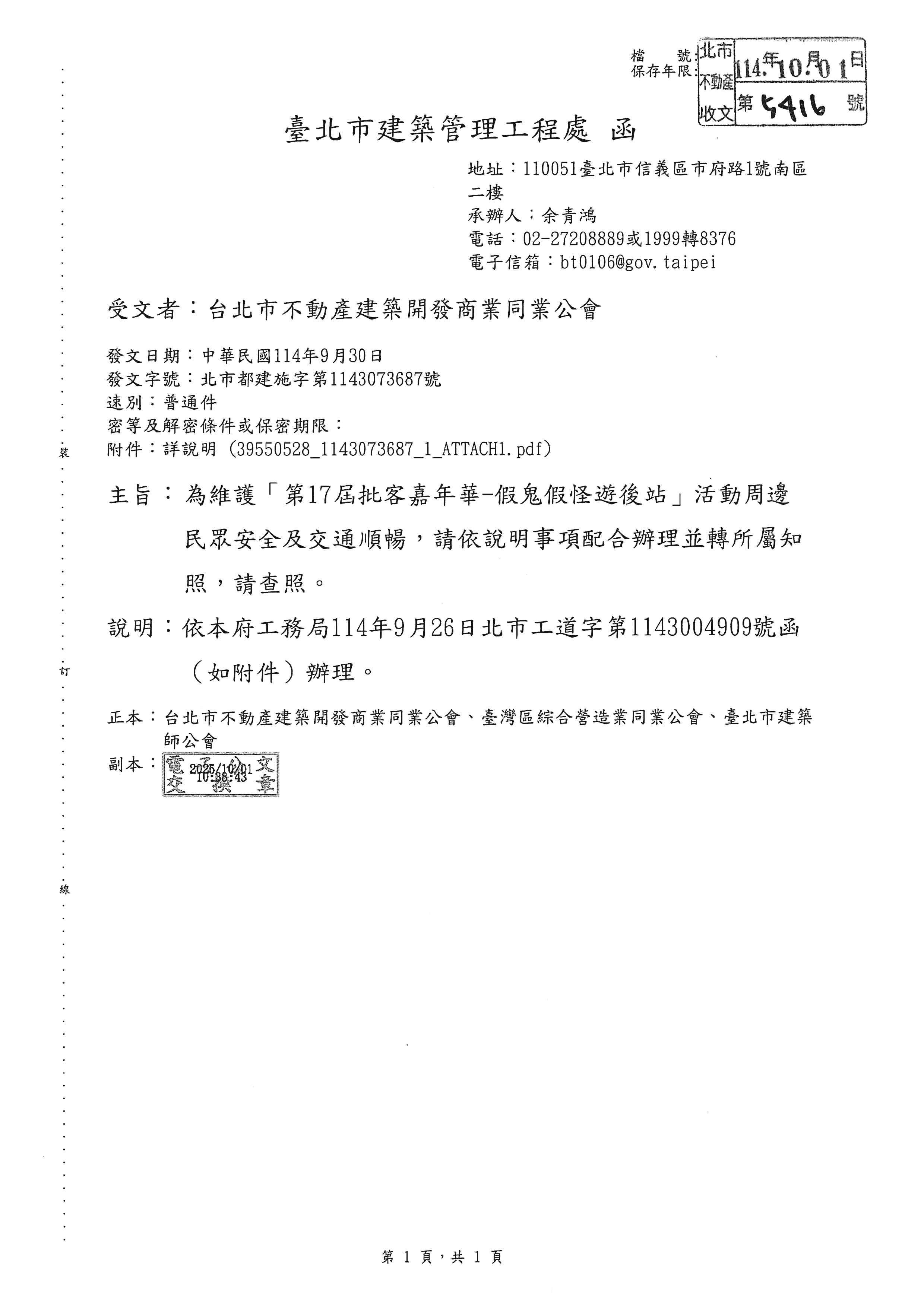臺北市建築管理工程處為維護「第17屆批客嘉年華-假鬼假怪遊後站」活動周邊民眾安全及交通順暢,轉知會員依說明事項配合辦理
