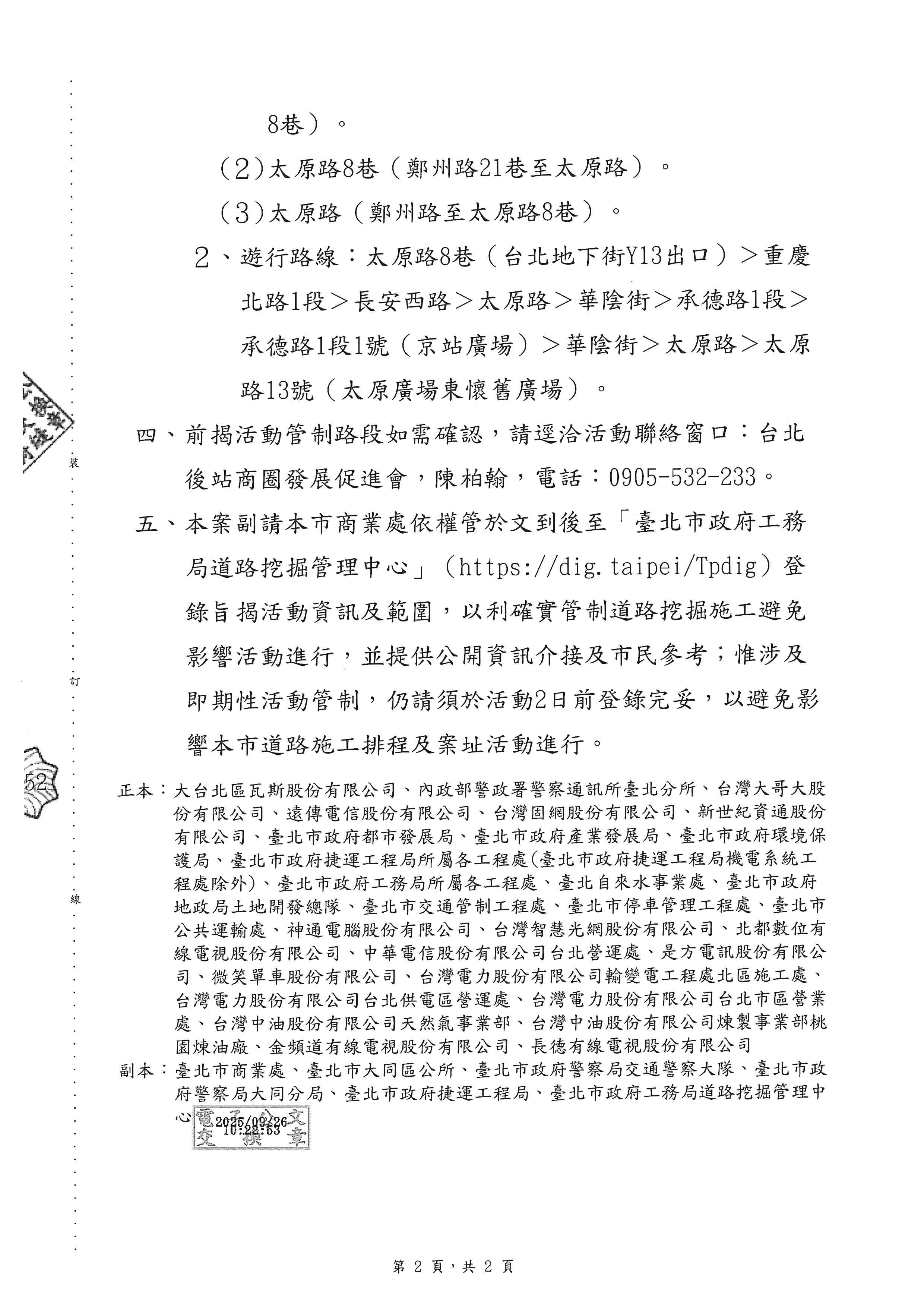 臺北市政府都市發展局函轉臺北巿政府工務局為維護本市萬華區「新村福德宮遶境聖會活動」活動之交通安全,轉知會員配合辦理