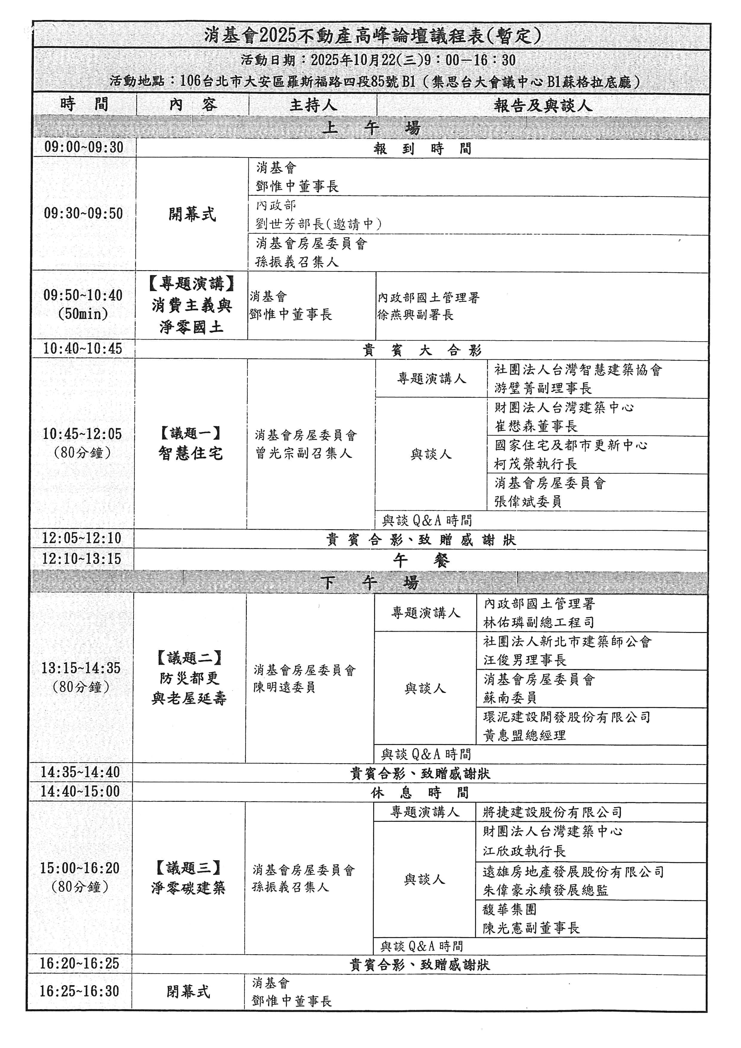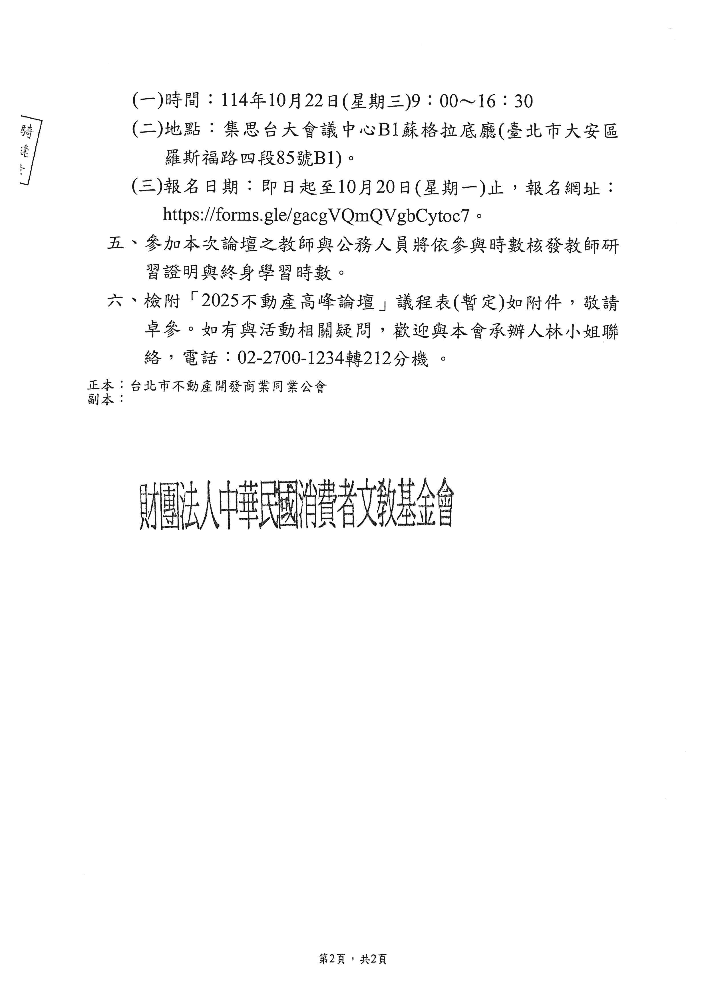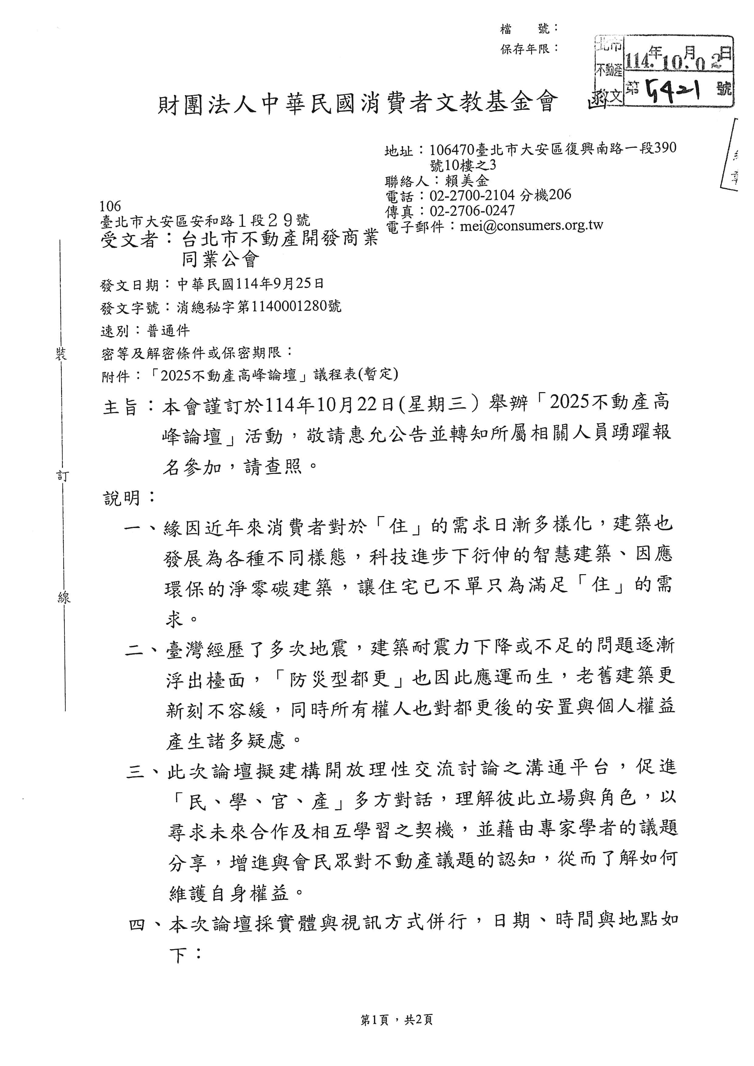 財團法人中華民國消費者文教基金會謹訂於114年10月22日(星期三)舉辦「2025不動產高峰論壇」活動,轉知會員踴躍報名參加