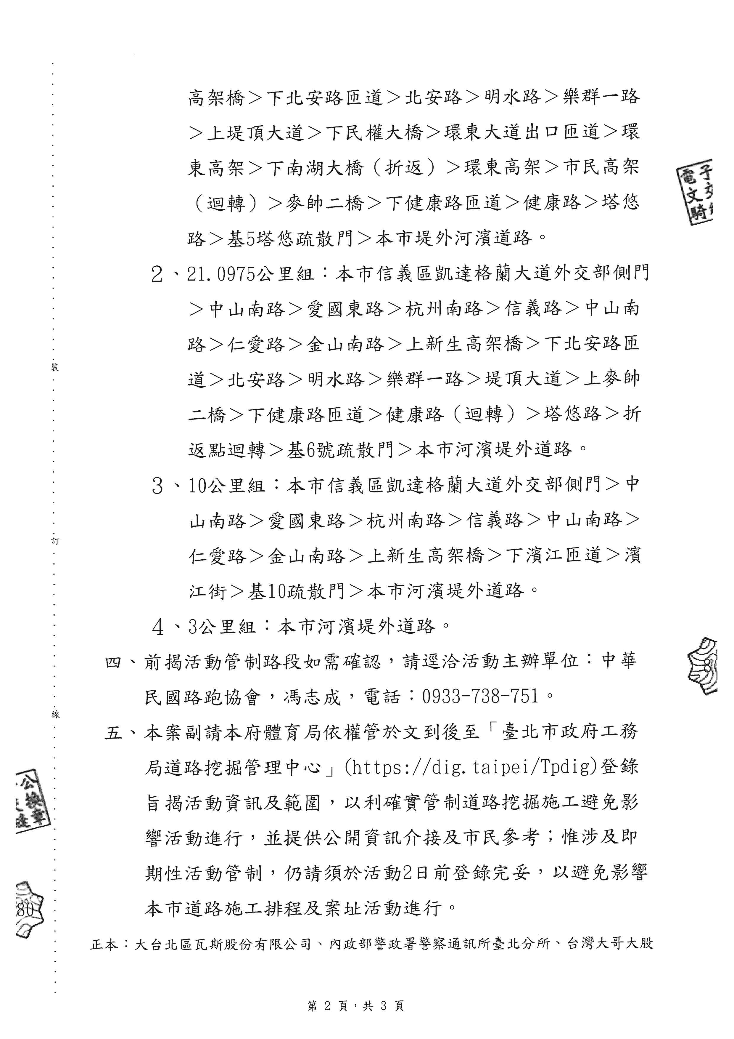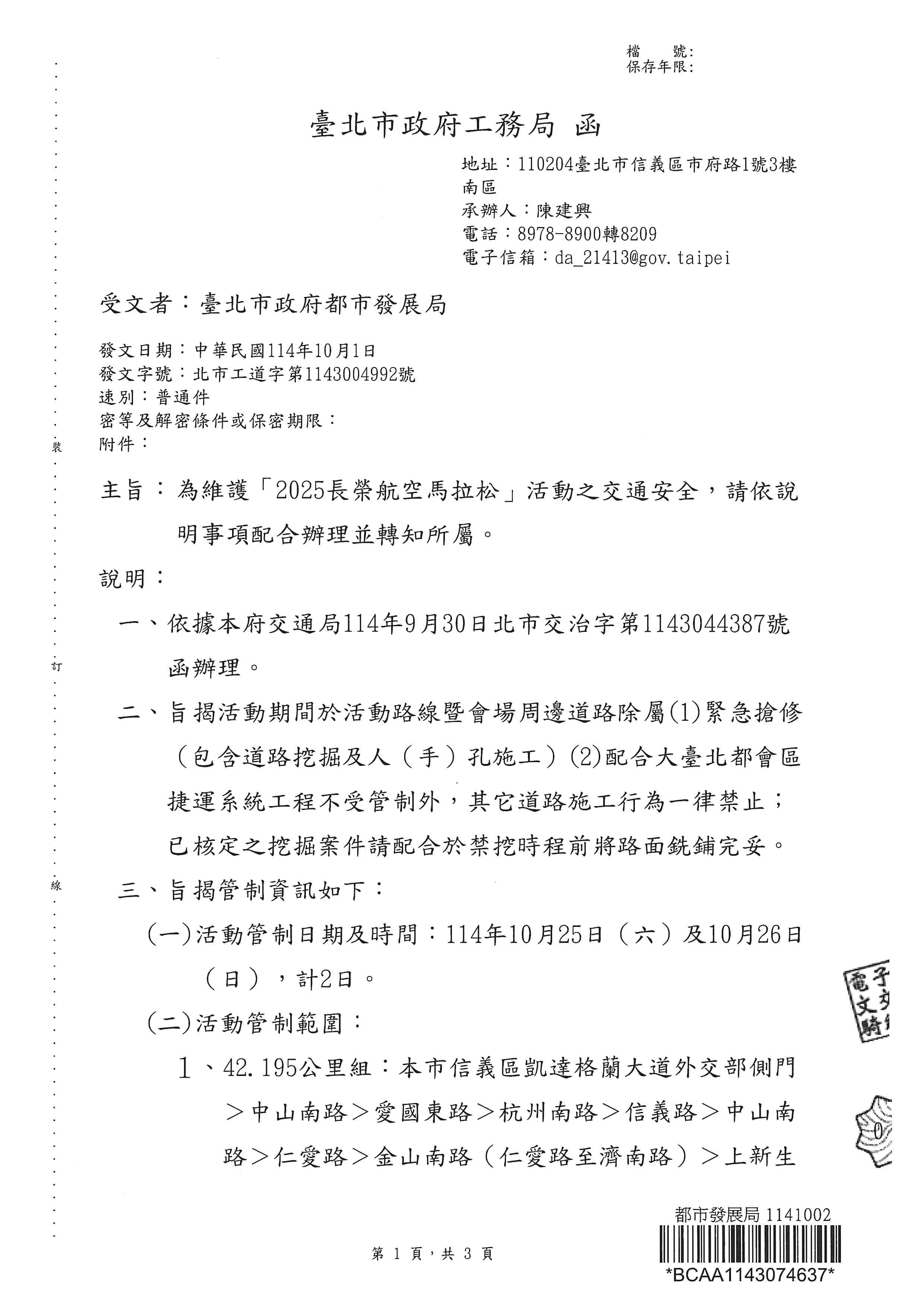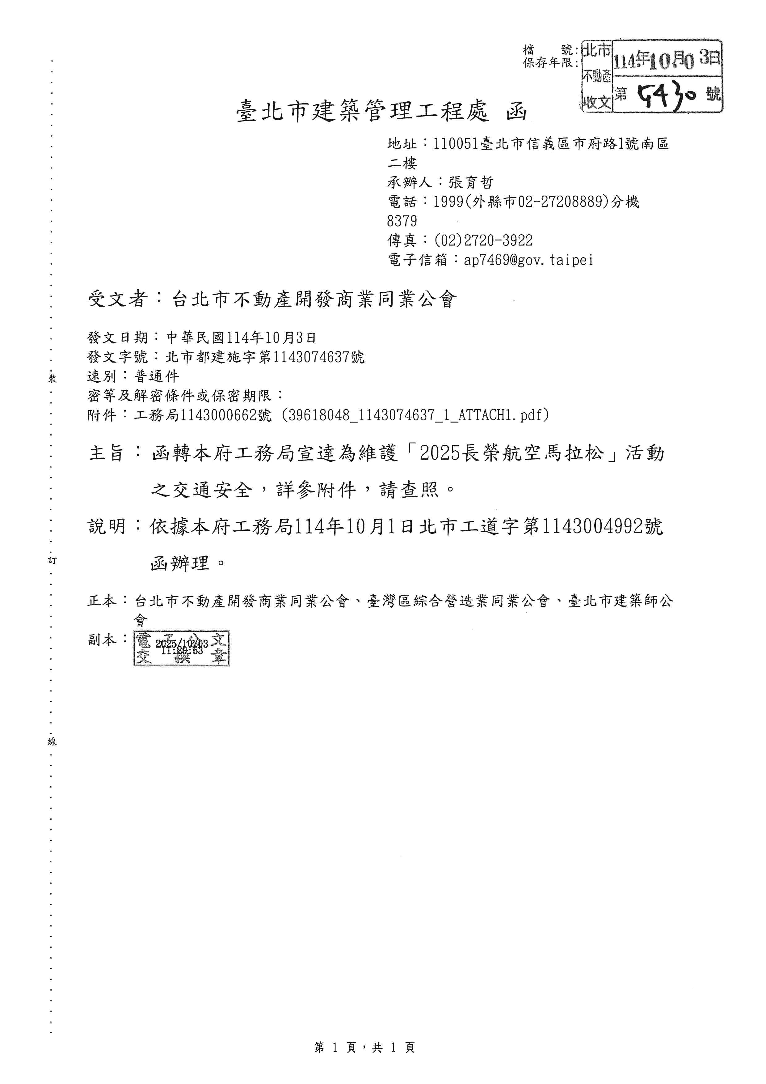 臺北市建築管理工程處函轉臺北巿政府工務局宣達為維護「2025長榮航空馬拉松」活動之交通安全,轉知會員配合辦理