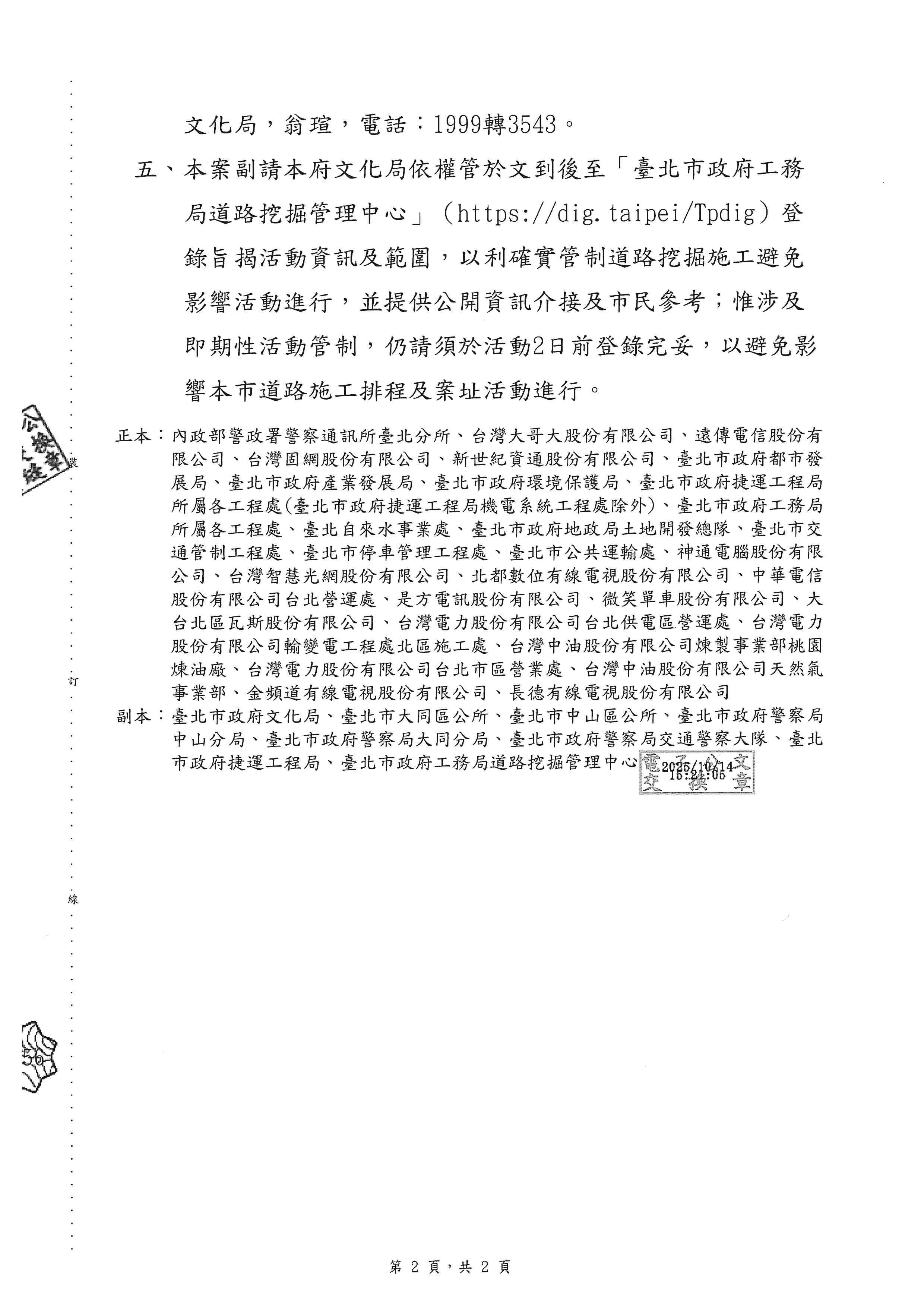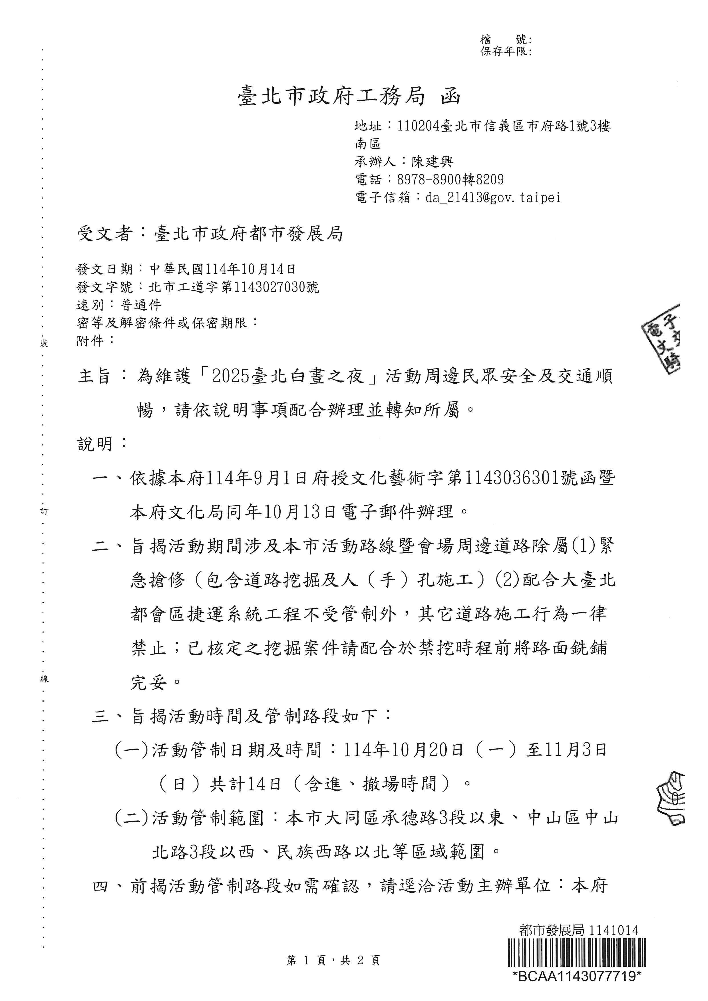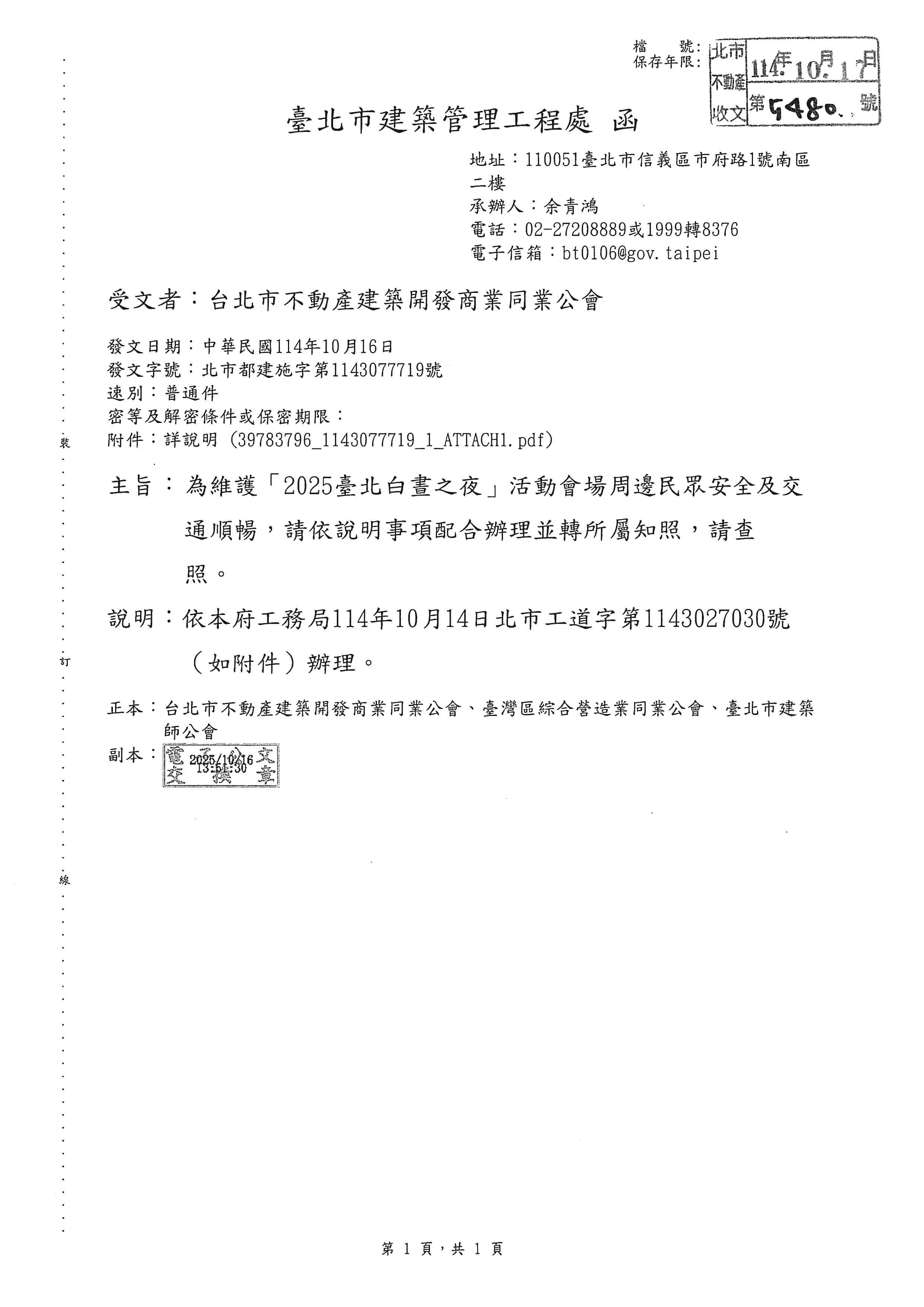 臺北市建築管理工程處為維護「2025臺北白晝之夜」活動會場周邊民眾安全及交通順暢,轉知會員依說明事項配合辦理