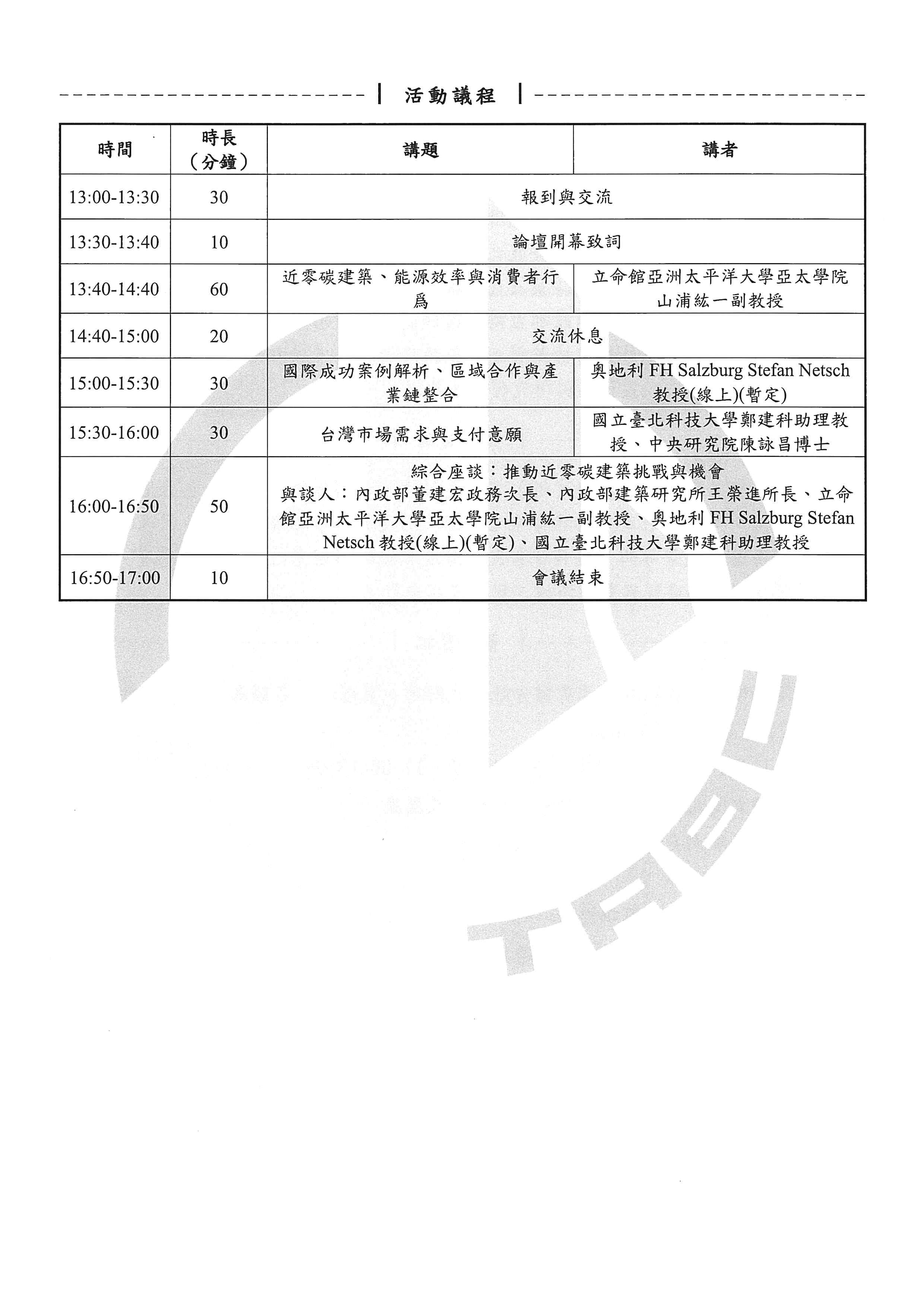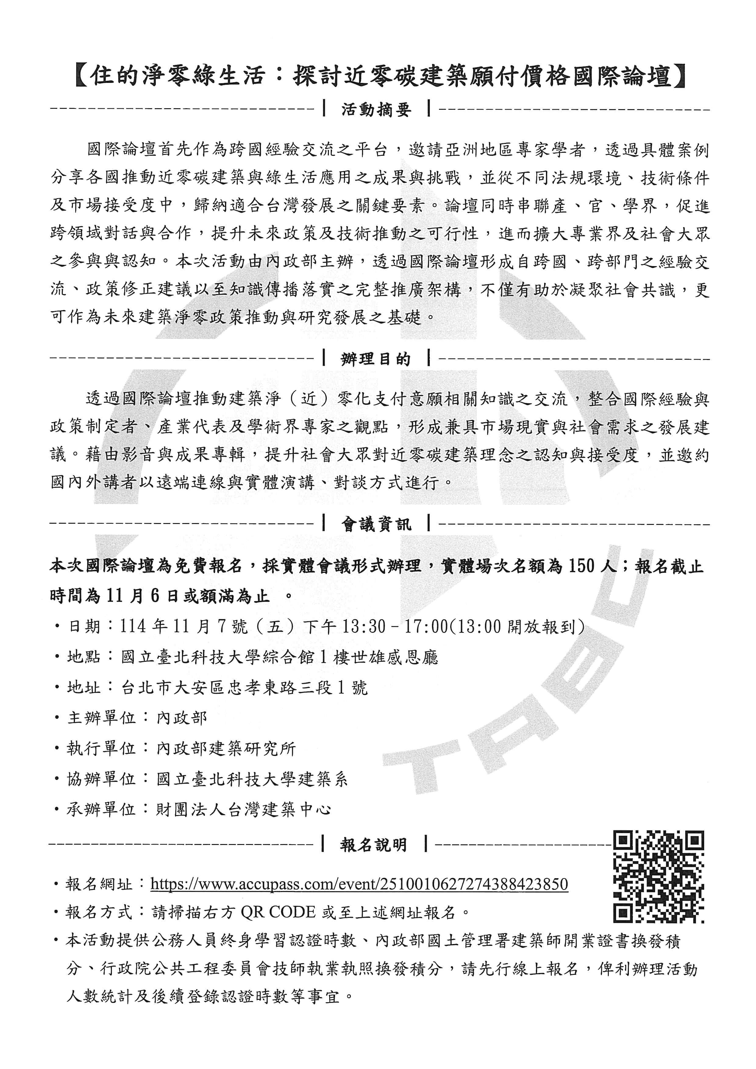 財團法人台灣建築中心辦理內政部「住的淨零綠生活:探討近零碳建築願付價格國際論壇」,轉知會員參加活動