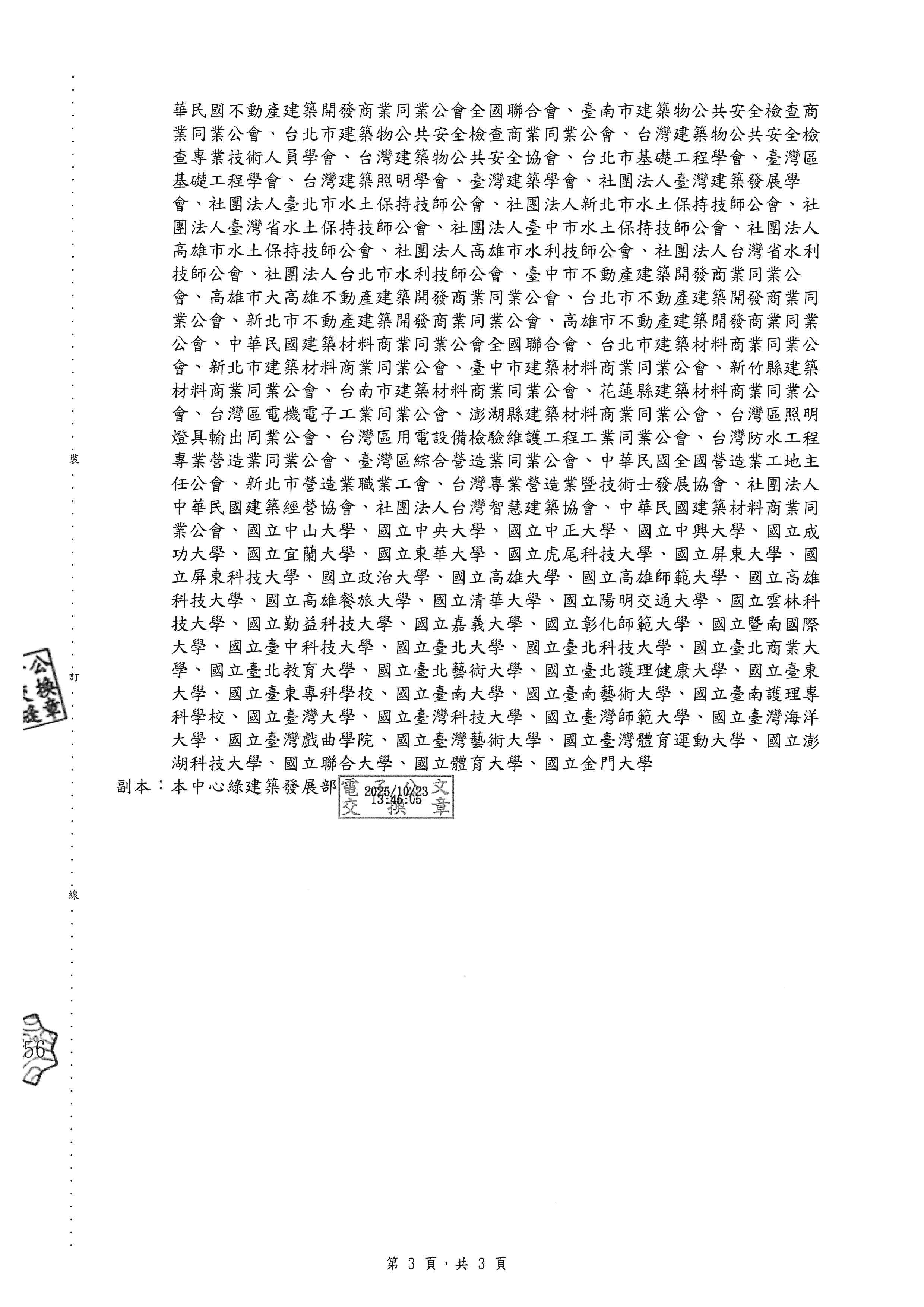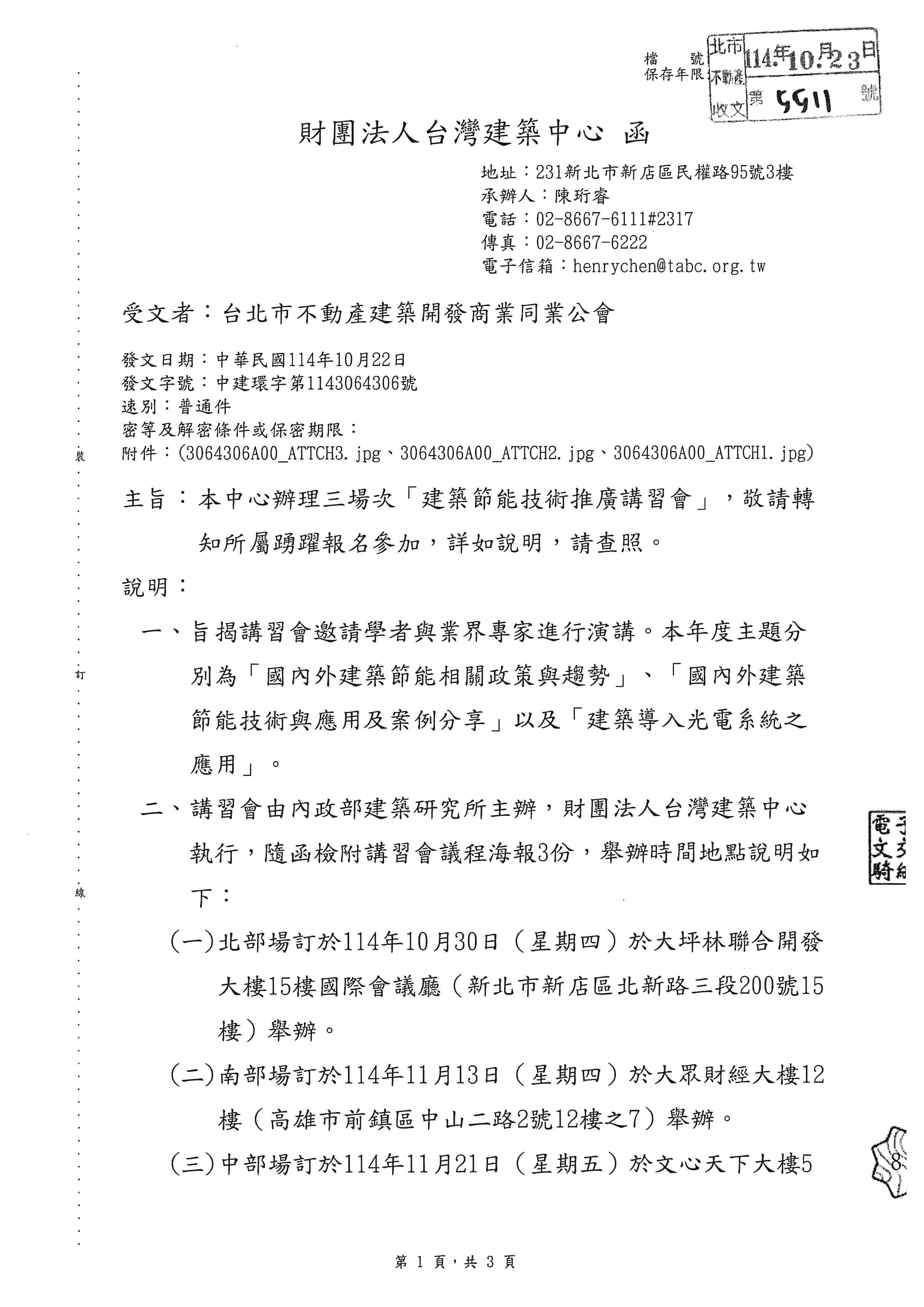 轉知內政部建築研究所委託財團法人工業技術研究院辦理,訂於114年10月30日(中部場)、11月10日(北部場)、11 月18日(南部場)舉辦「建築導入太陽光