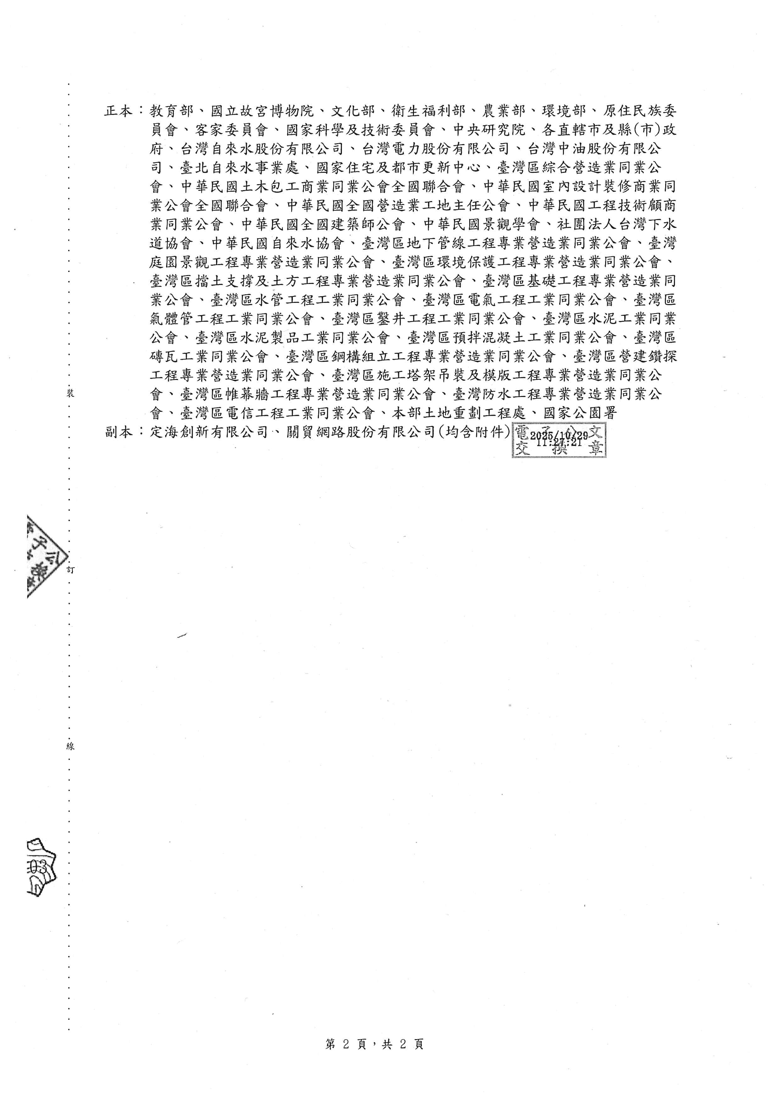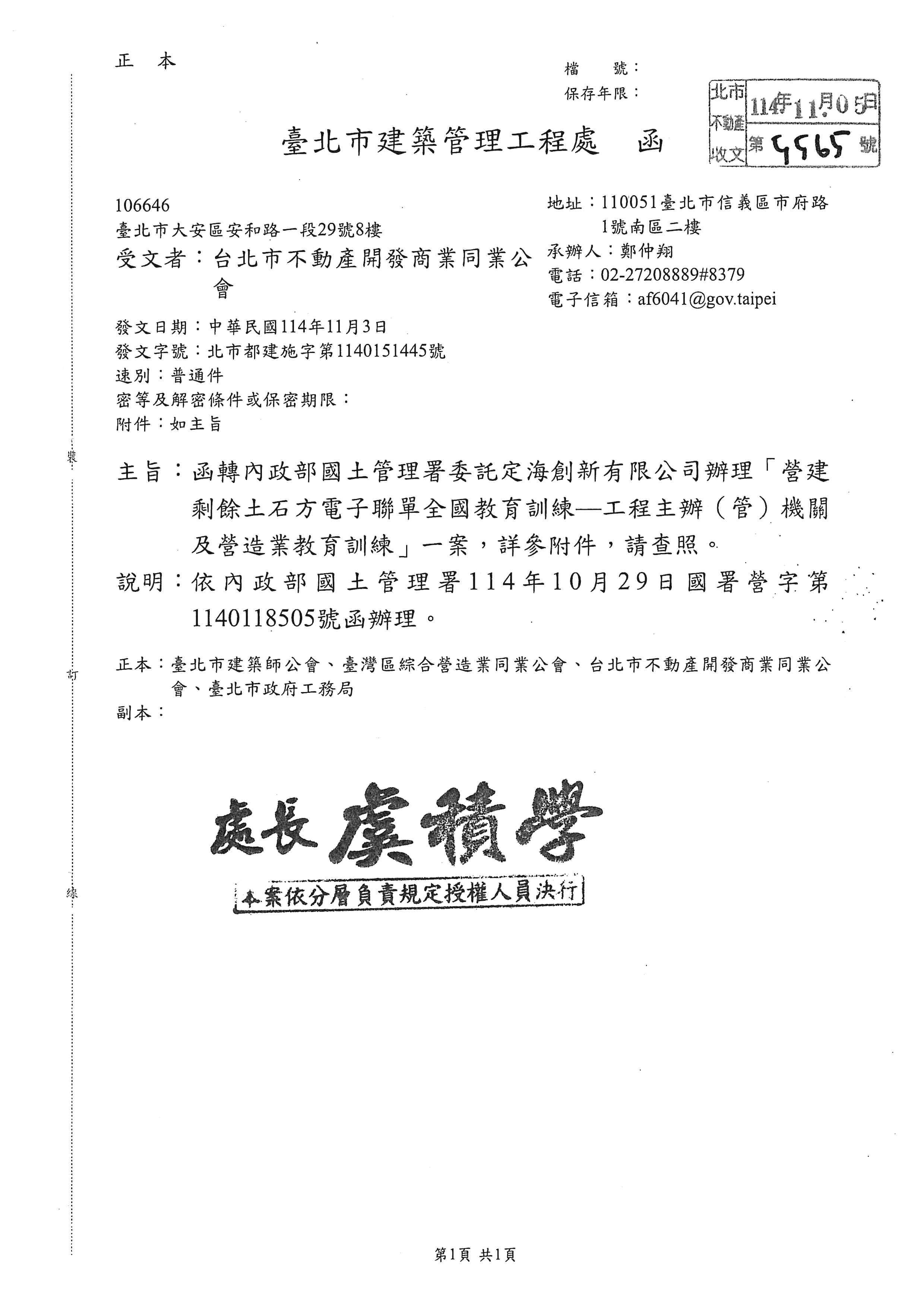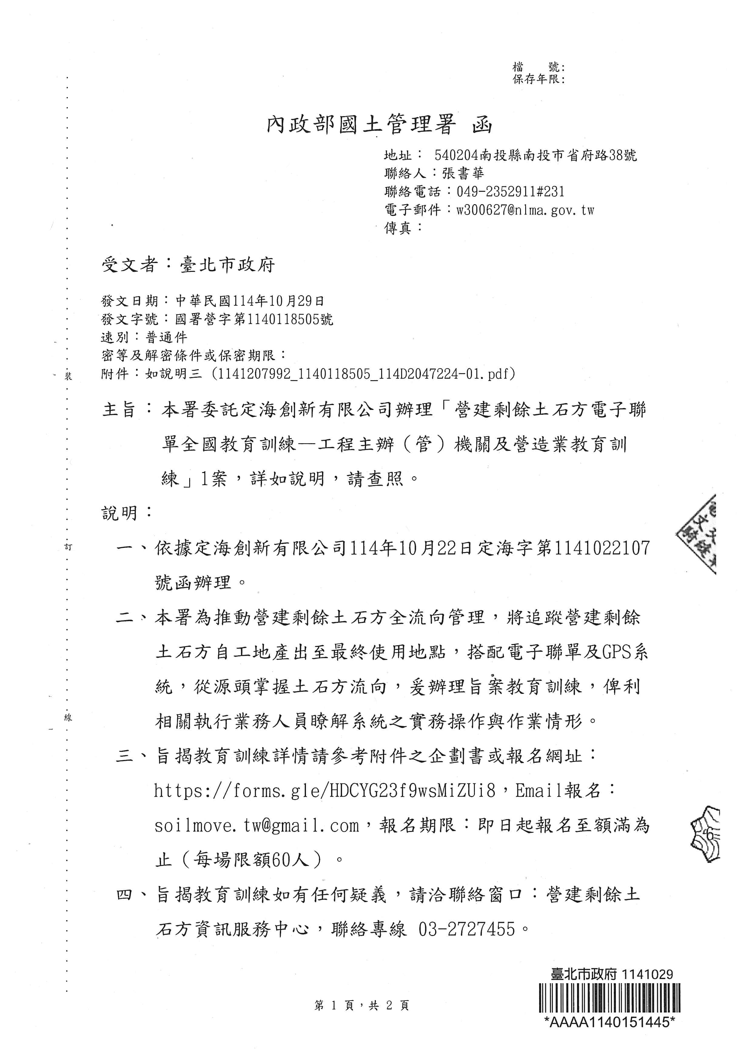臺北市建築管理工程處函轉內政部國土管理署委託定海創新有限公司辦理「營建剩餘土石方電子聯單全國教育訓練一工程主辦(管)機關及營造業教育訓練」一案