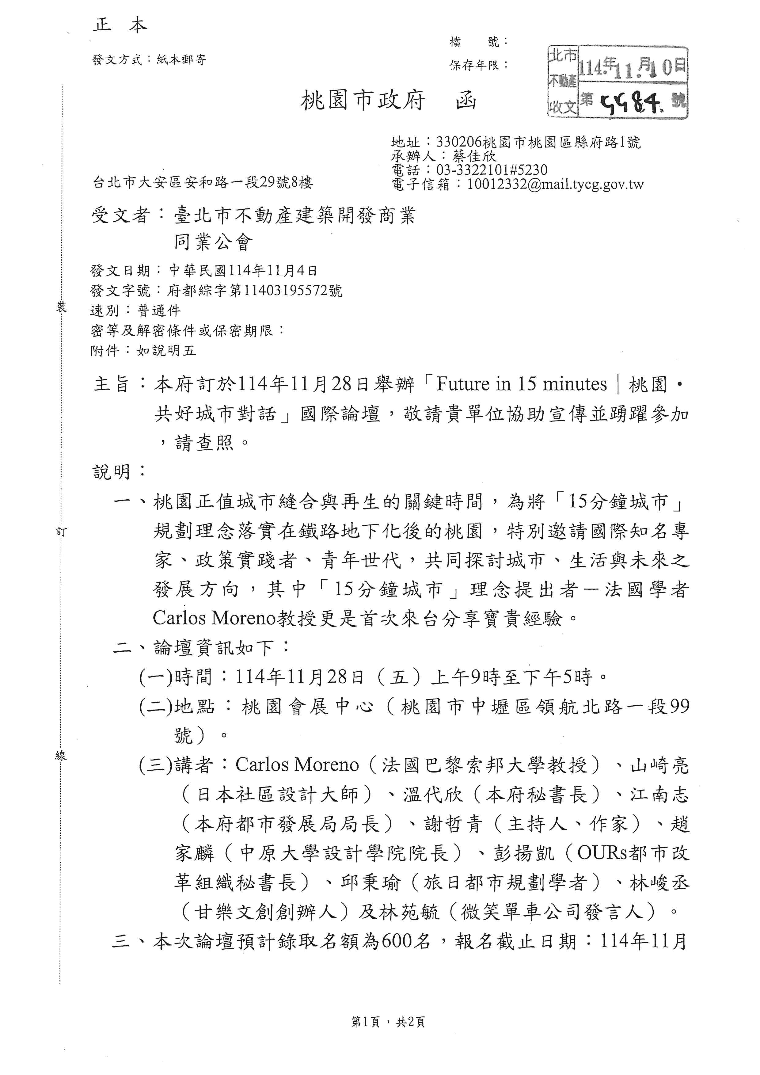 轉知桃園市政府訂於114年11月28日舉辦「Future in 15 minutes〡桃園•共好城市對話」國際論壇,請查照