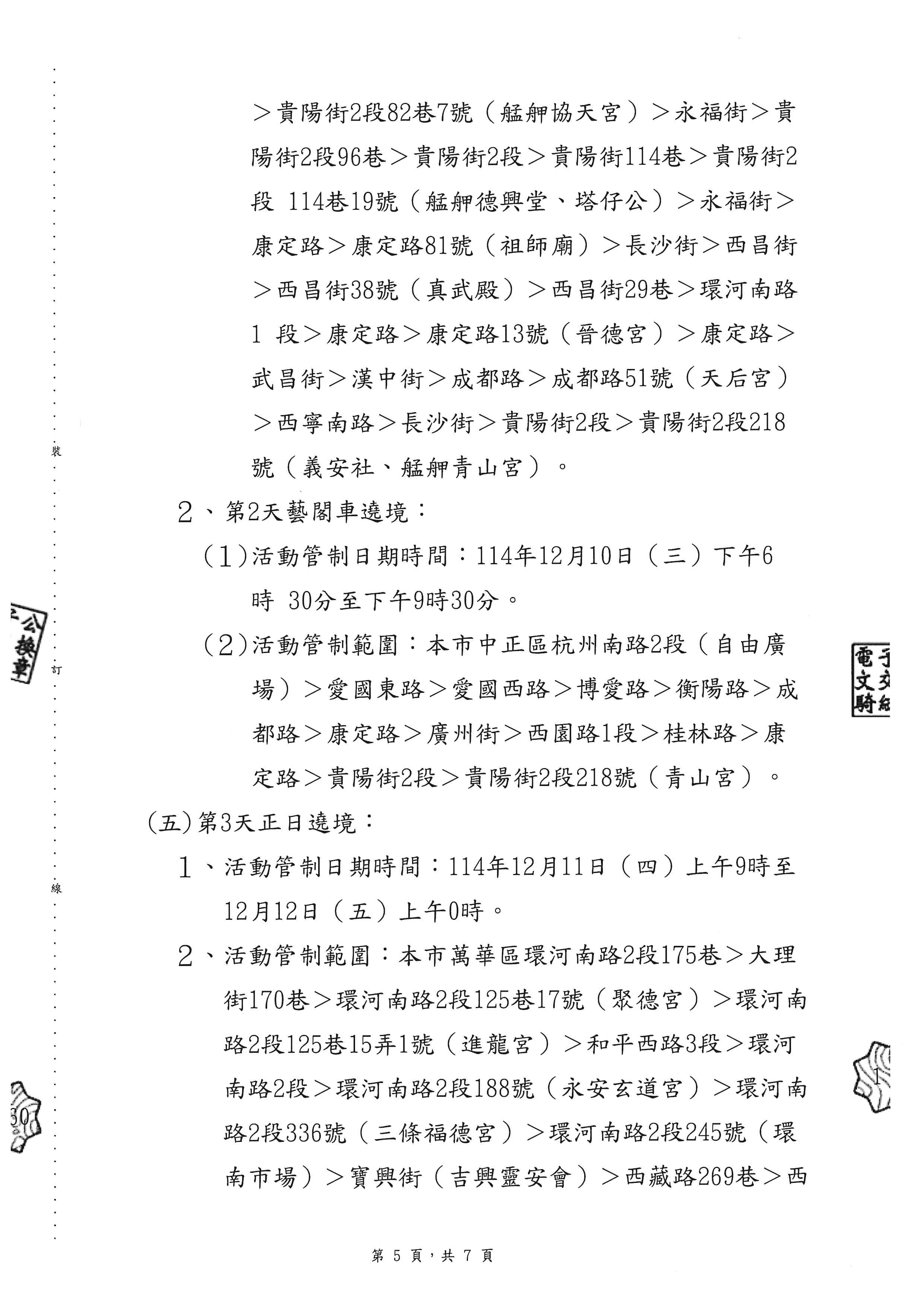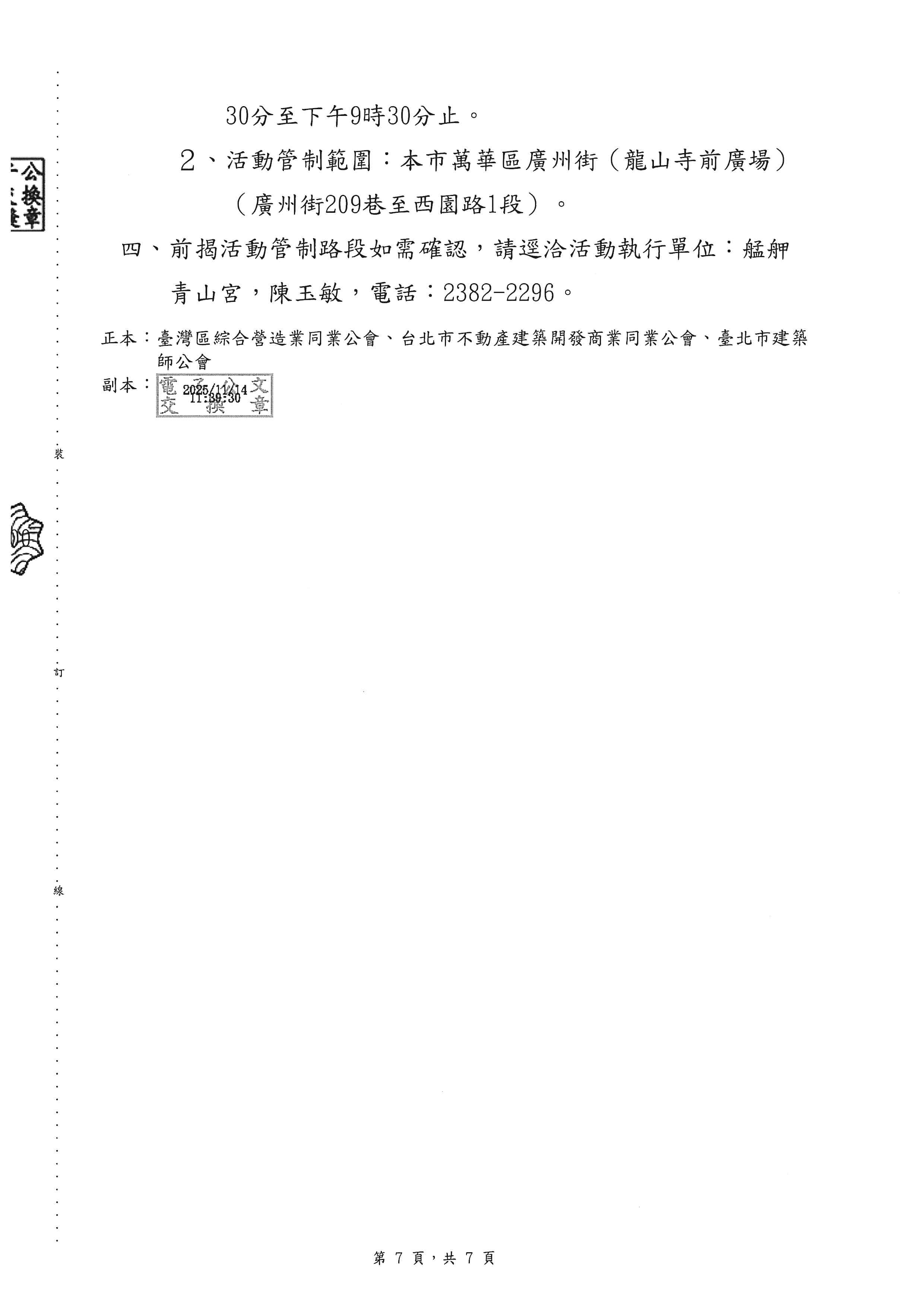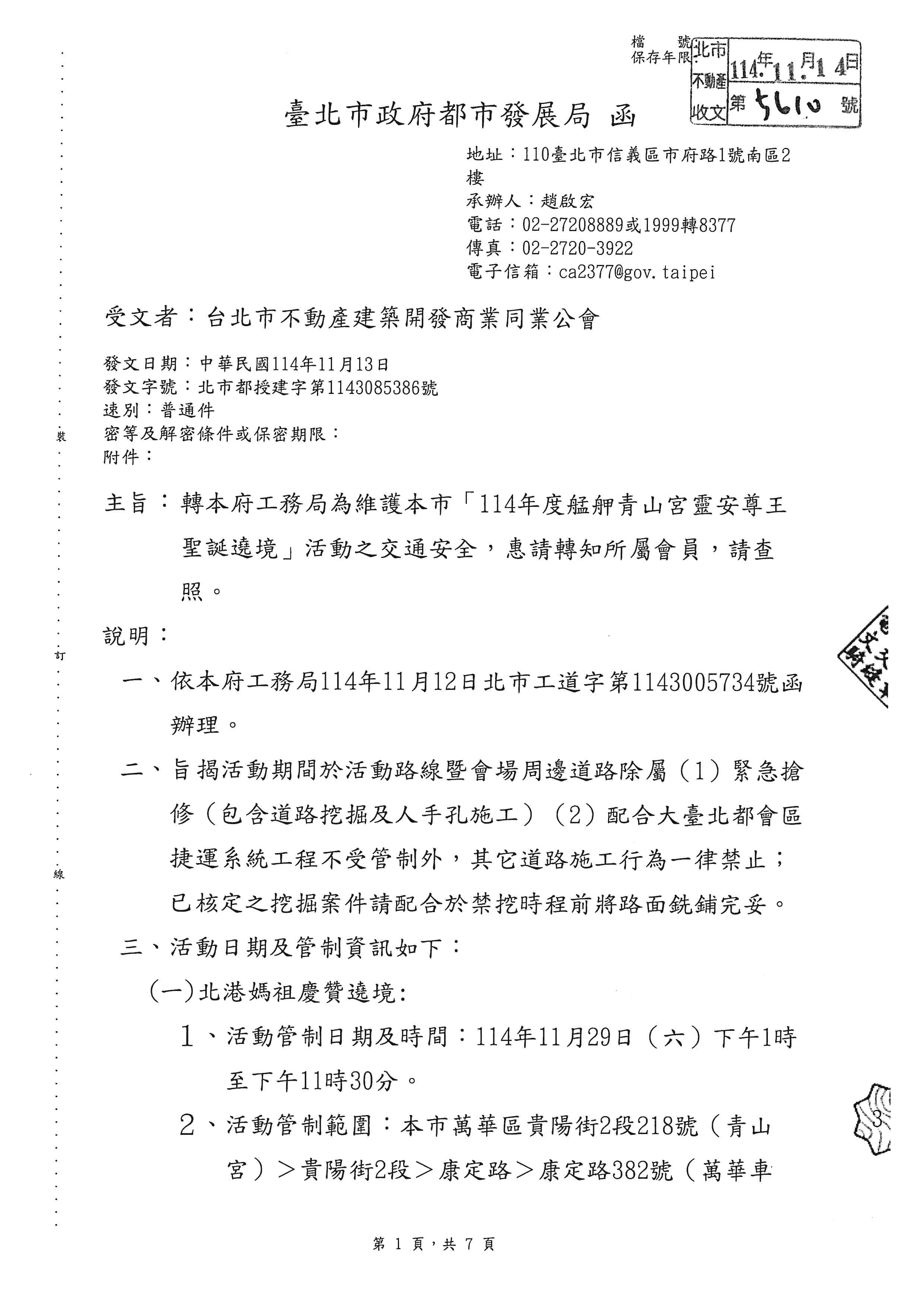 臺北市政府都市發展局轉臺北巿政府工務局為維護本市「114年度艋舺青山宮靈安尊王聖誕遶境」活動之交通安全,轉知會員配合辦理