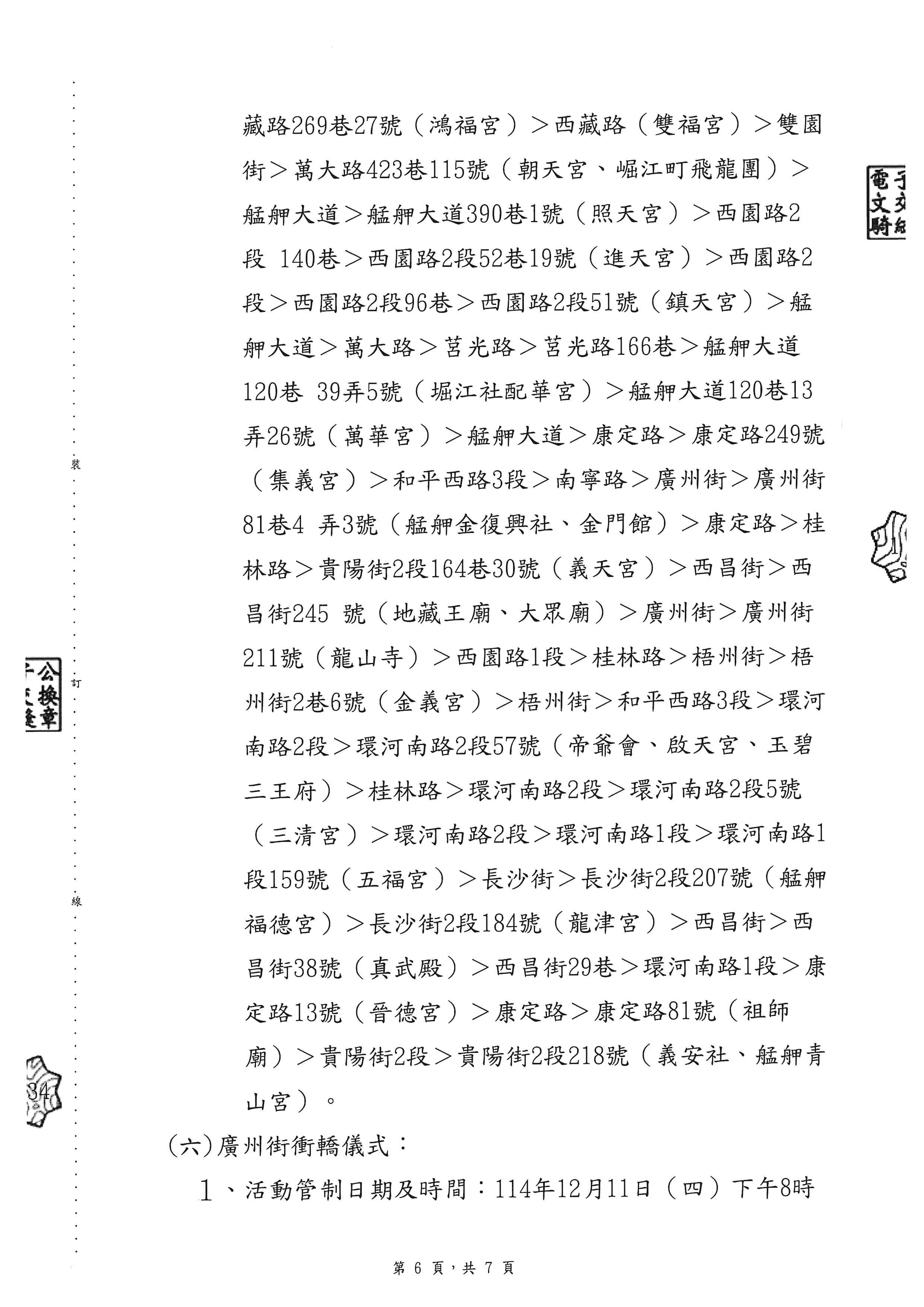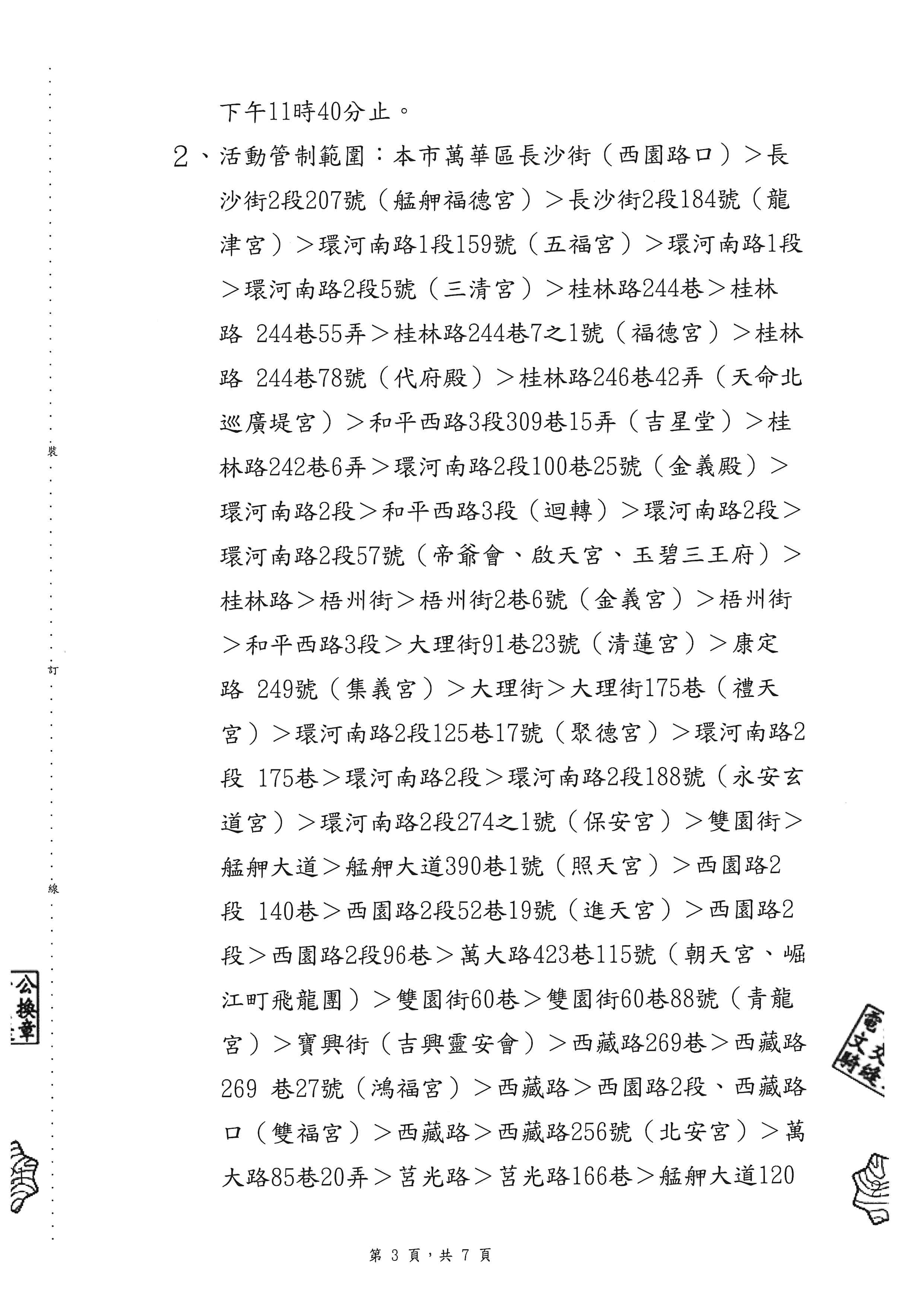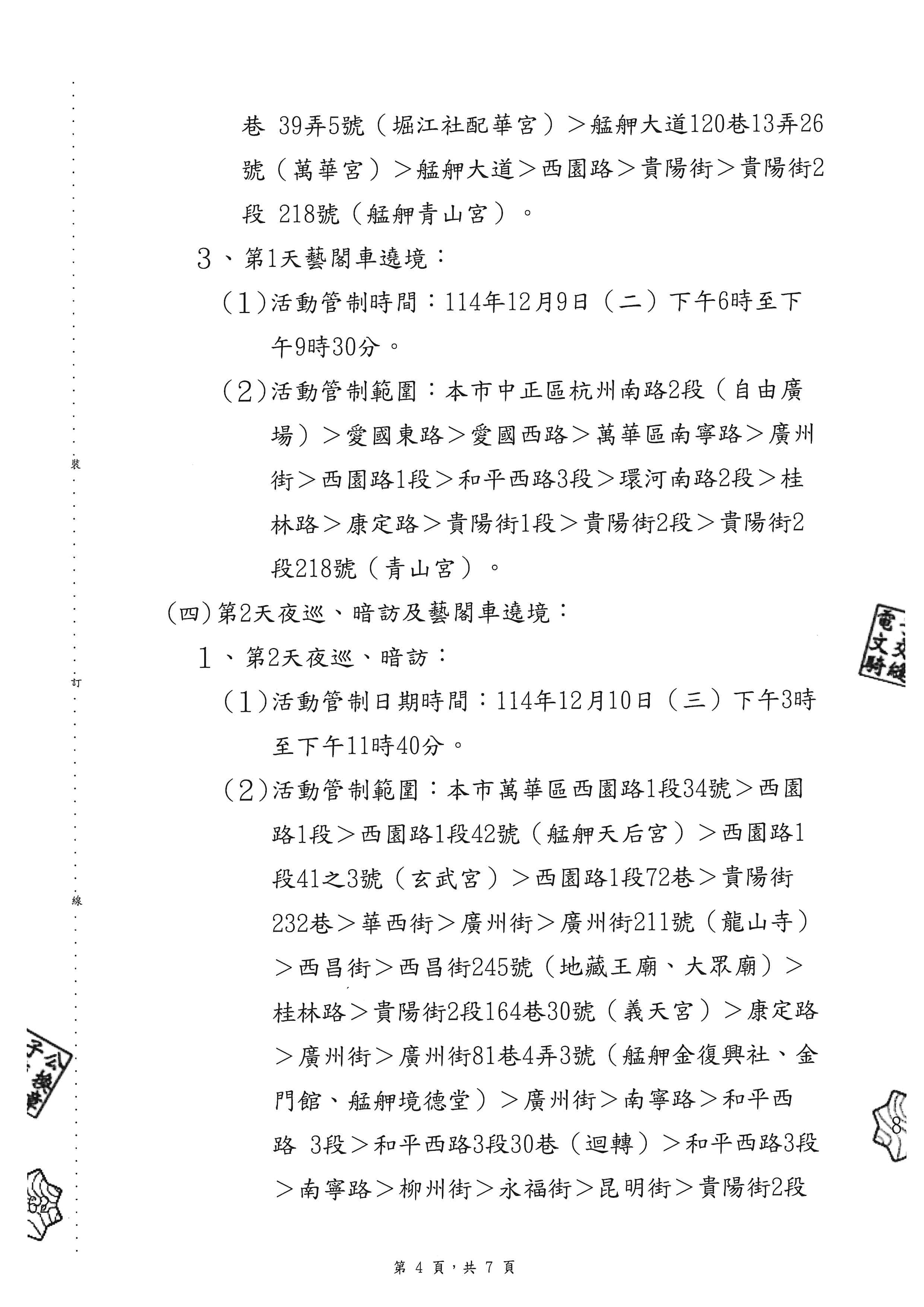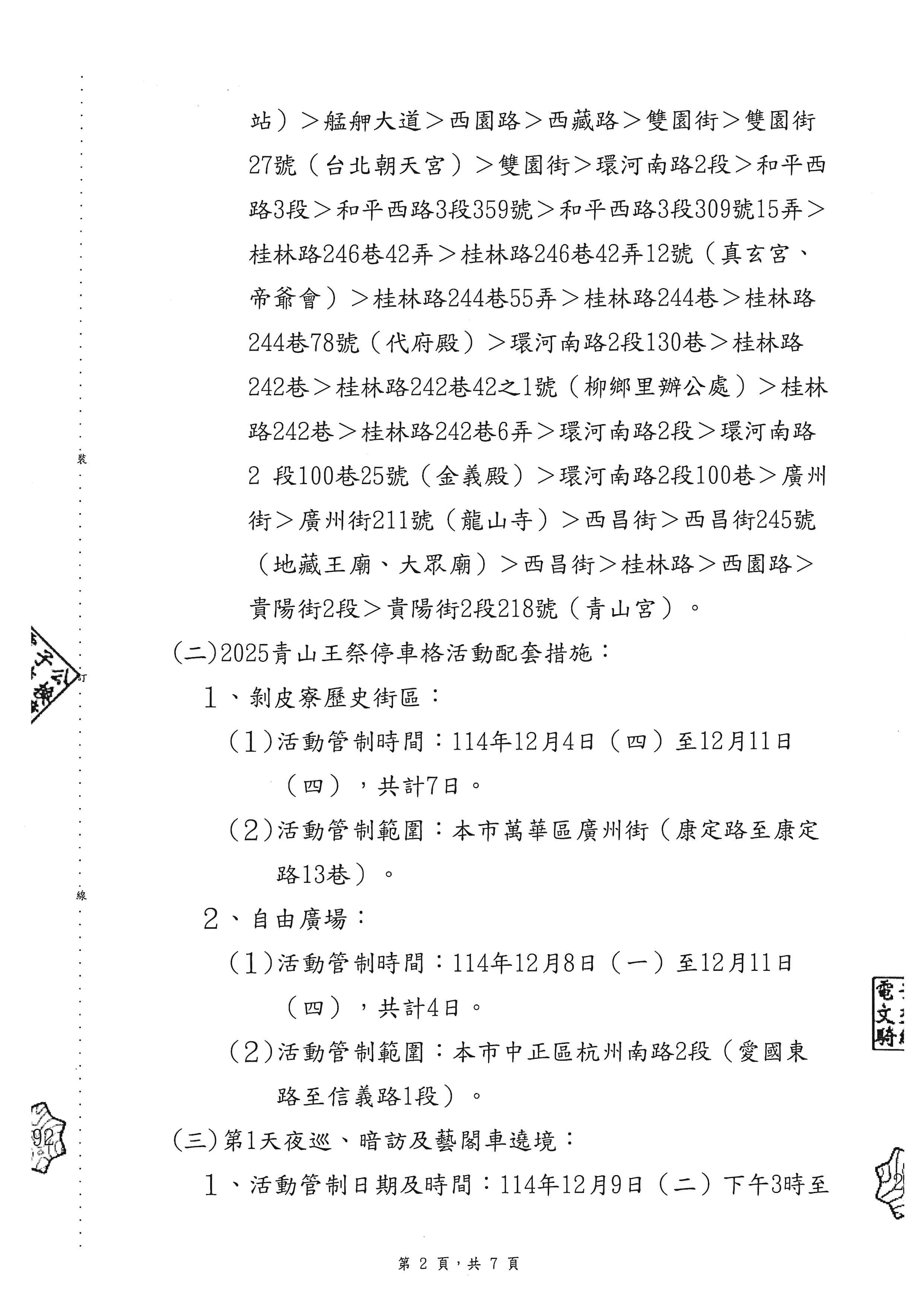 臺北市政府都市發展局轉臺北巿政府工務局為維護本市「114年度艋舺青山宮靈安尊王聖誕遶境」活動之交通安全,轉知會員配合辦理