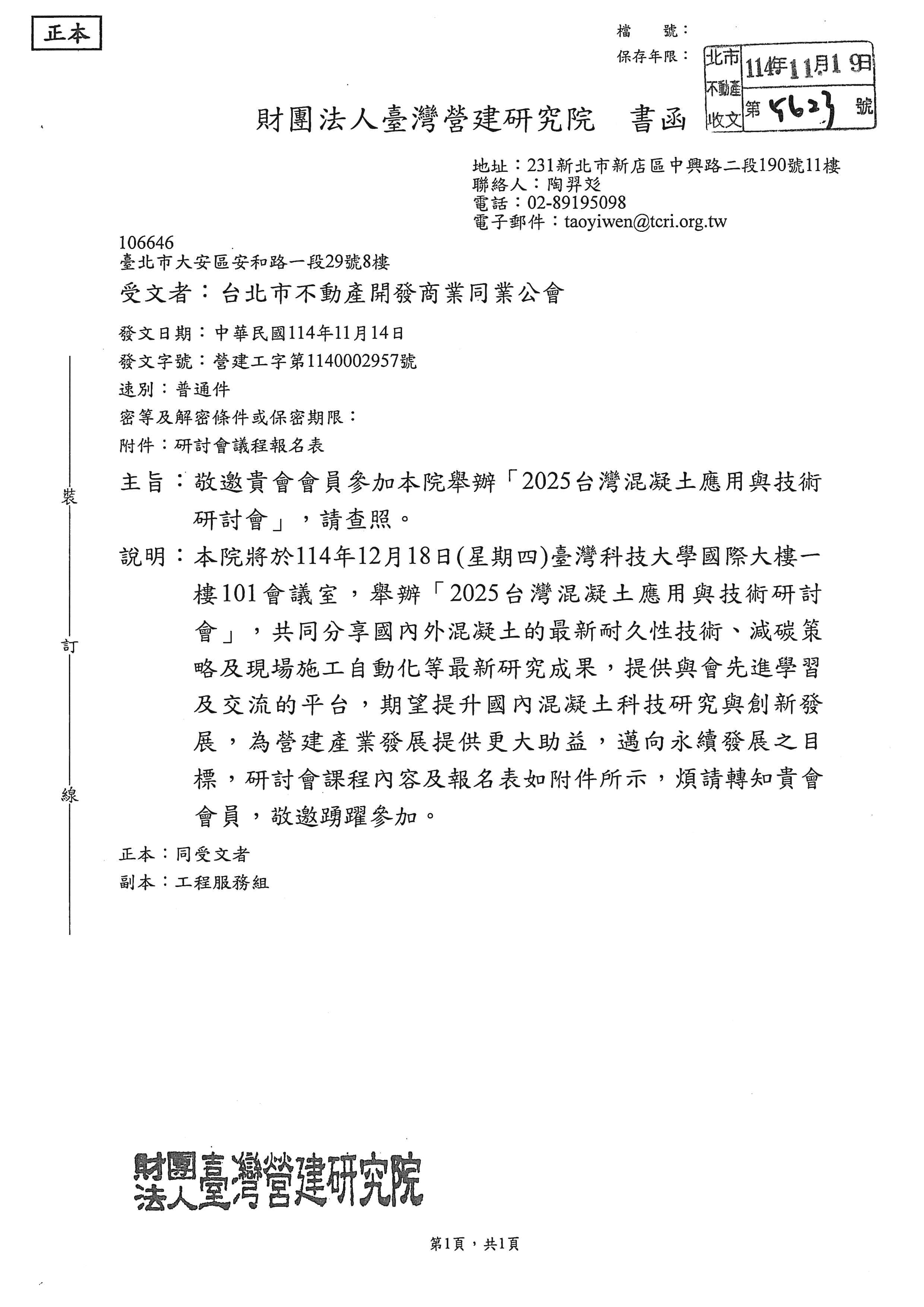 財團法人臺灣營建研究院敬邀會員參加該院舉辦「2025台灣混凝土應用與技術研討會」,請查照。