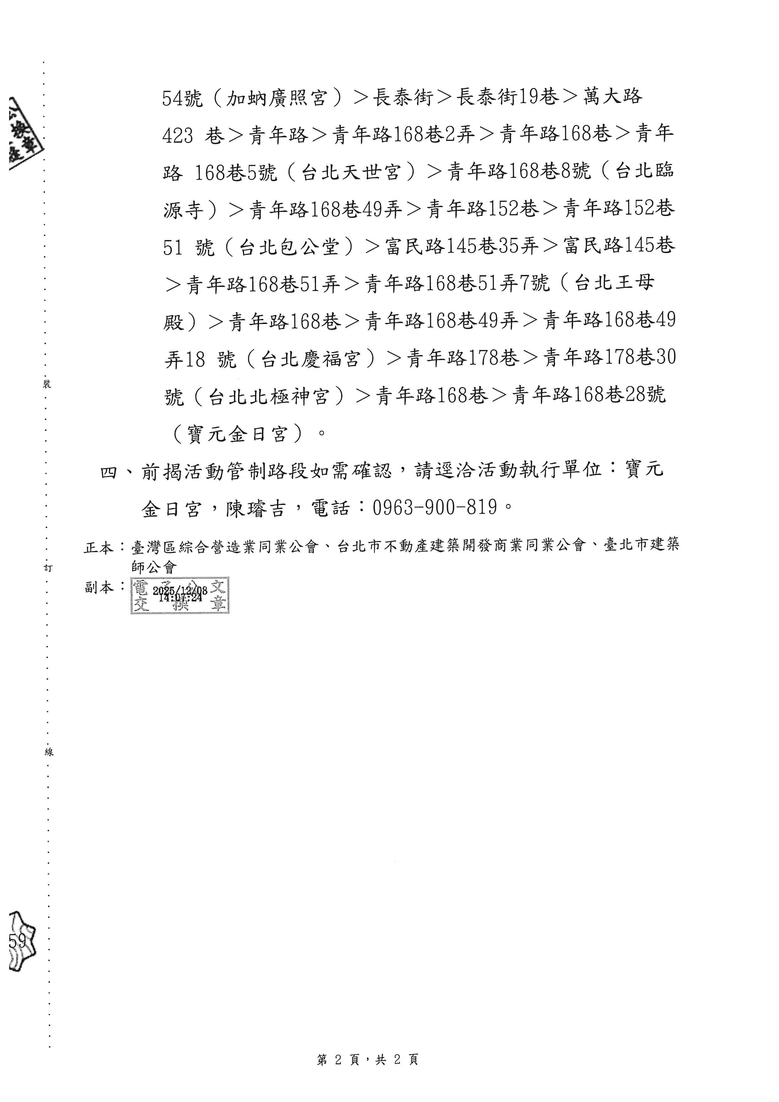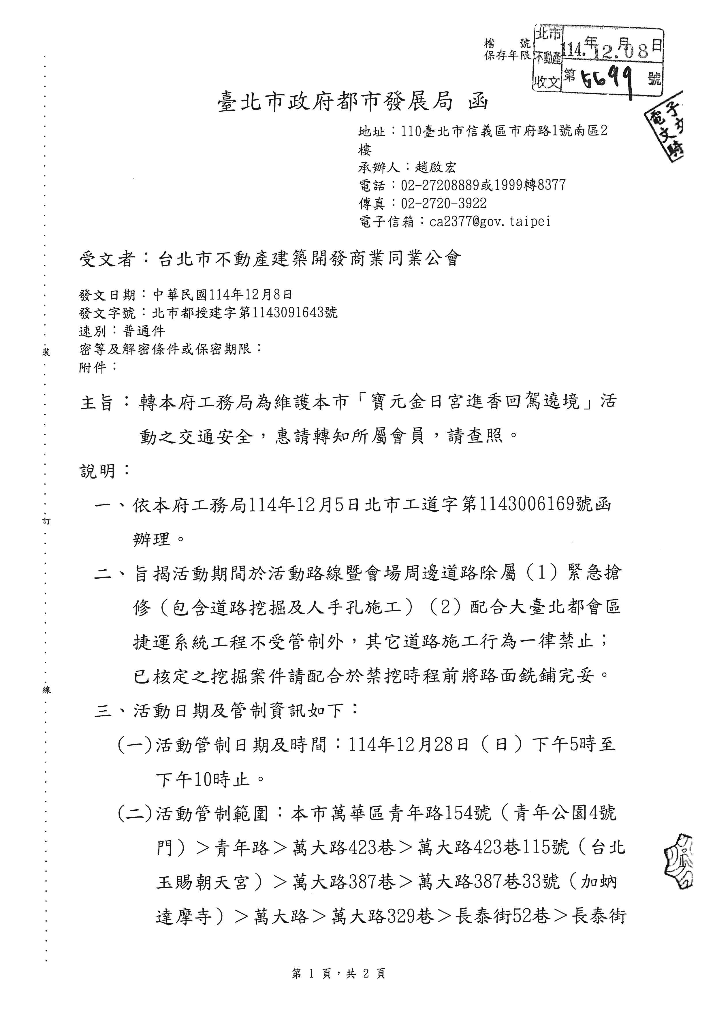臺北市政府都市發展局轉臺北巿政府工務局為維護本市「寶元金日宮進香回駕遶境」活動之交通安全,轉知會員配合辦理