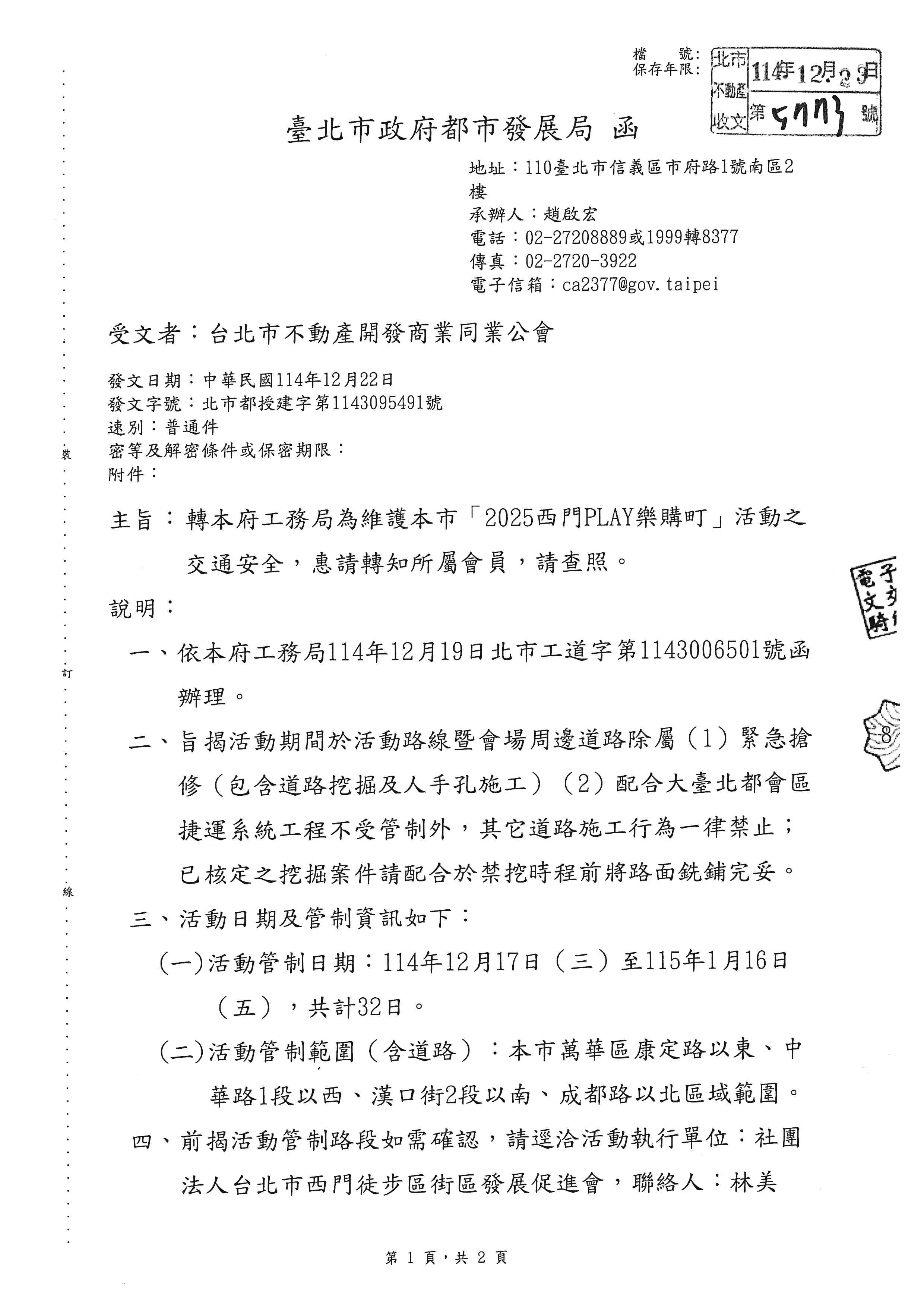 臺北市政府都市發展局轉臺北巿政府工務局為維護本市「2025西門PLAY樂購町」活動之交通安全,轉知會員配合辦理