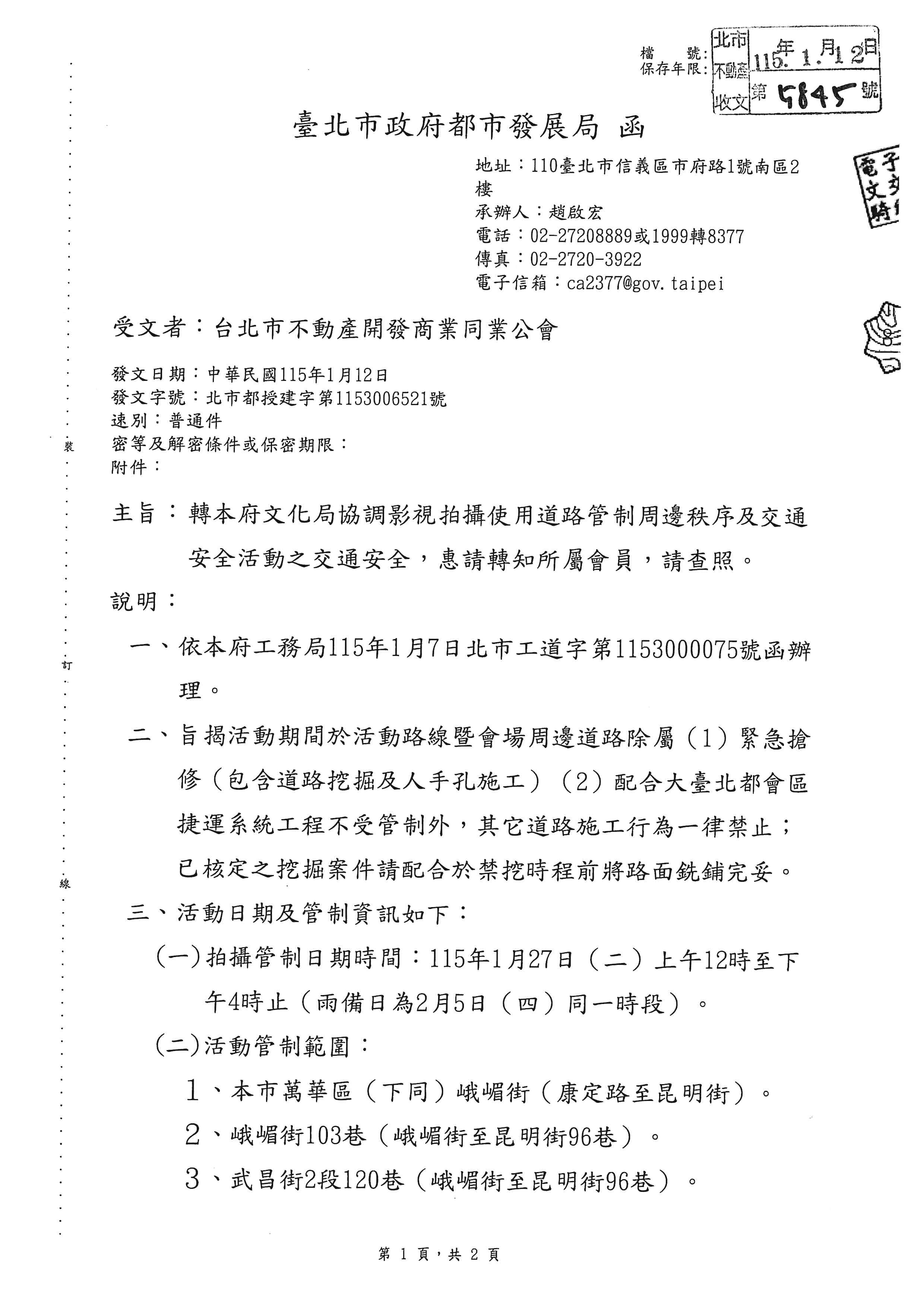 臺北市政府都市發展局轉臺北巿政府府文化局協調影視拍攝使用道路管制周邊秩序及交通安全活動之交通安全,轉知會員配合辦理