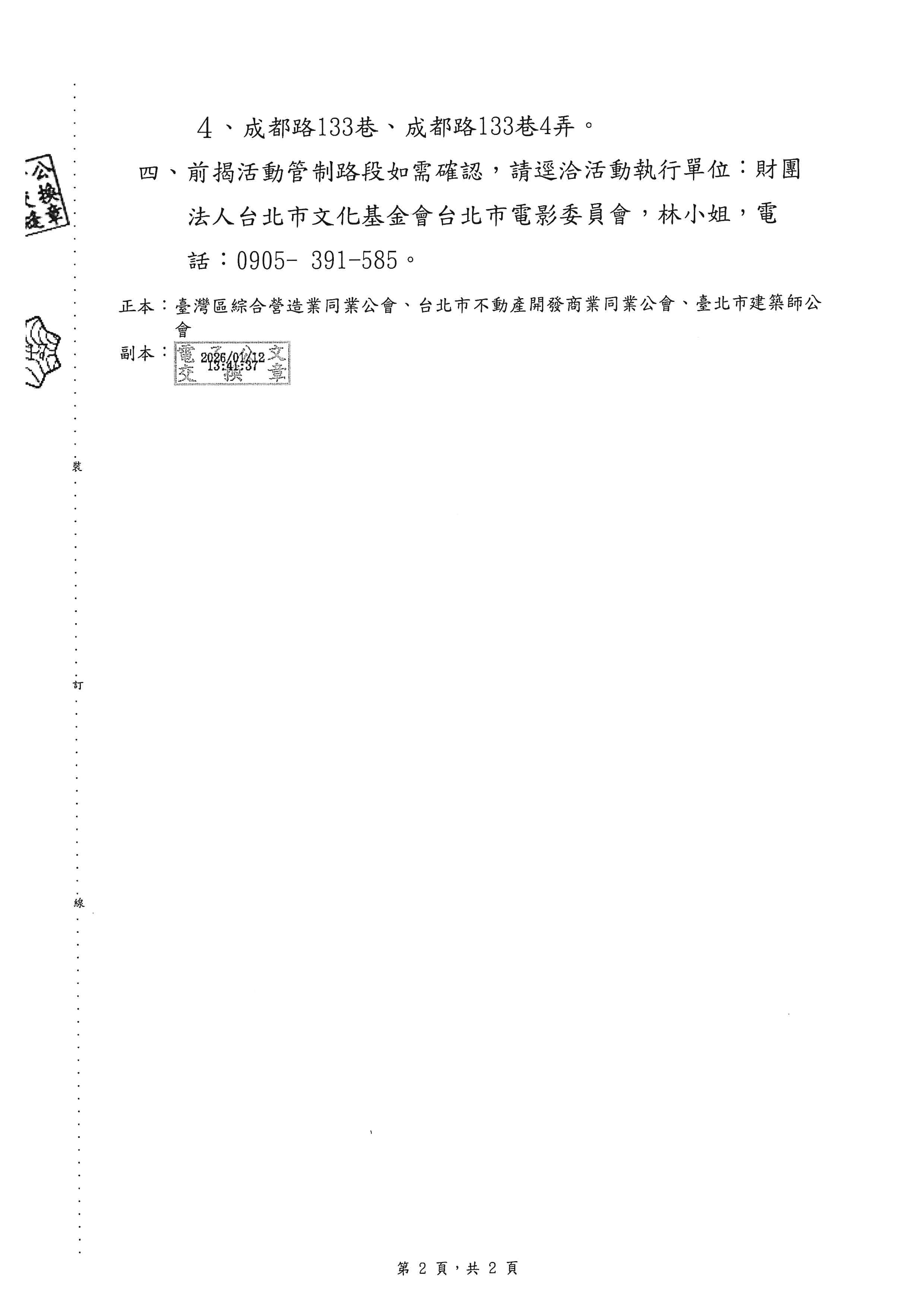 臺北市建築管理工程處函轉臺北巿政府工務局宣達為維護文化局協調影視拍攝使用道路管制周邊秩序及交通安全配合辦理事宜