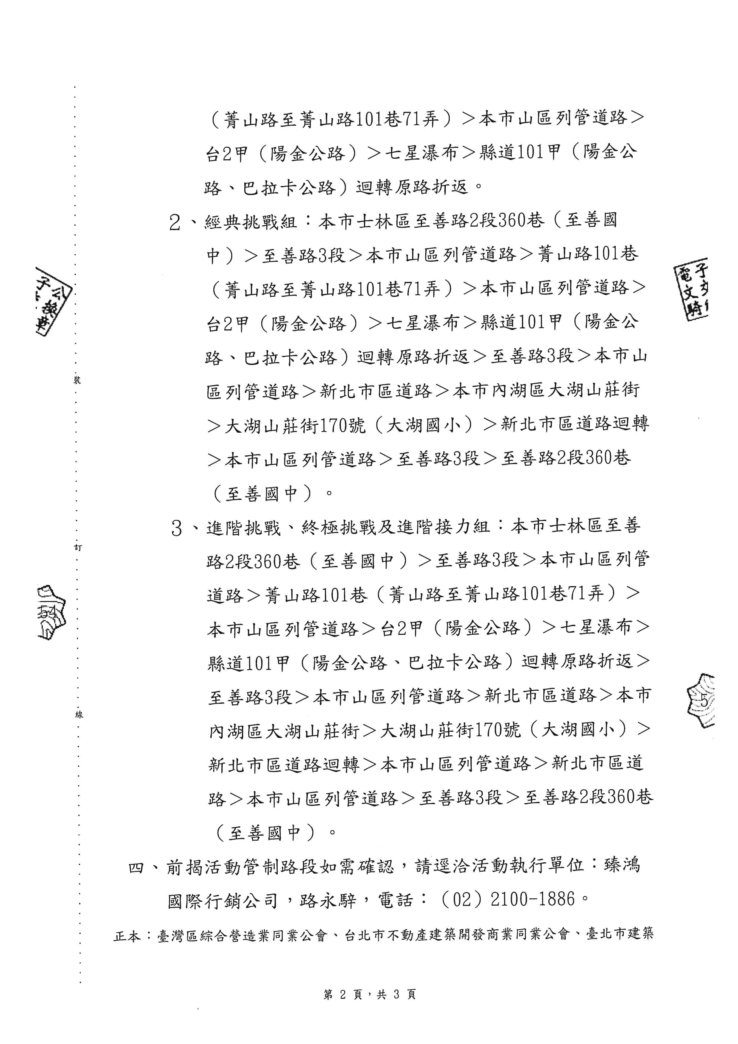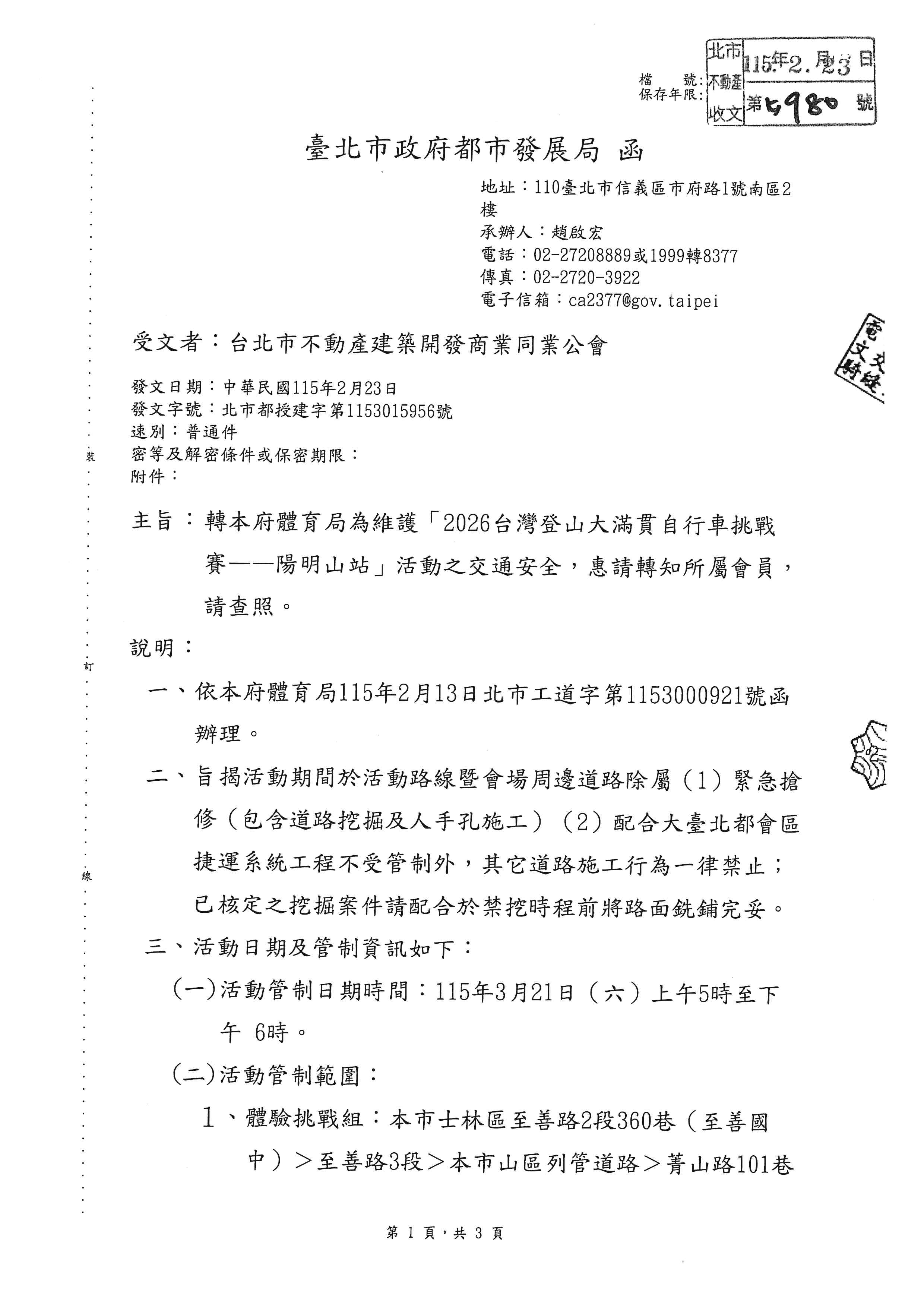 臺北市政府都市發展局函轉臺北巿政府體育局為維護「2026台灣登山大滿貫自行車挑戰賽一一陽明山站」活動之交通安全,轉知會員配合辦理