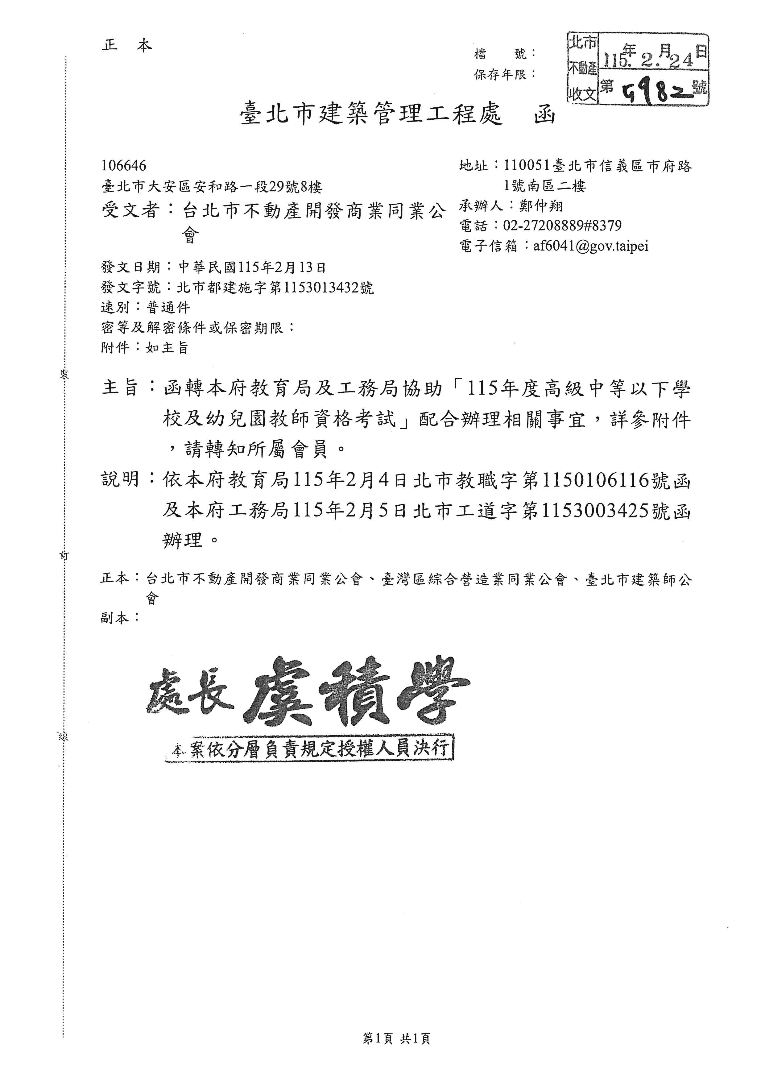 臺北市建築管理工程處函轉臺北巿政府教育局及工務局協助「115年度高級中等以下學校及幼兒園教師資格考試」配合辦理相關事宜,詳參附件,轉知會員知悉