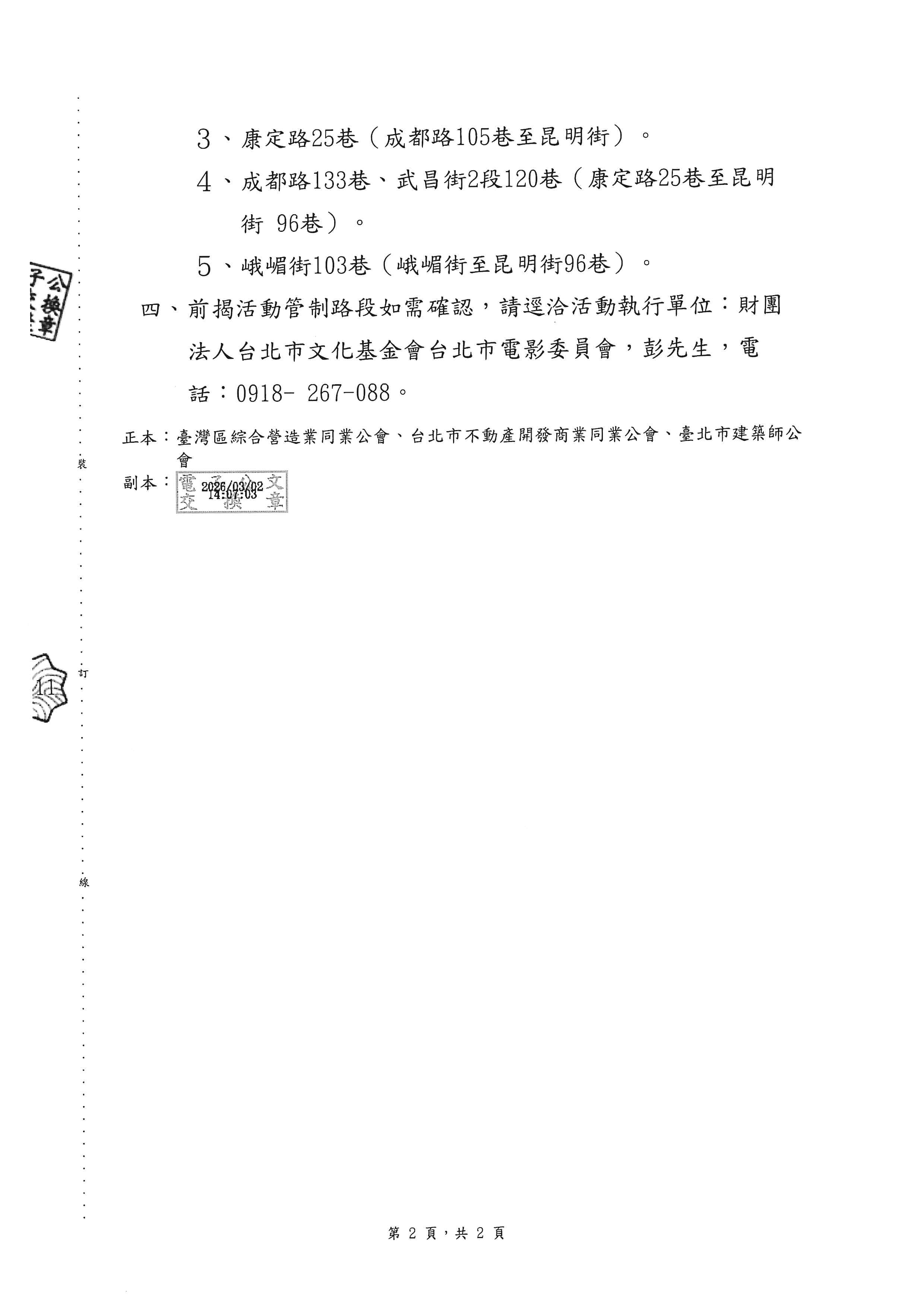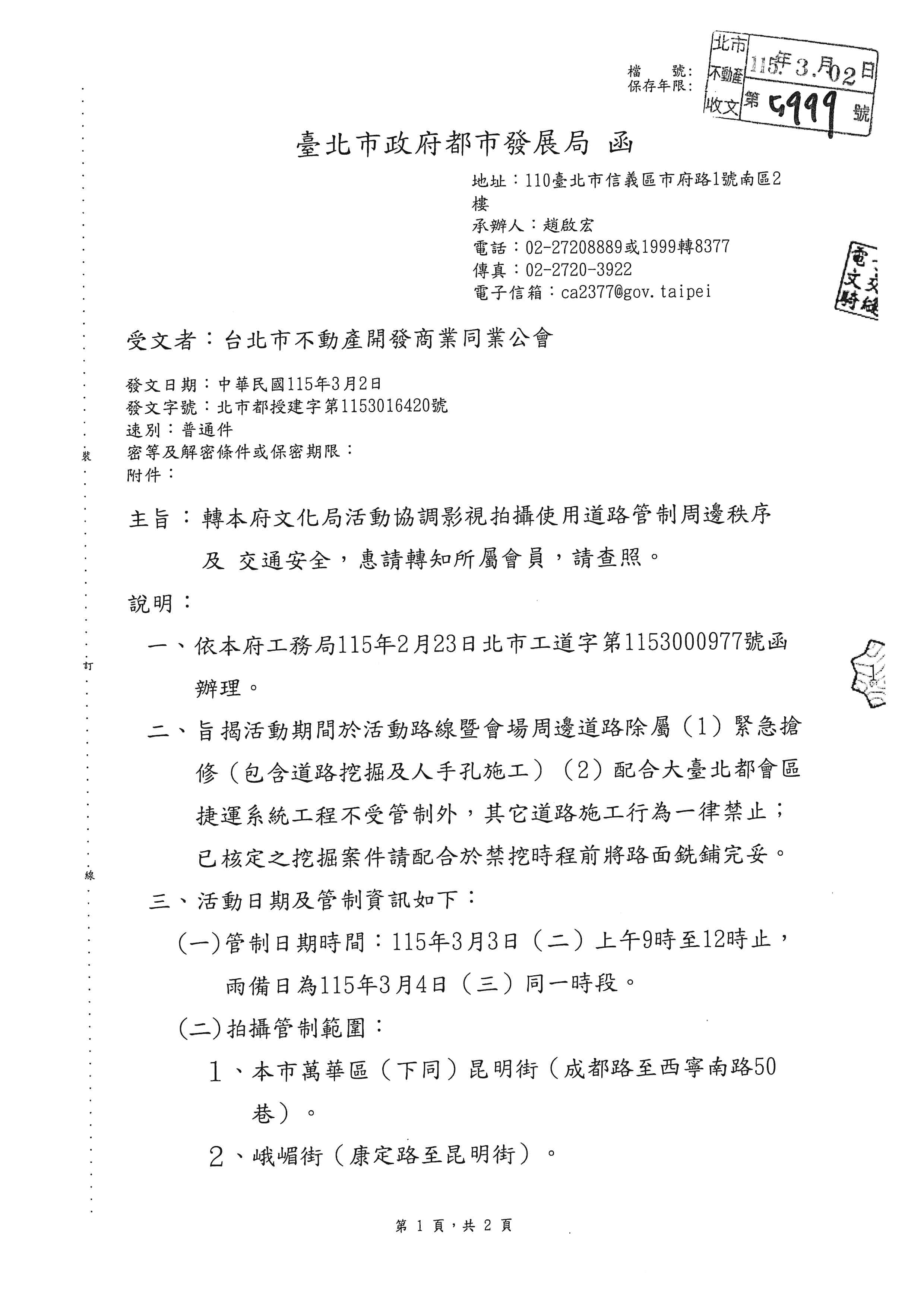 臺北市政府都市發展局函轉臺北巿政府文化局活動協調影視拍攝使用道路管制周邊秩序及交通安全,轉知會員配合辦理