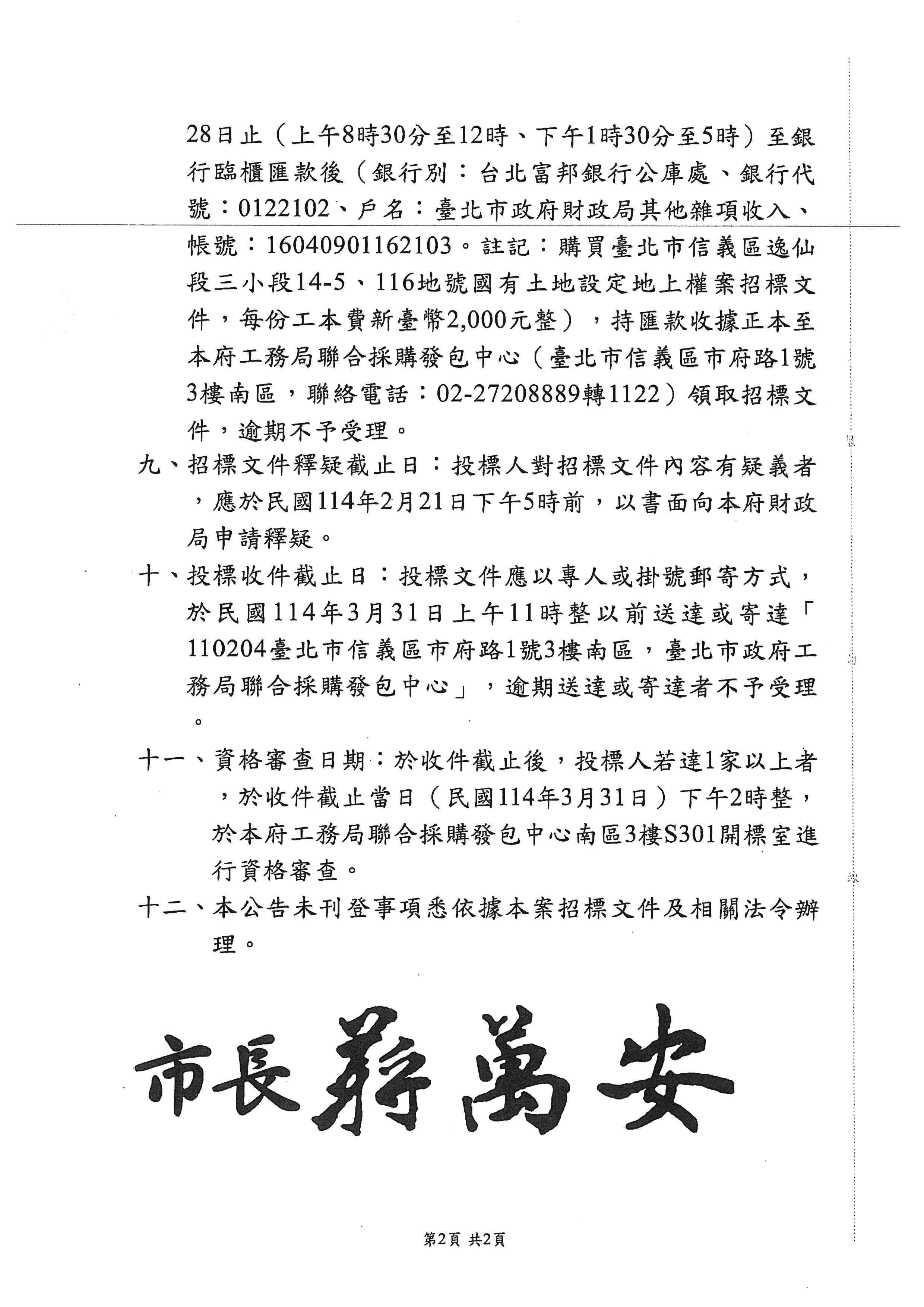 轉知臺北巿政府財政局辦理「臺北巿信義區逸仙段三小段14-5、116地號國有土地設定地上權案」已於114年1月15日公告招商,相關資訊請至該局官網新聞稿查詢 公告時間:2025 年 01 月 20 日 文件下載