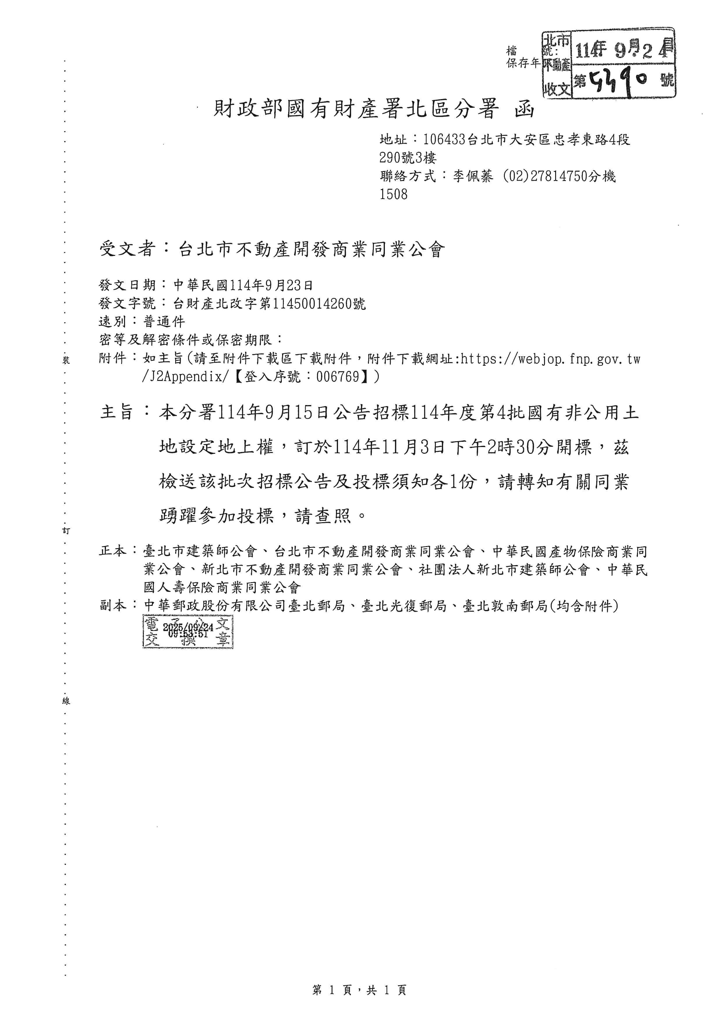 財政部國有財產署北區分署114年9月15日公告招標114年度第4批國有非公用土地設定地上權,訂於114年11月3日下午2時30分開標,茲檢送該批次招標公告及投標須知各1份,轉知會員踴躍參加投標 公告時間:2025 年 10 月 01 日
