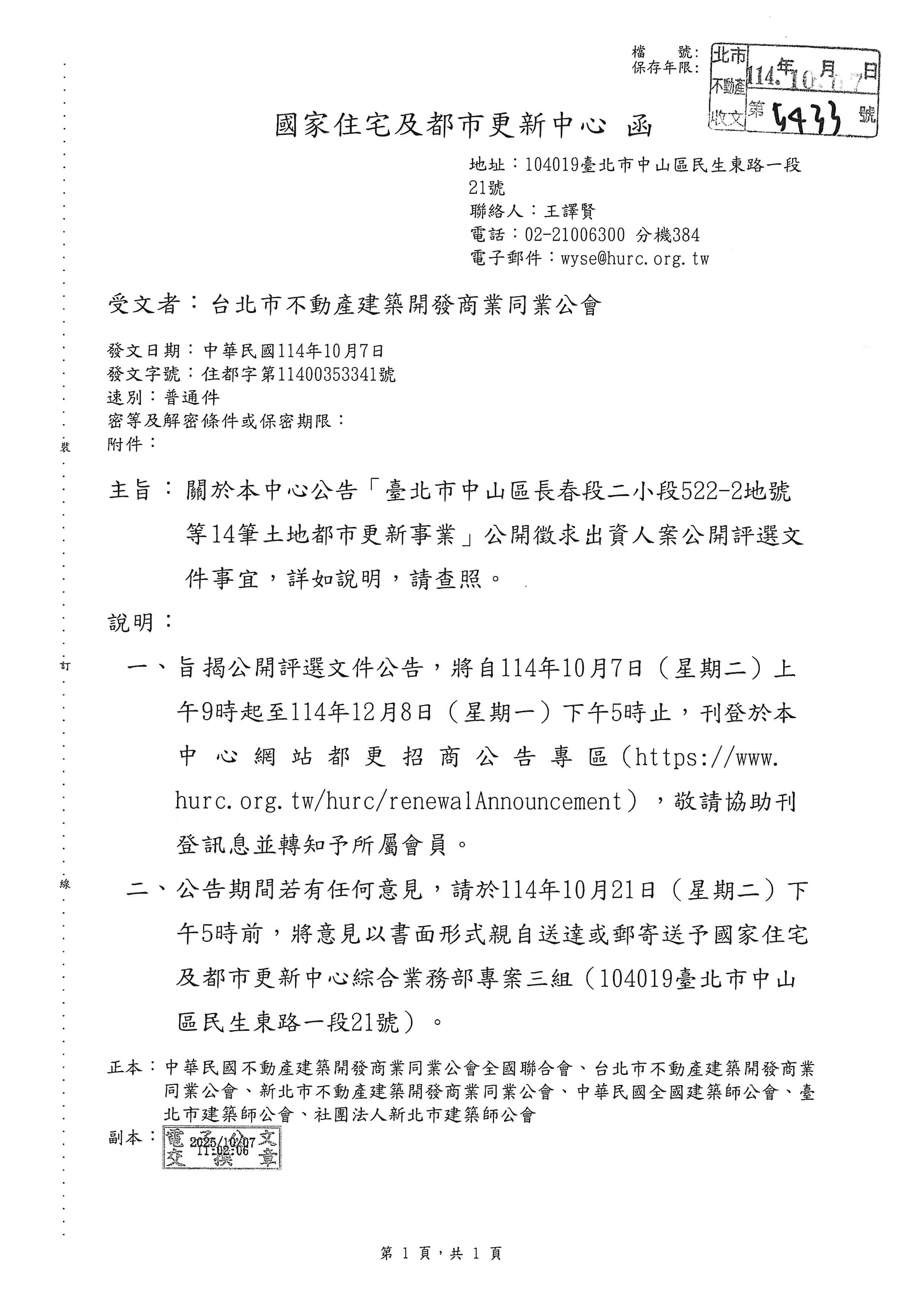 國家住宅及都市更新中心公告「臺北市中山區長春段二小段522-2地號等14筆土地都市更新事業」公開徴求出資人案公開評選文件事宜