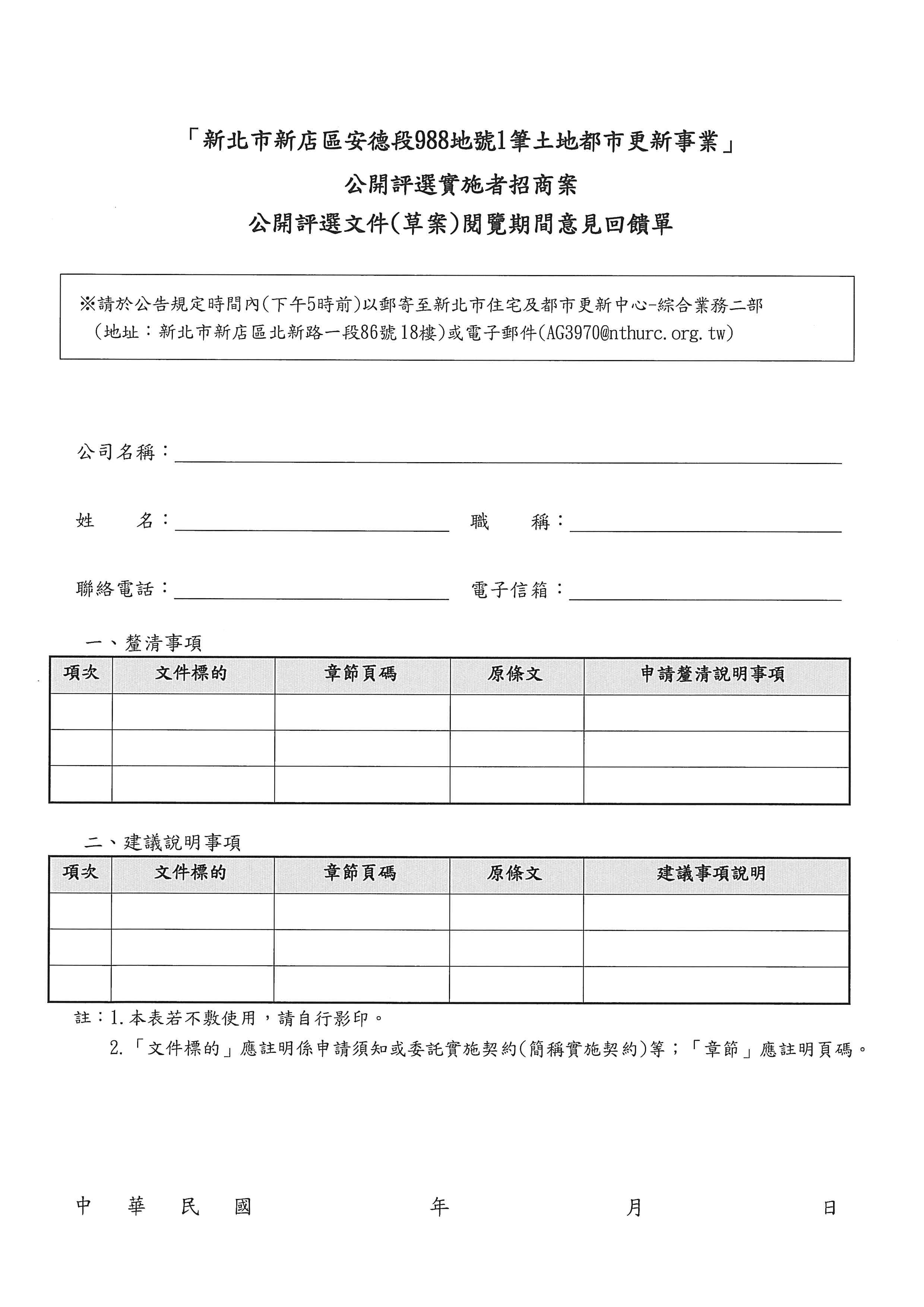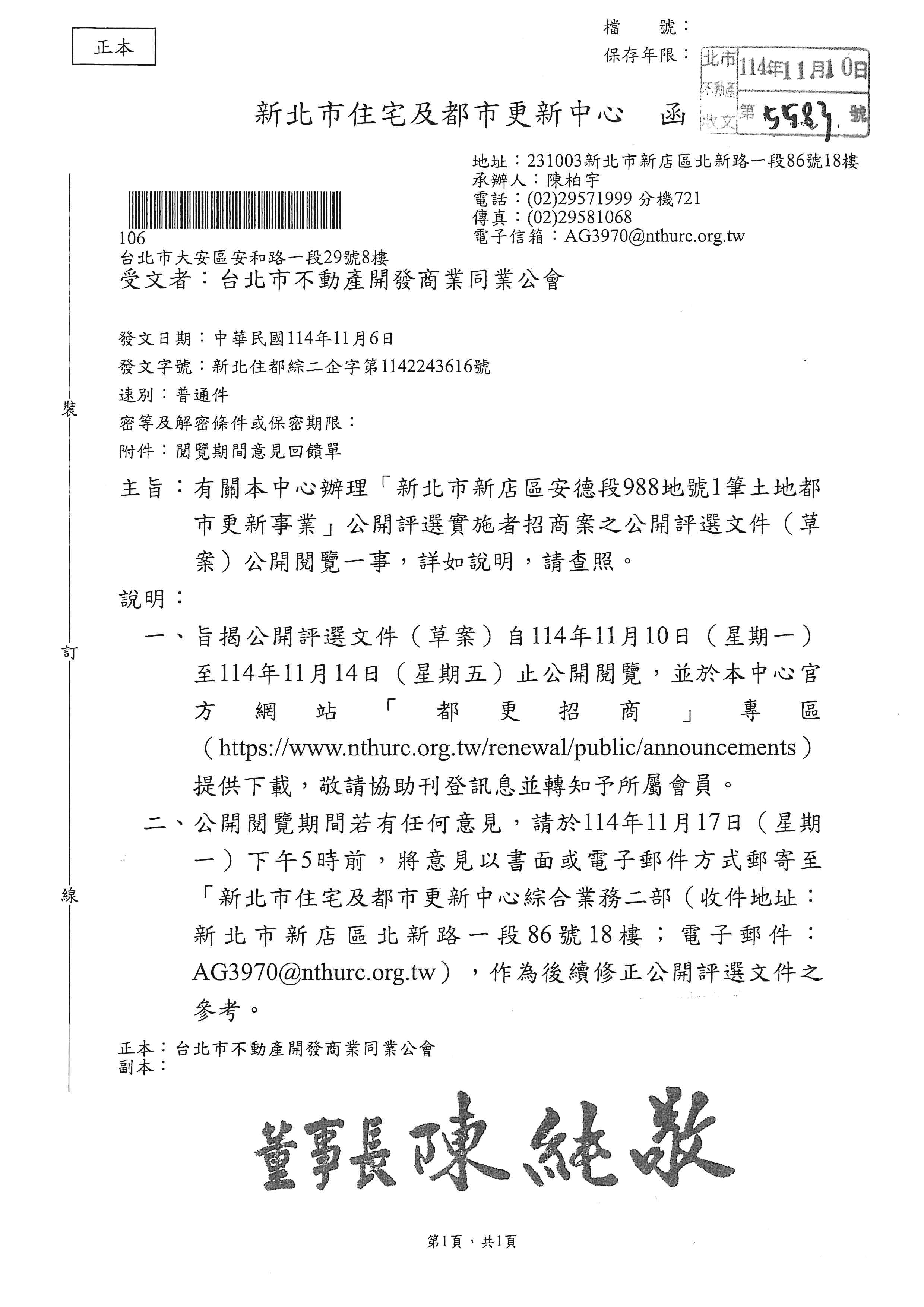 轉知新北市住宅及都市更新中心辦理「新北市新店區安德段988地號1筆土地都市更新事業」公開評選實施者招商案之公開評選文件(草案)公開閱覽一事