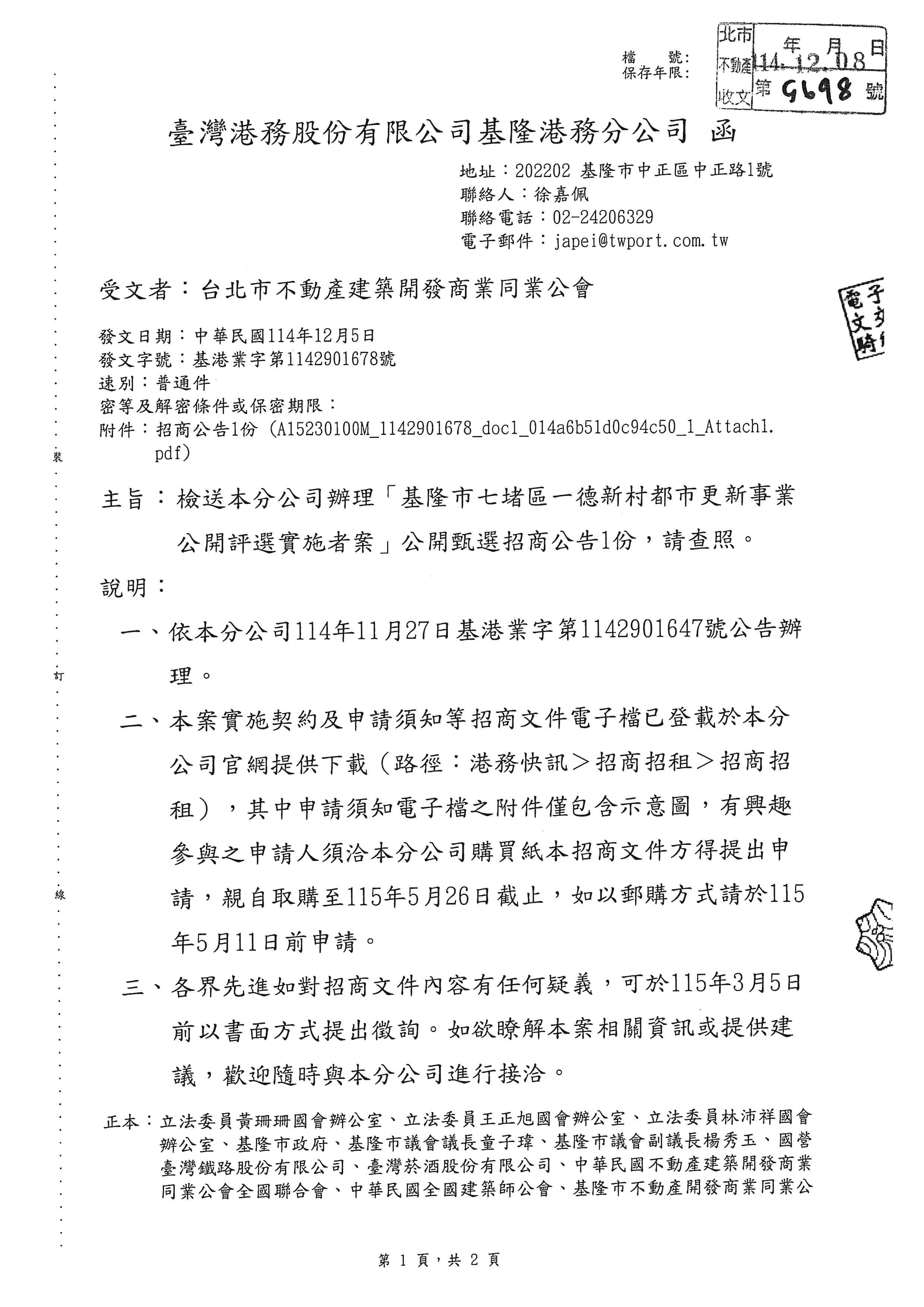 臺灣港務股份有限公司基隆港務分公司檢送該分公司辦理「基隆市七堵區一德新村都市更新事業公開評選實施者案」公開甄選招商公告1份,請查照