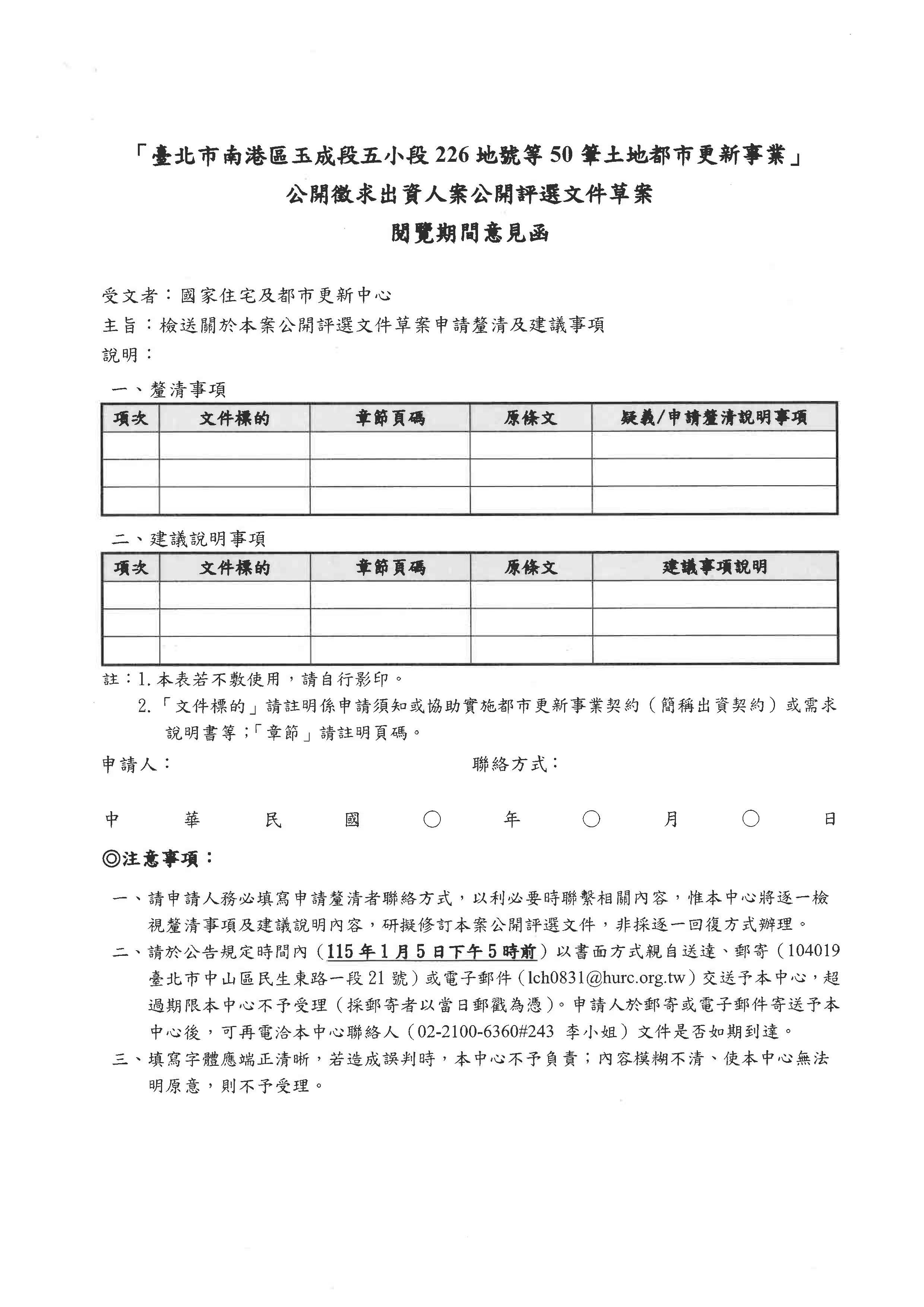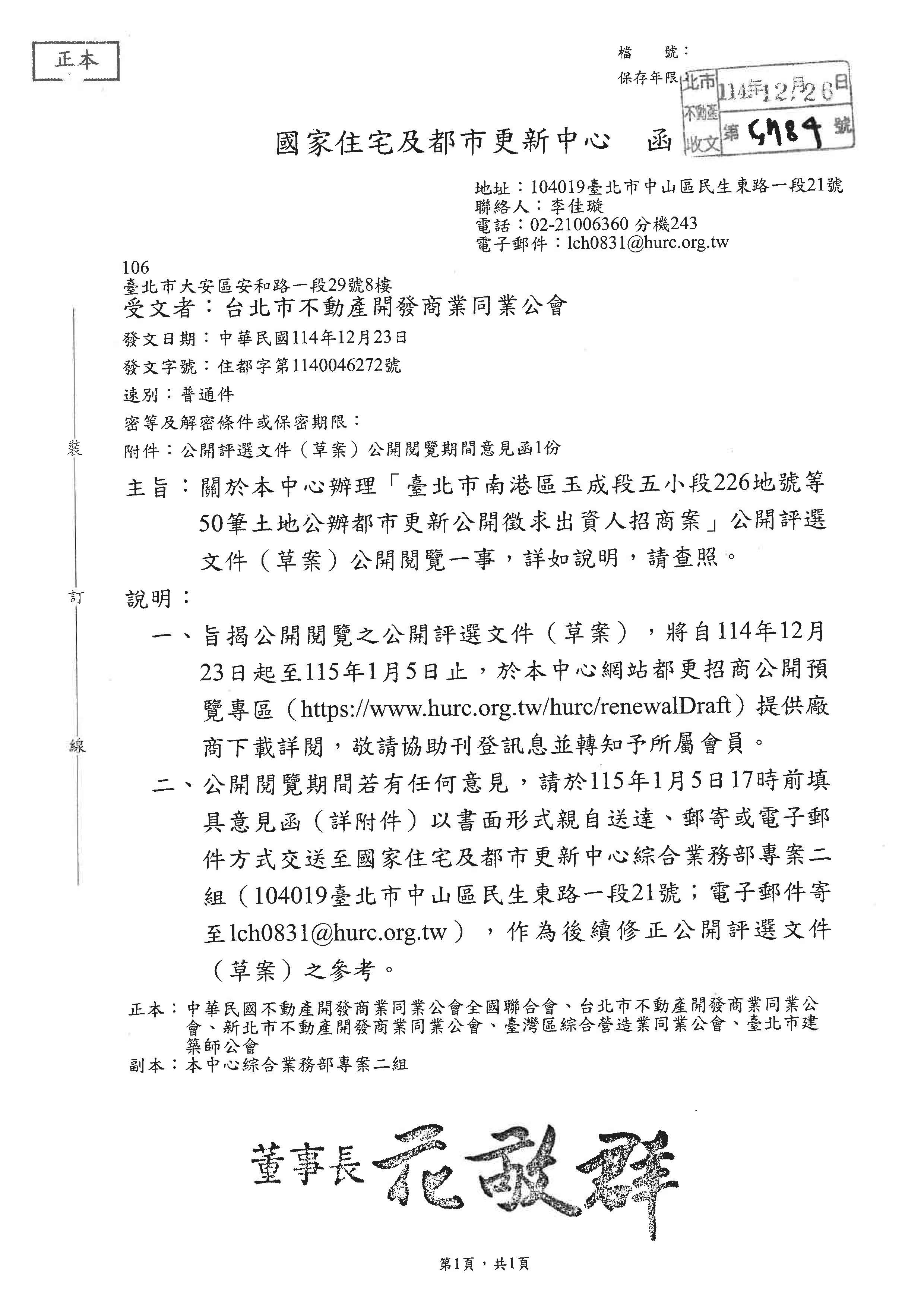 國家住宅及都市更新中心辦理「臺北市南港區玉成段五小段226地號等50筆土地公辦都市更新公開徵求出資人招商案」公開評選文件(草案)公開閱覽一事,請查照 公告時間:2025 年 12 月 31 日 文件下載