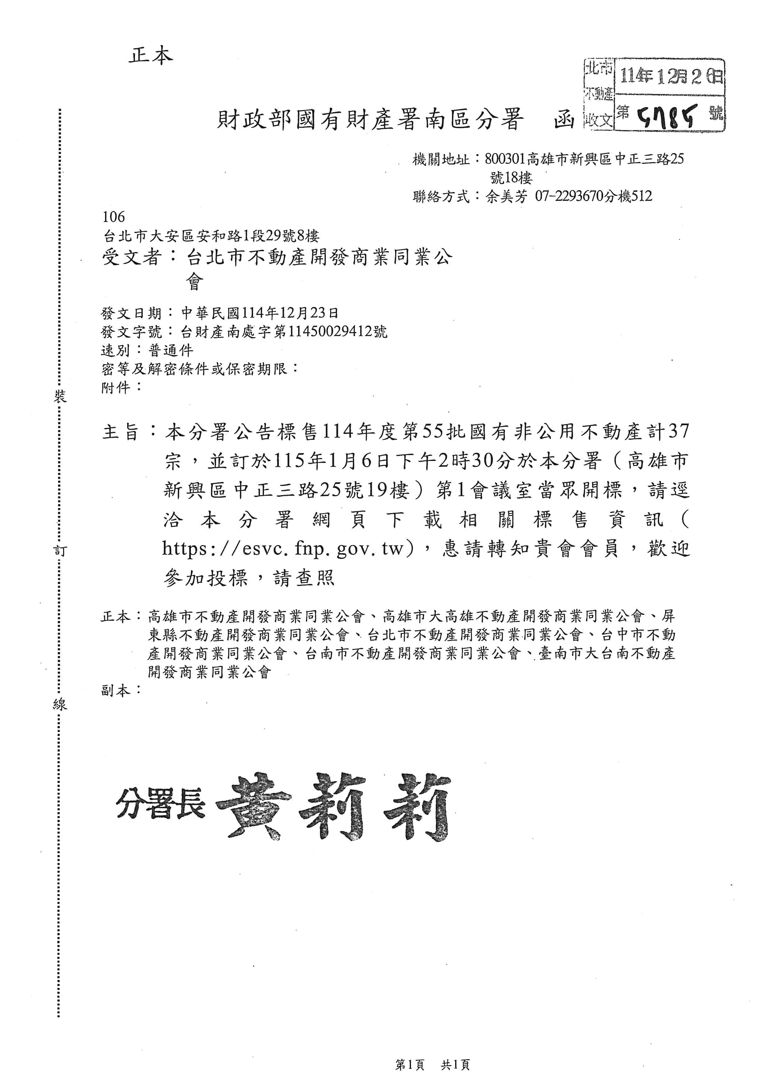 財政部國有財產署南區分署公告標售114年度第55批國有非公用不動產計37宗,並訂於115年1月6日下午2時30分於該分署(高雄市新興區中正三路25號19樓)第1會議室當眾開標,請逕洽該分署網頁下載相關標售資訊(https: //esvc. fnp. gov. tw),轉知會員參加投標 公告時間:2025 年 12 月 31 日