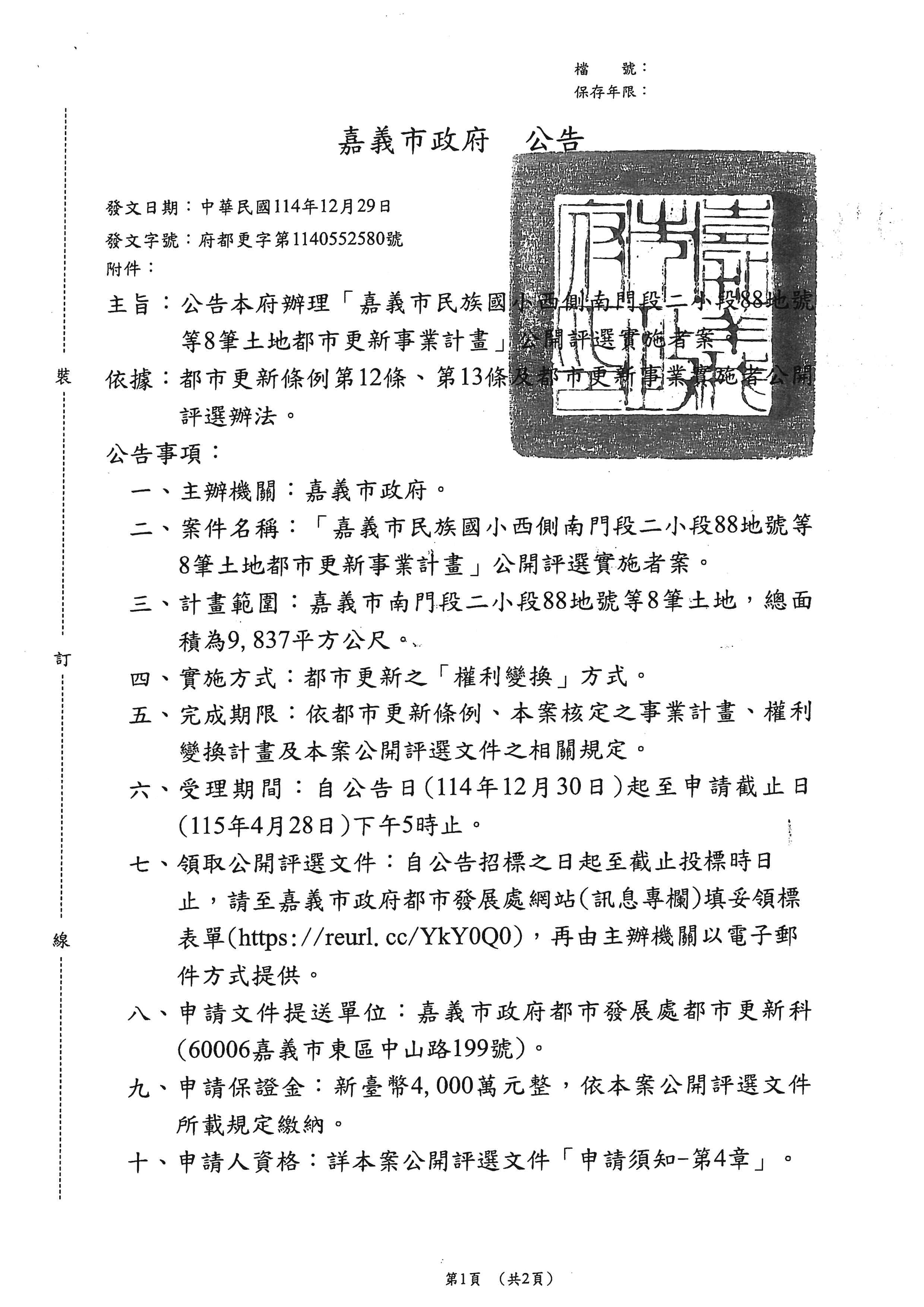 轉知嘉義市政府檢送「嘉義市民族國小西側南門段二小段88地號等8筆土地都市更新事業計畫公開評選實施者案」公告文