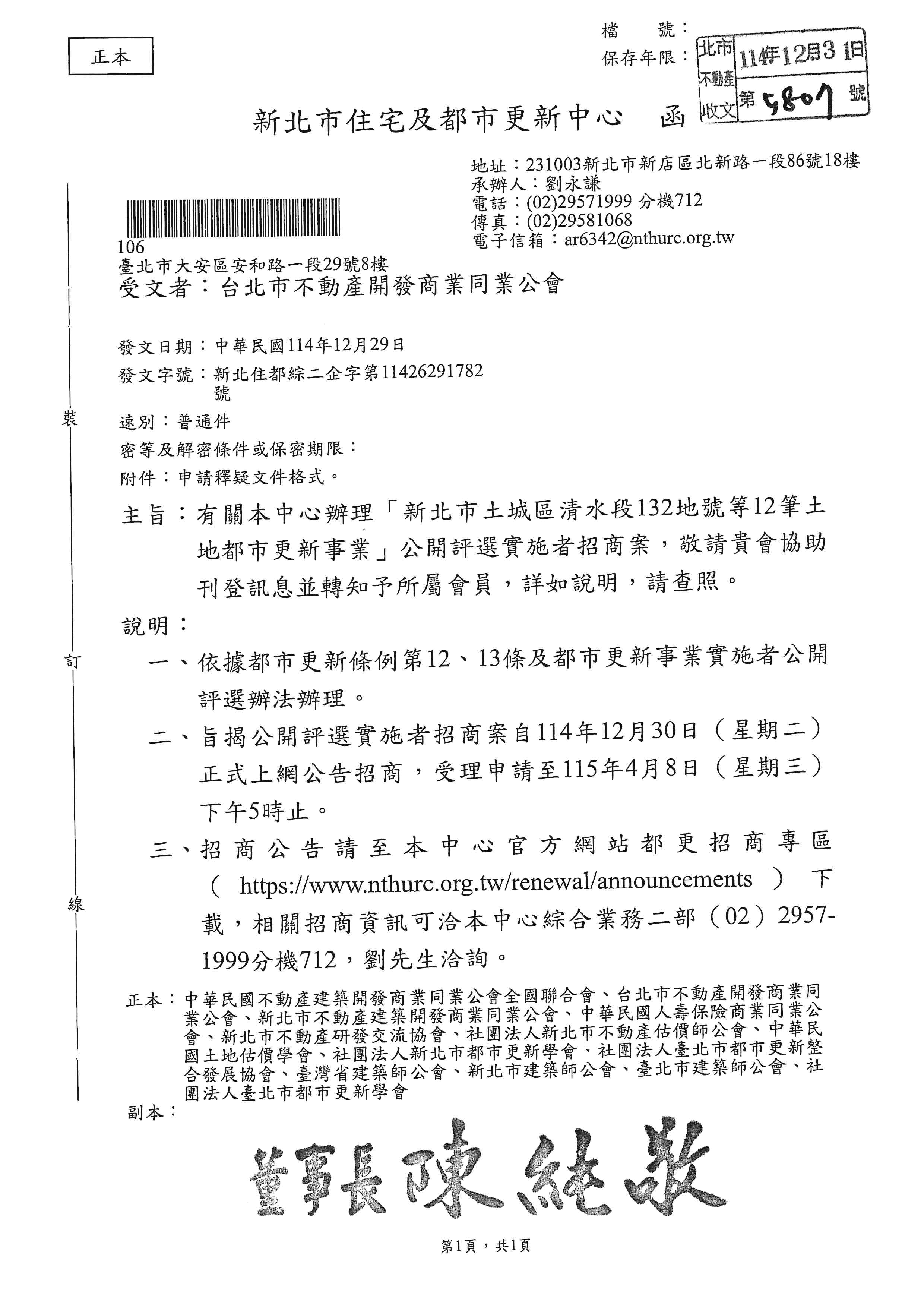 轉知新北市住宅及都市更新中心辦理「新北市土城區清水段132地號等12筆土地都市更新事業」公開評選實施者招商案