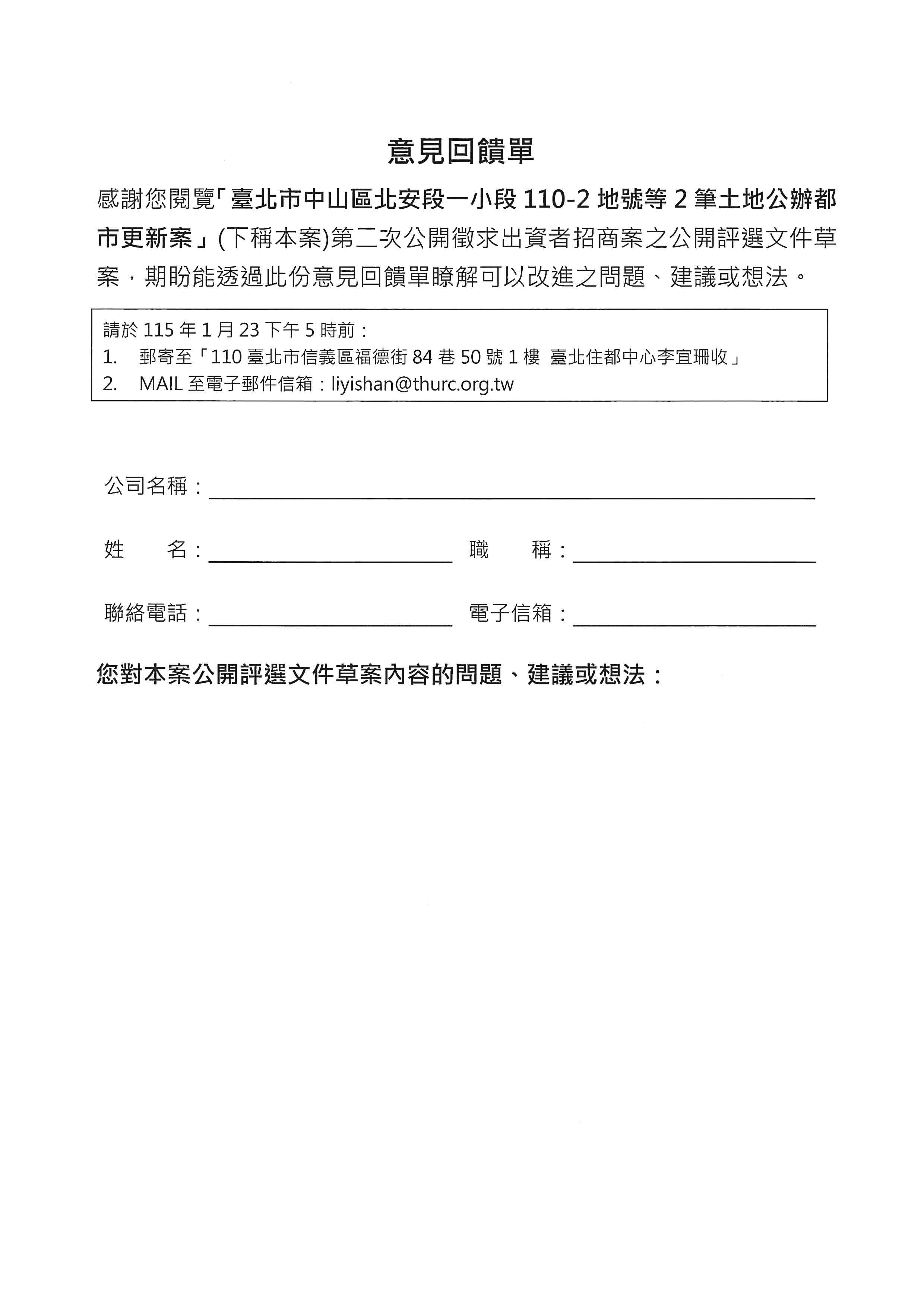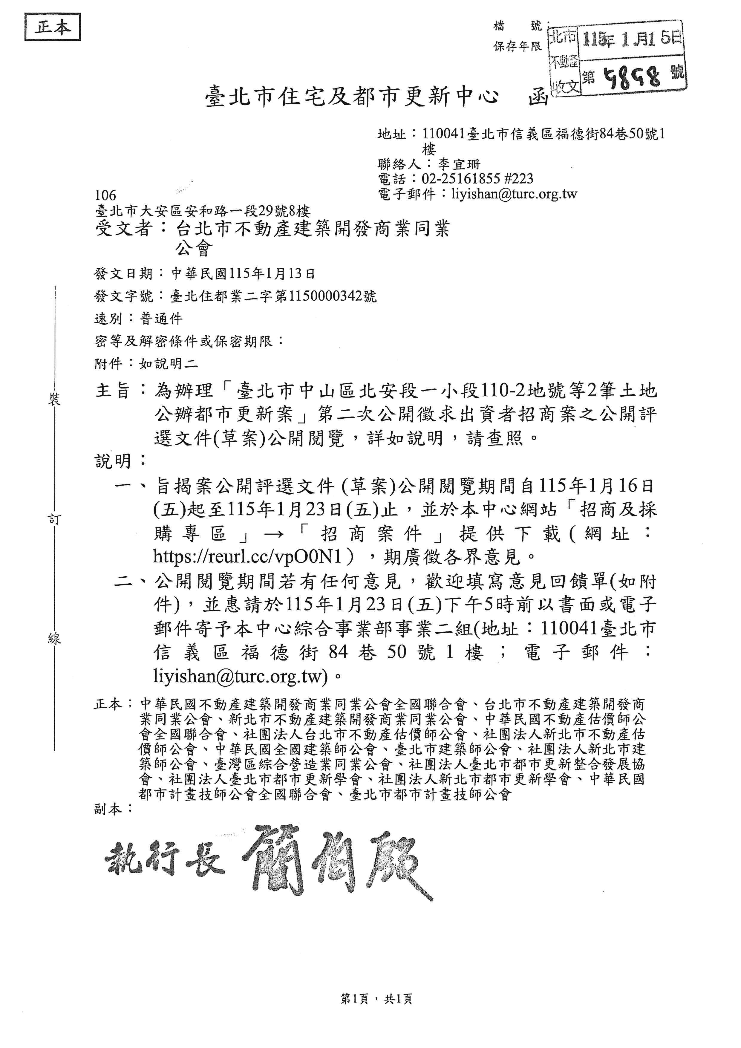 轉知臺北市住宅及都市更新中心辦理「臺北市中山區北安段一小段110-2地號等2筆土地公辦都市更新案」第二次公開徵求出資者招商案之公開評選文件(草案)公開閱覽