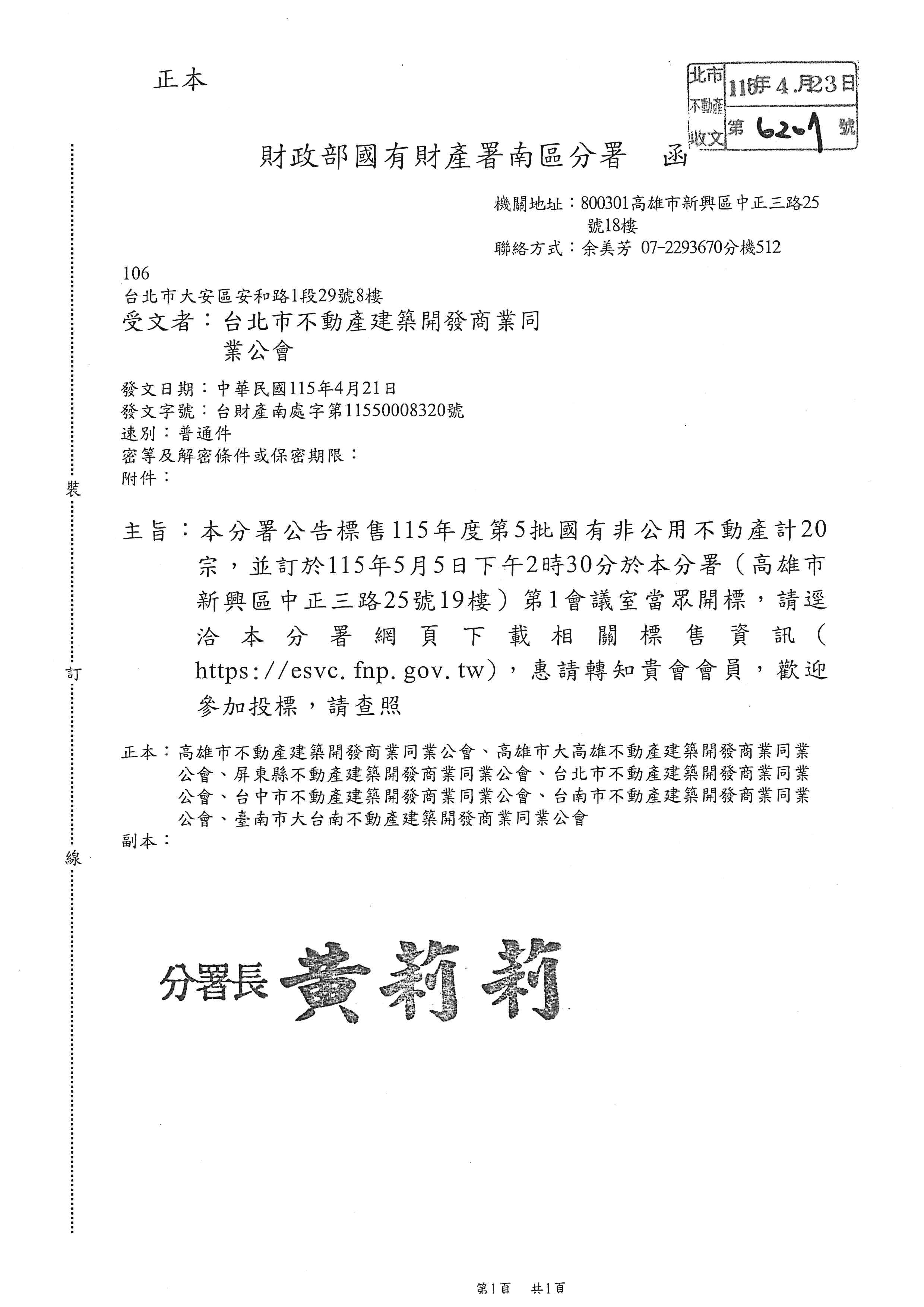財政部國有財產署南區分署公告標售115年度第5批國有非公用不動產計20宗,並訂於115年5月5日下午2時30分於該分署(高雄市新興區中正三路25號19樓)第1會議室當眾開標,請逕洽該分署網頁下載相關標售資訊(https://esvc.fnp.gov.tw),轉知會員參加投標,請查照。